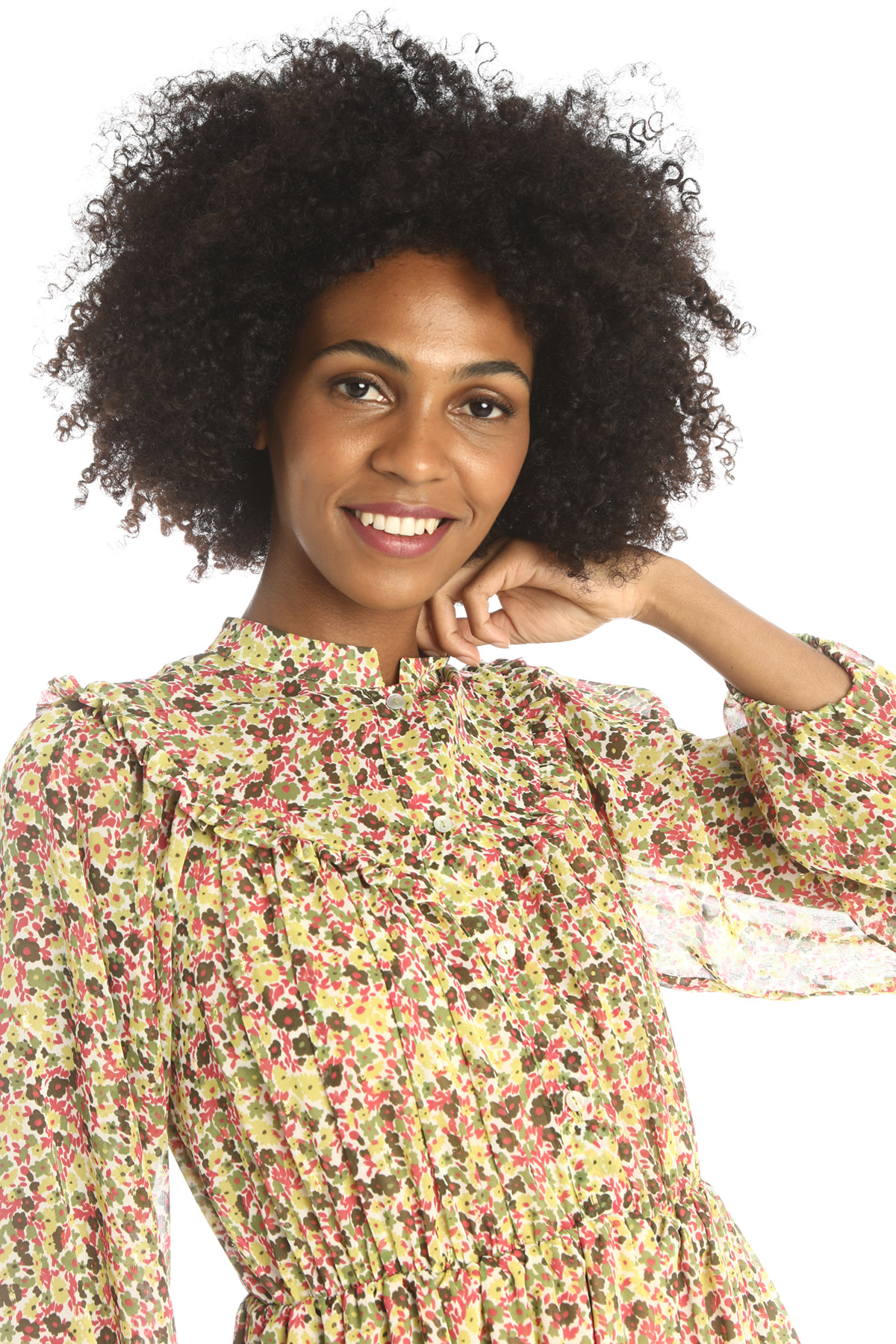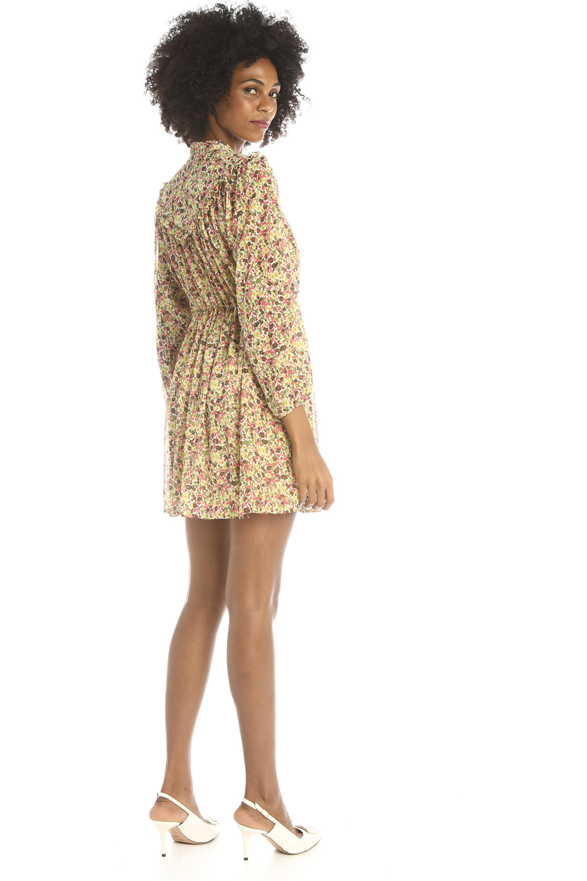 Abito dalla linea fluida realizzato in georgette fil coupè stampata, con collo a listino, maniche lunghe, inserto elastico al fondo manica e in vita, motivo di rouches al petto e allacciatura tramite bottoni. Capo semifoderato.