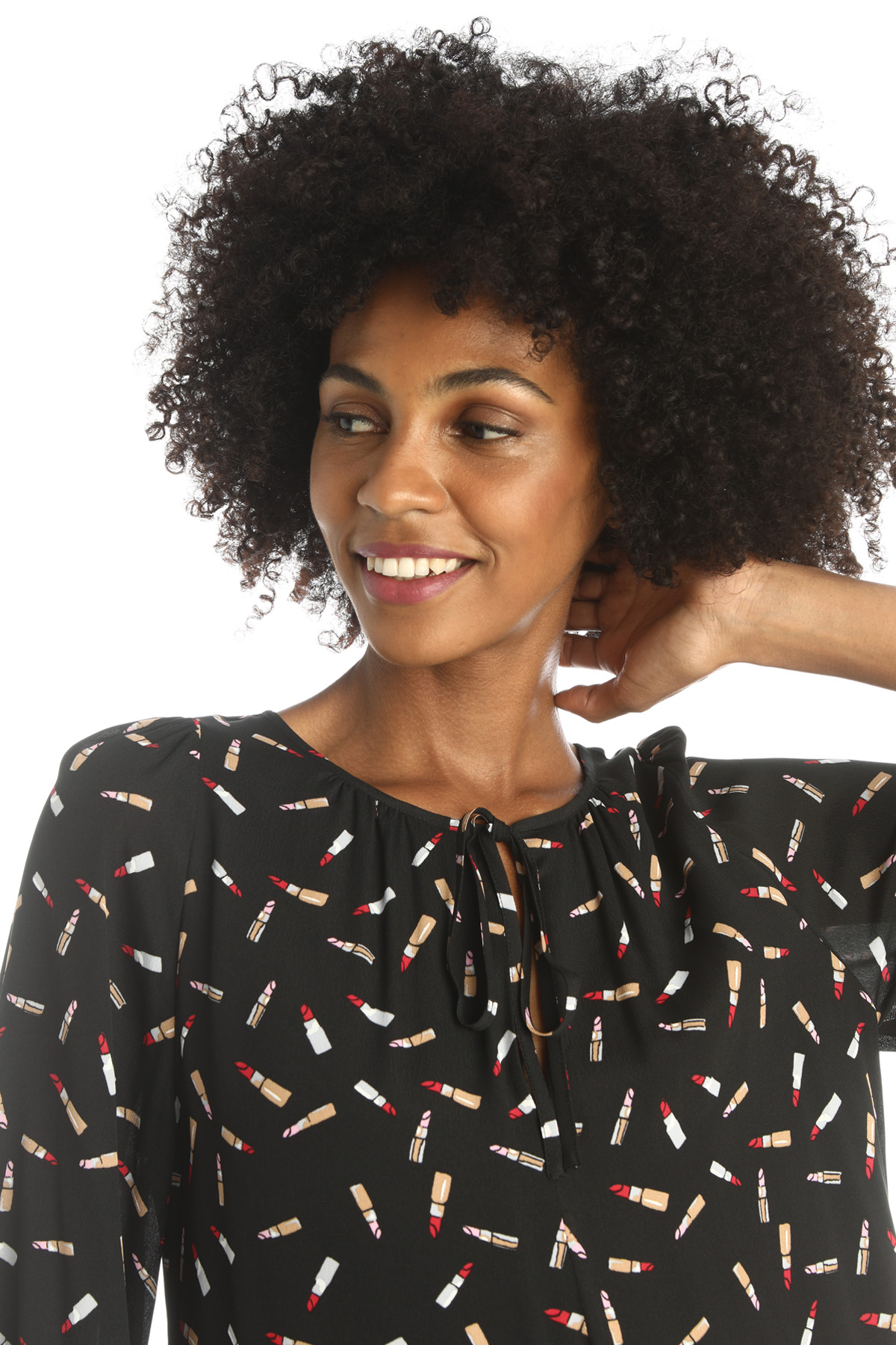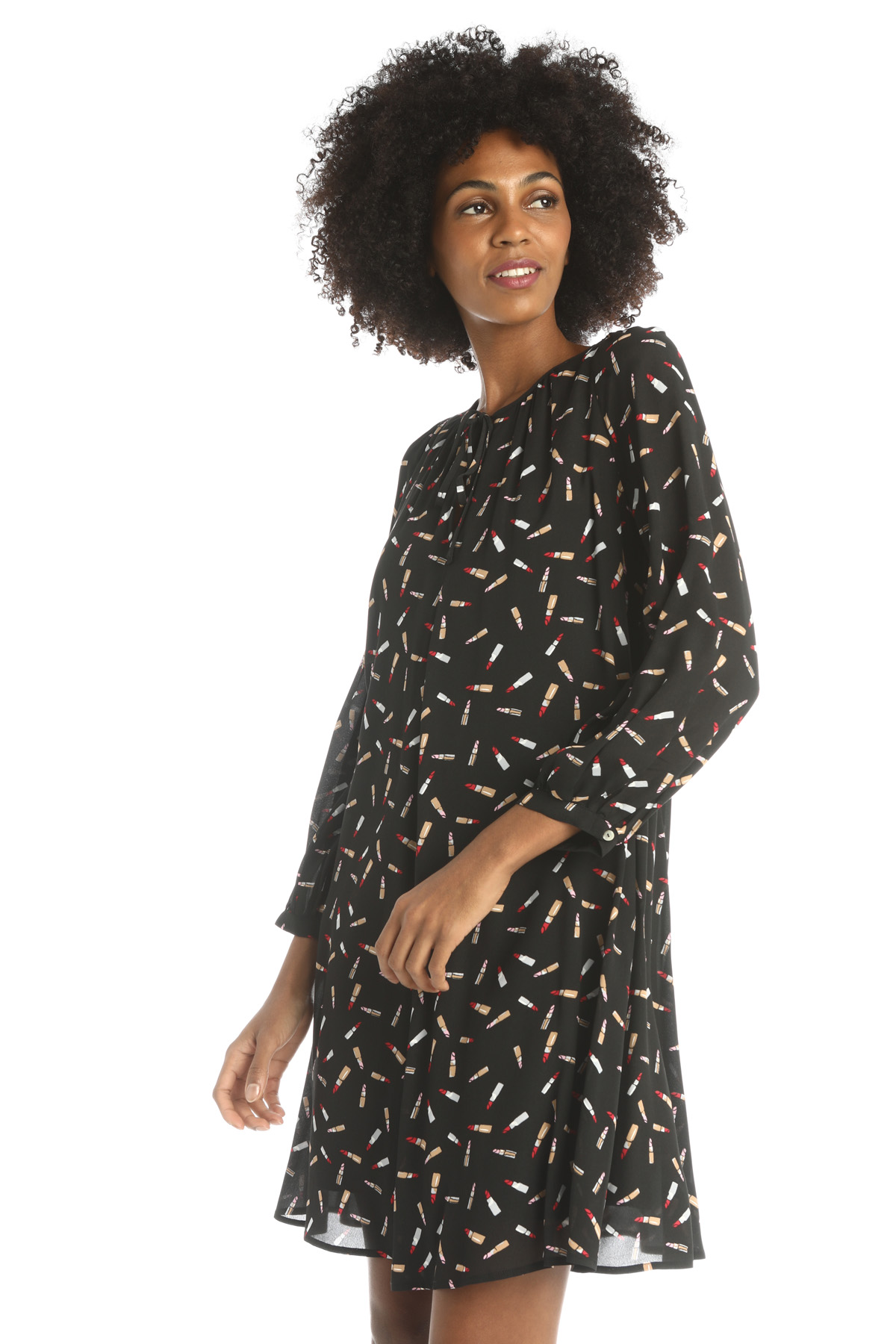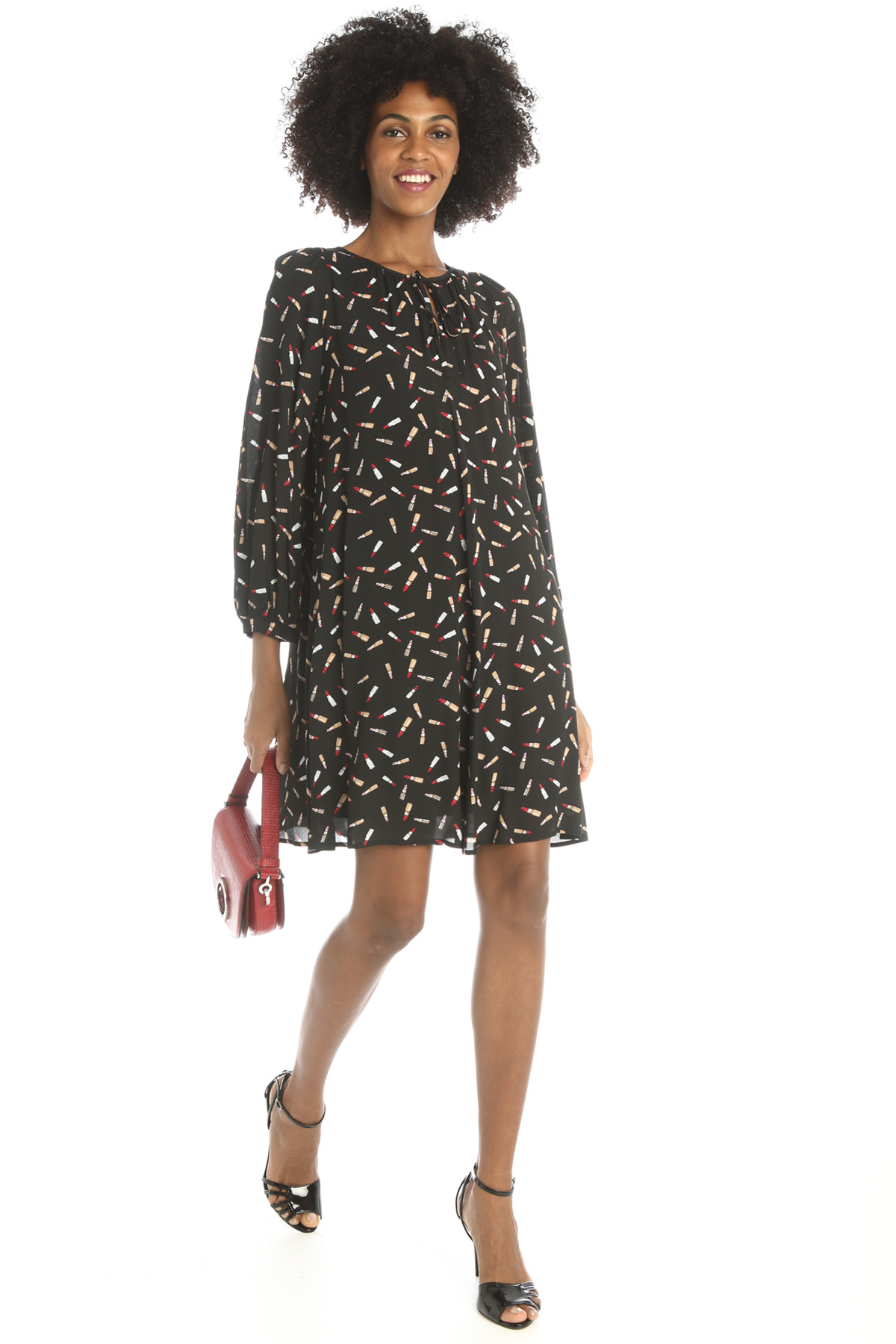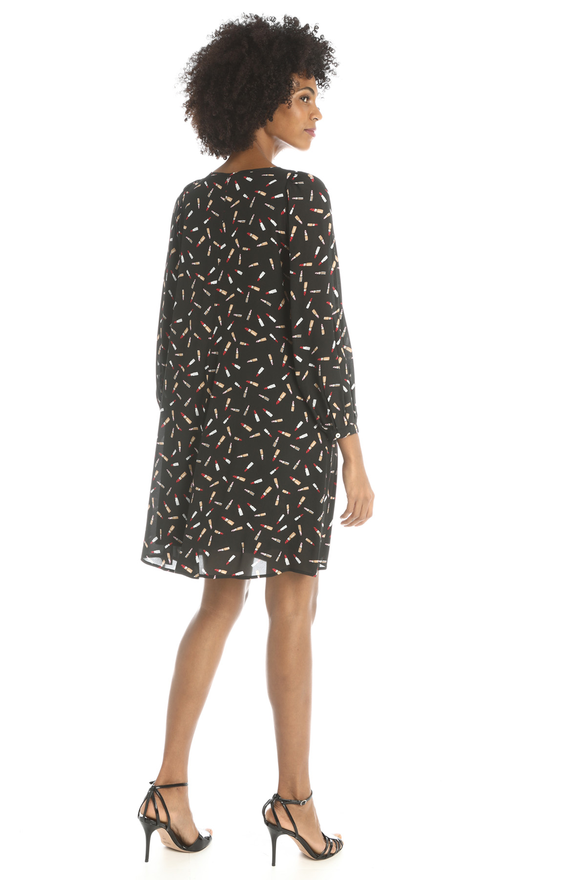 Abito dalla linea fluida realizzato in crepé di pura viscosa stampato, con collo a foulard e apertura a goccia, maniche lunghe con polsino sottile e bottone. Capo semifoderato.