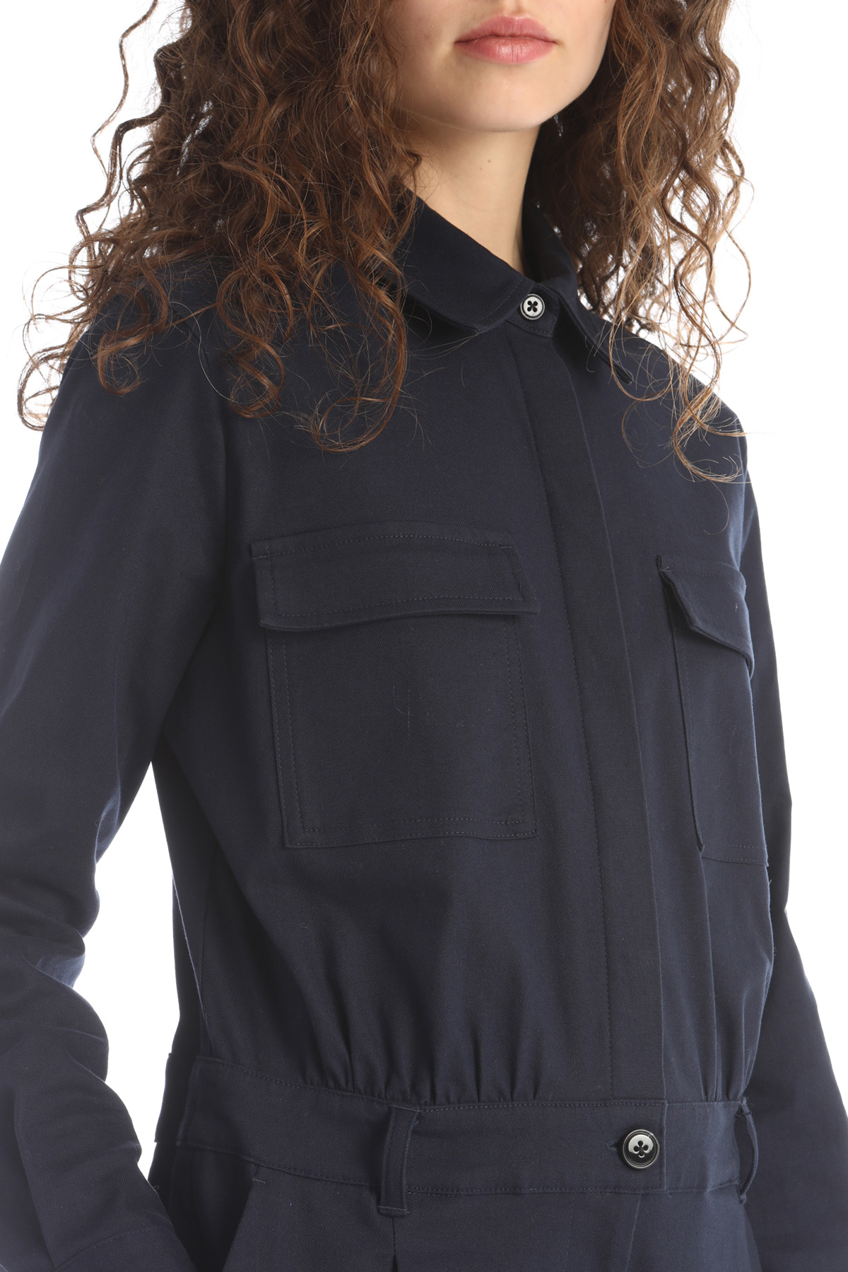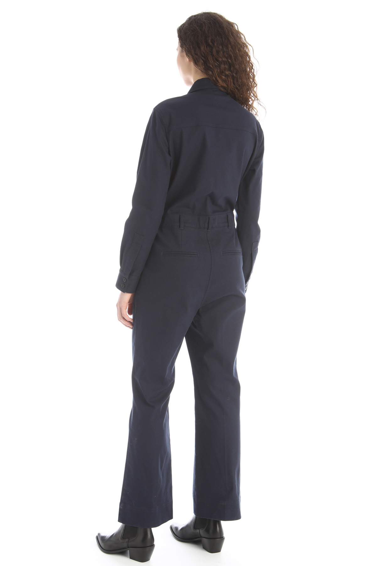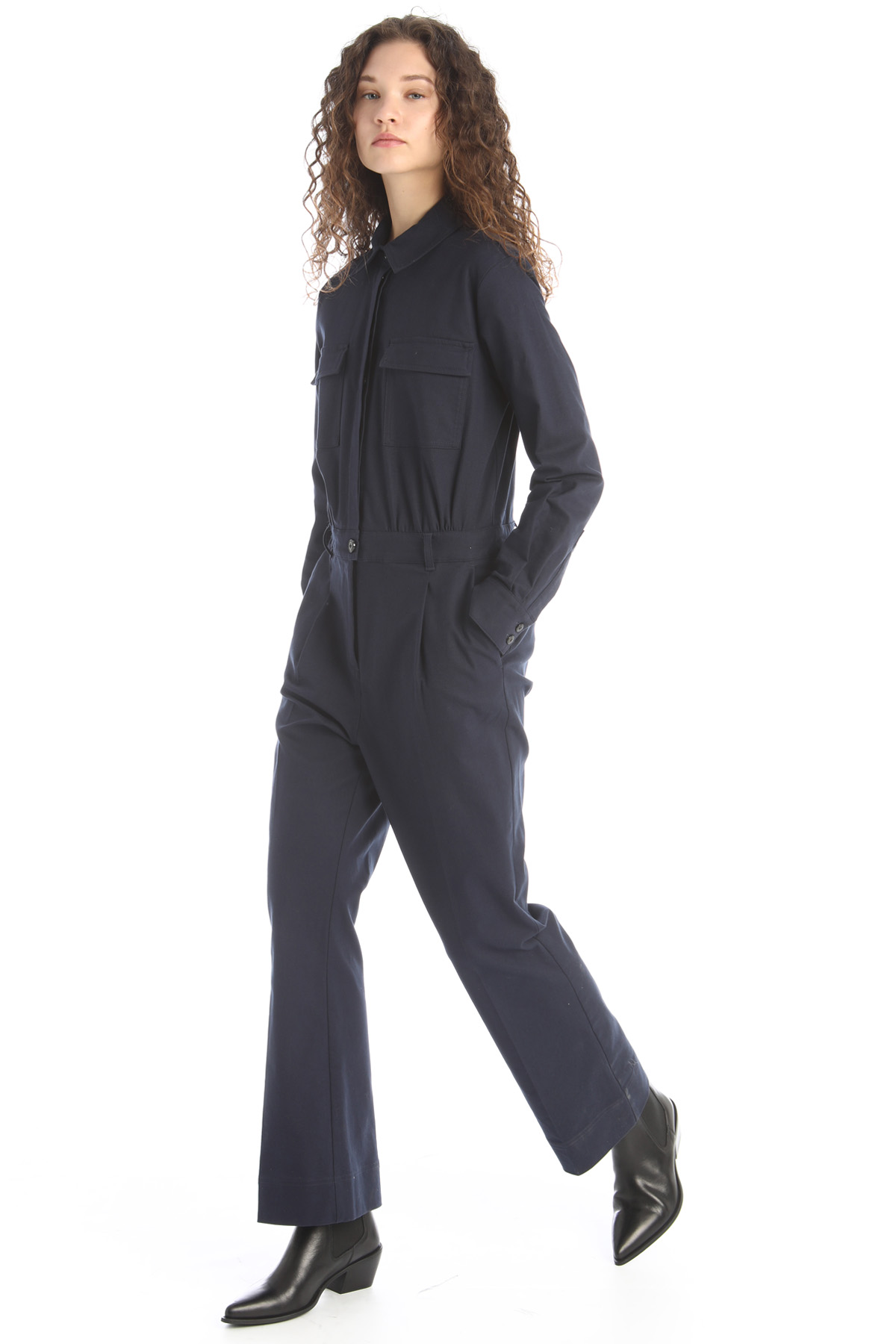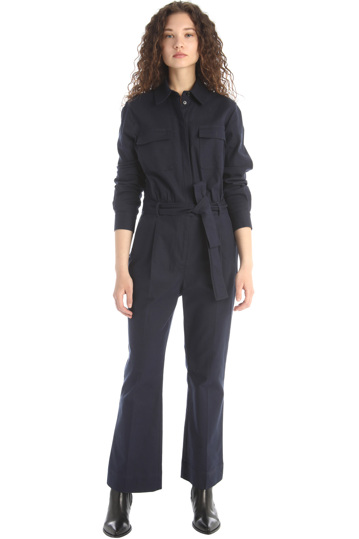 Tuta dalla linea dritta realizzata in tessuto di misto cotone e viscosa stretch, con colletto a camicia, maniche lunghe con polsino e bottoni, taschini applicati con patta sul petto, passanti in vita, tasche alla francese e allacciatura tramite bottoni a vista e cintura coordinata.