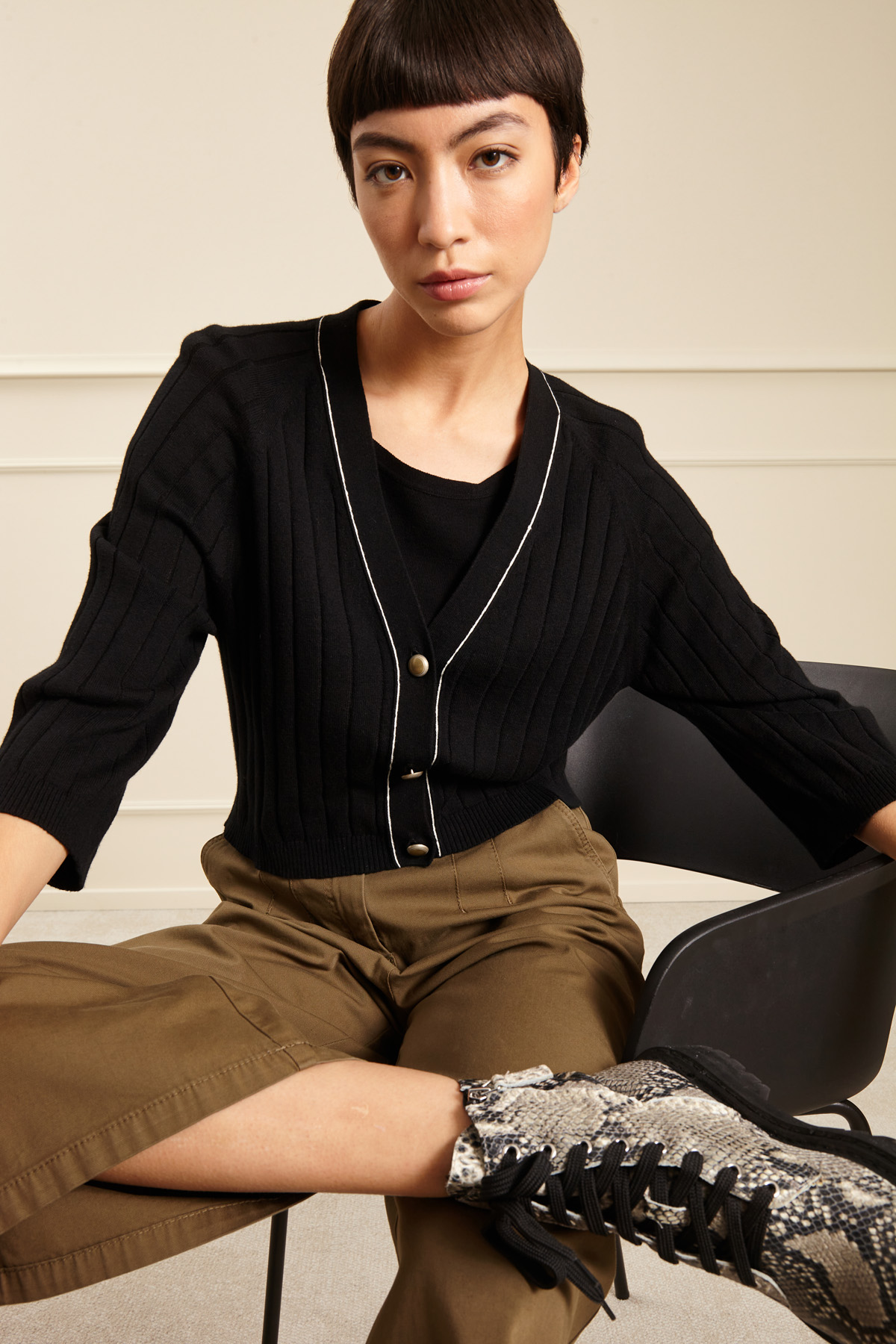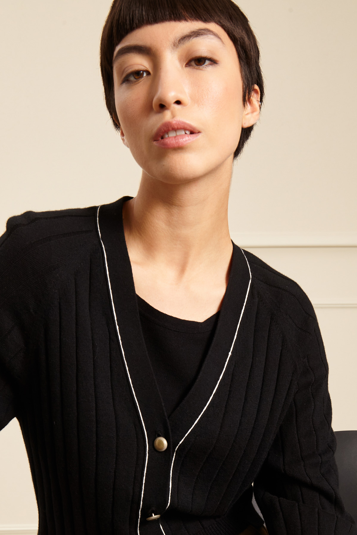 Cardigan corto dalla linea semiaderente realizzato in filato di cotone e cashmere con lavorazione a coste, scollo a V, maniche tre quarti raglan e allacciatura tramite bottoni metallici.