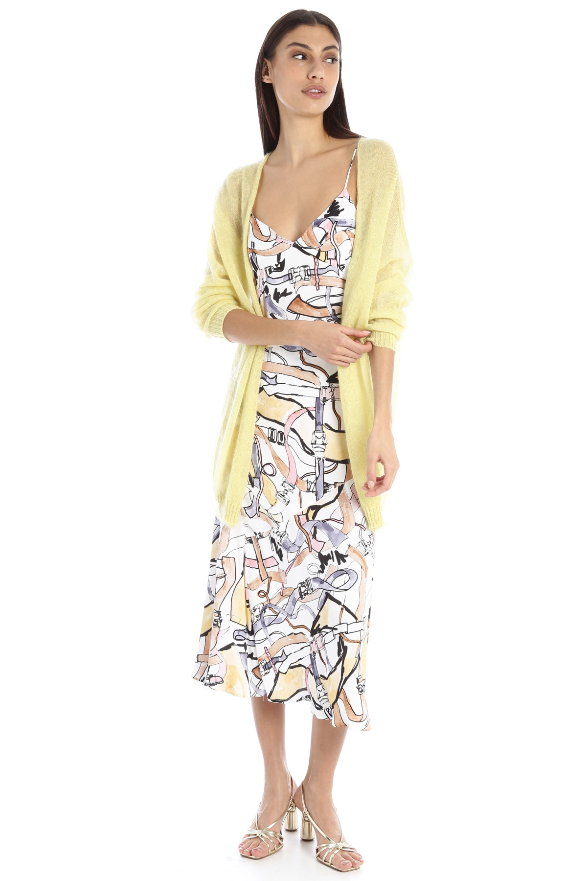 Cardigan dalla linea morbida realizzato in filato di misto mohair lamè, con maniche lunghe dal giro sceso e bordi riniti a coste.