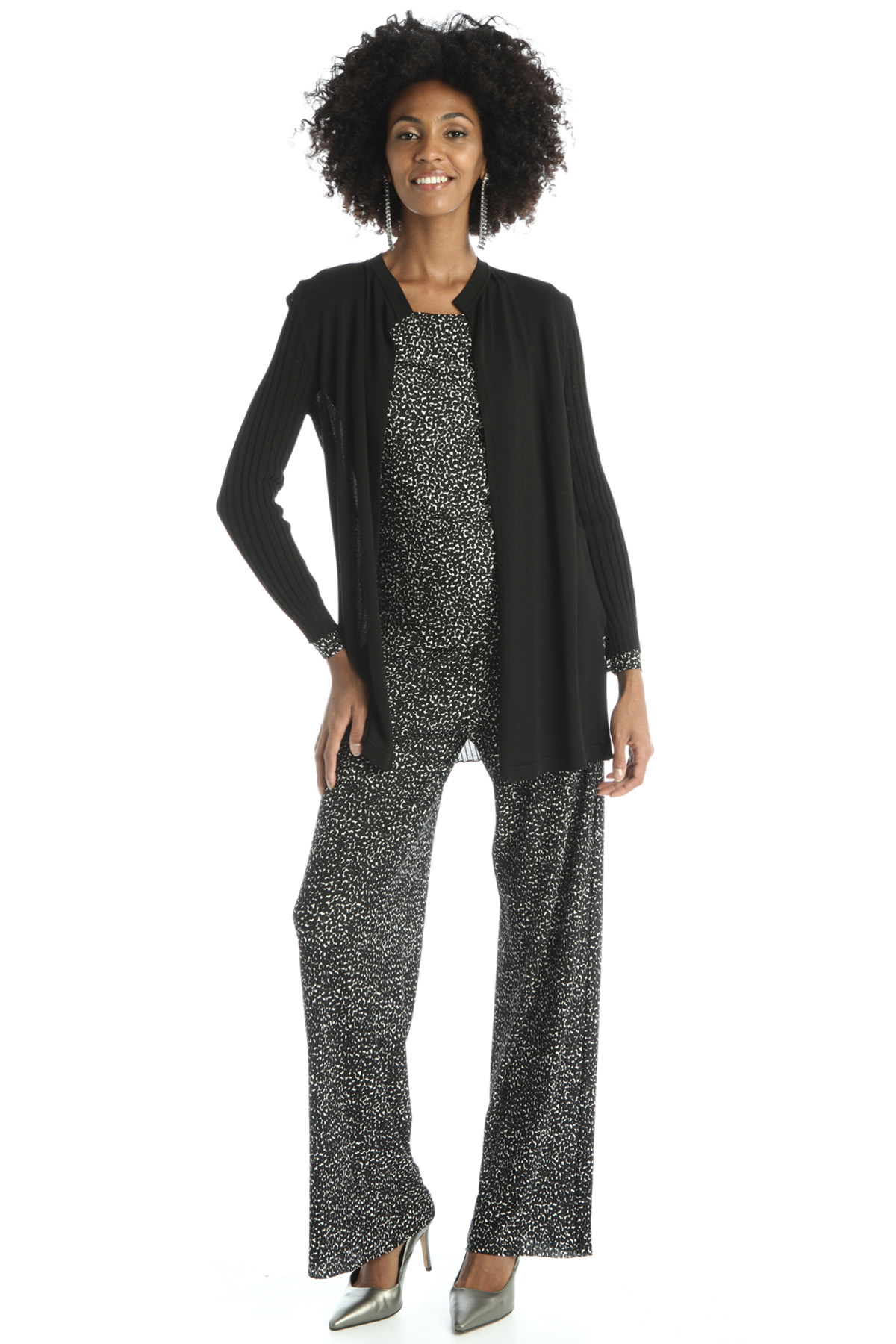 Cardigan dalla linea morbida realizzato in filato di misto viscosa, con lavorazione a coste sulle maniche e nel retro, scollo a giro, spacchi laterali e fondo asimmetrico.