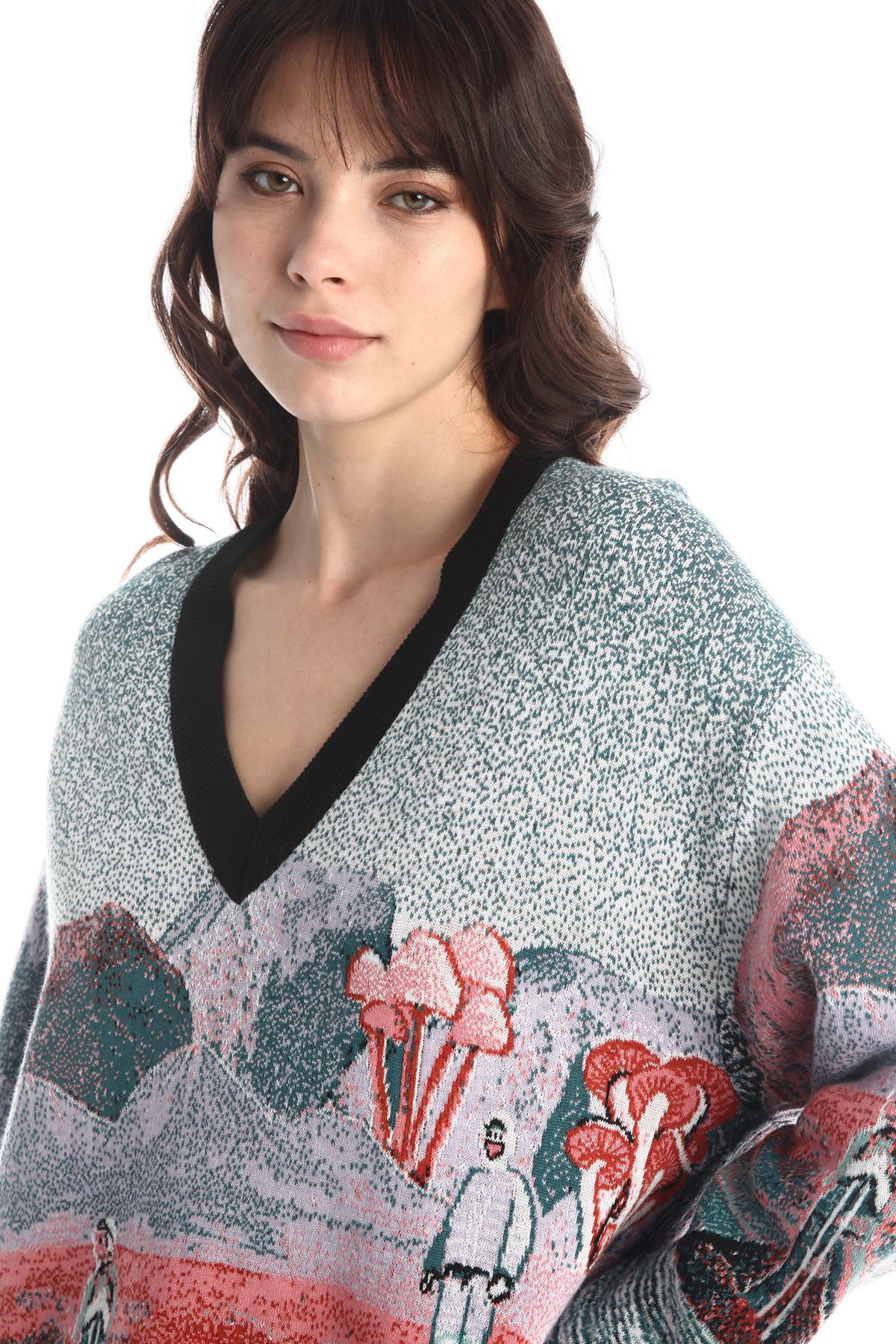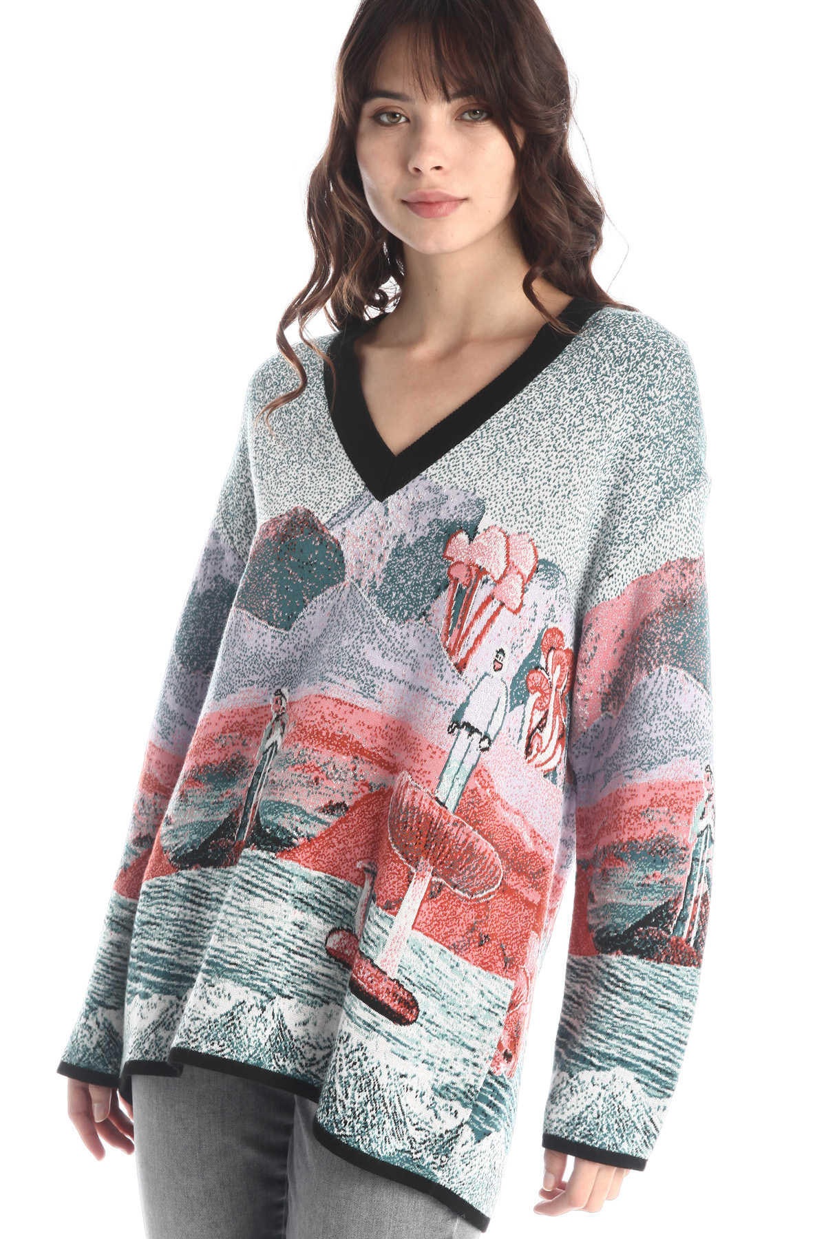 Maglia dalla linea over realizzata in filato di misto lana tinto filo, con scollo a V e maniche lunghe da giro sceso.