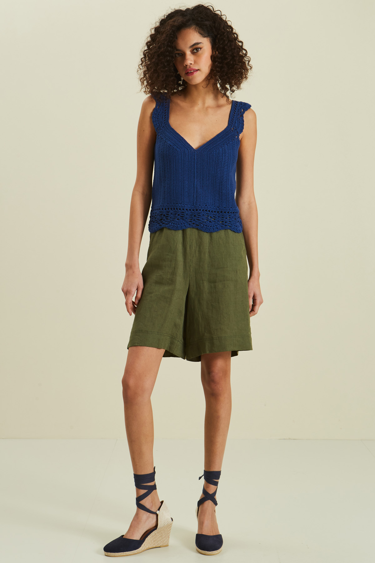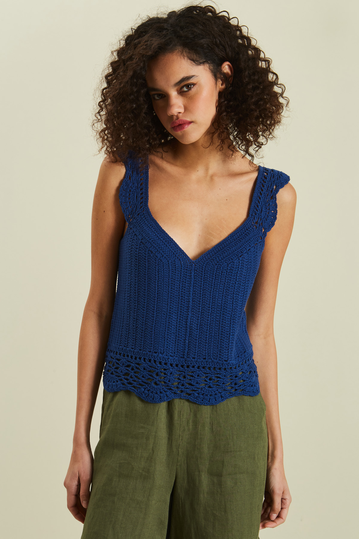 Top smanicato corto realizzato in maglia di misto cotone con lavorazione macramè, scollo a V, spalline spesse e profili rifiniti a cappetta.