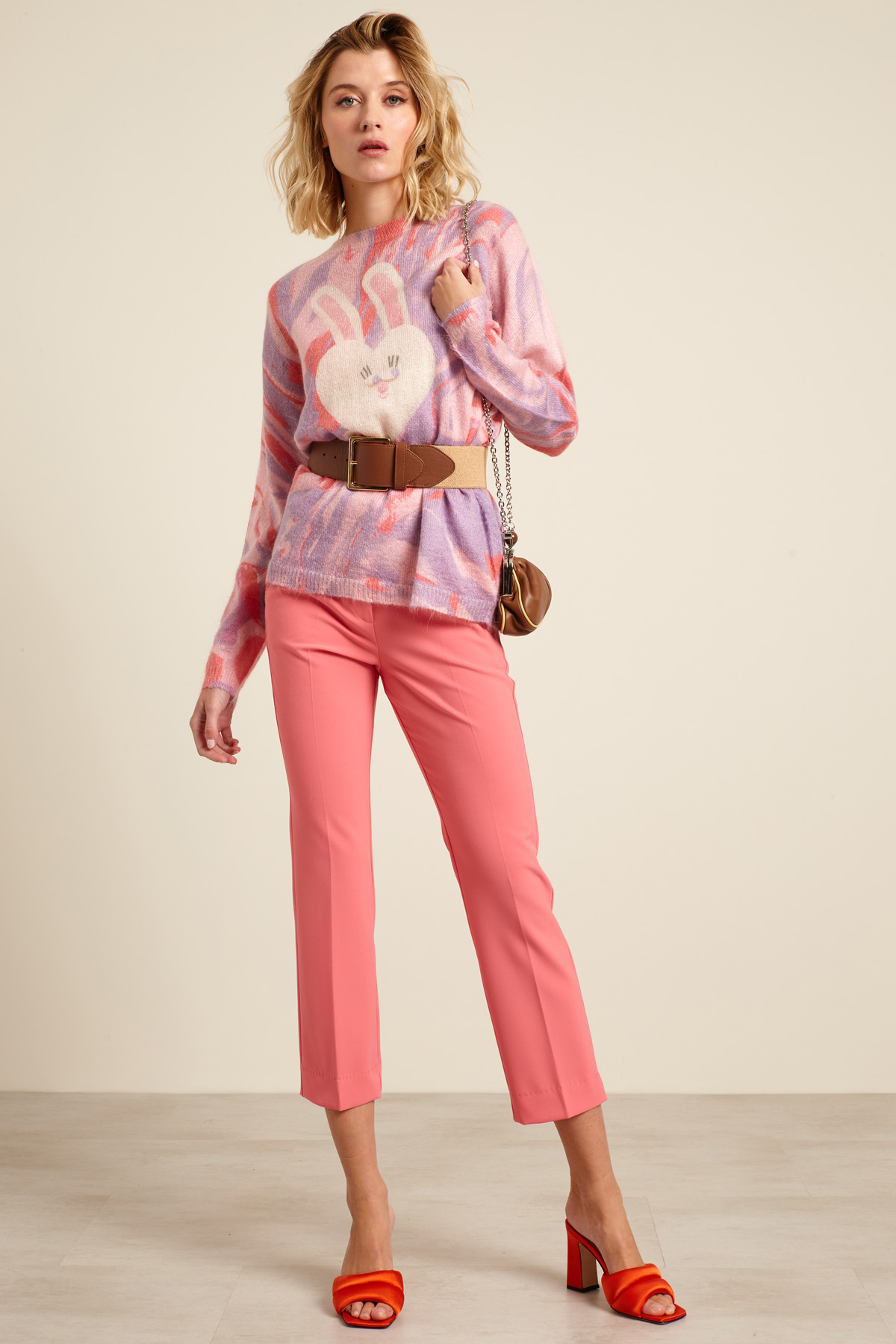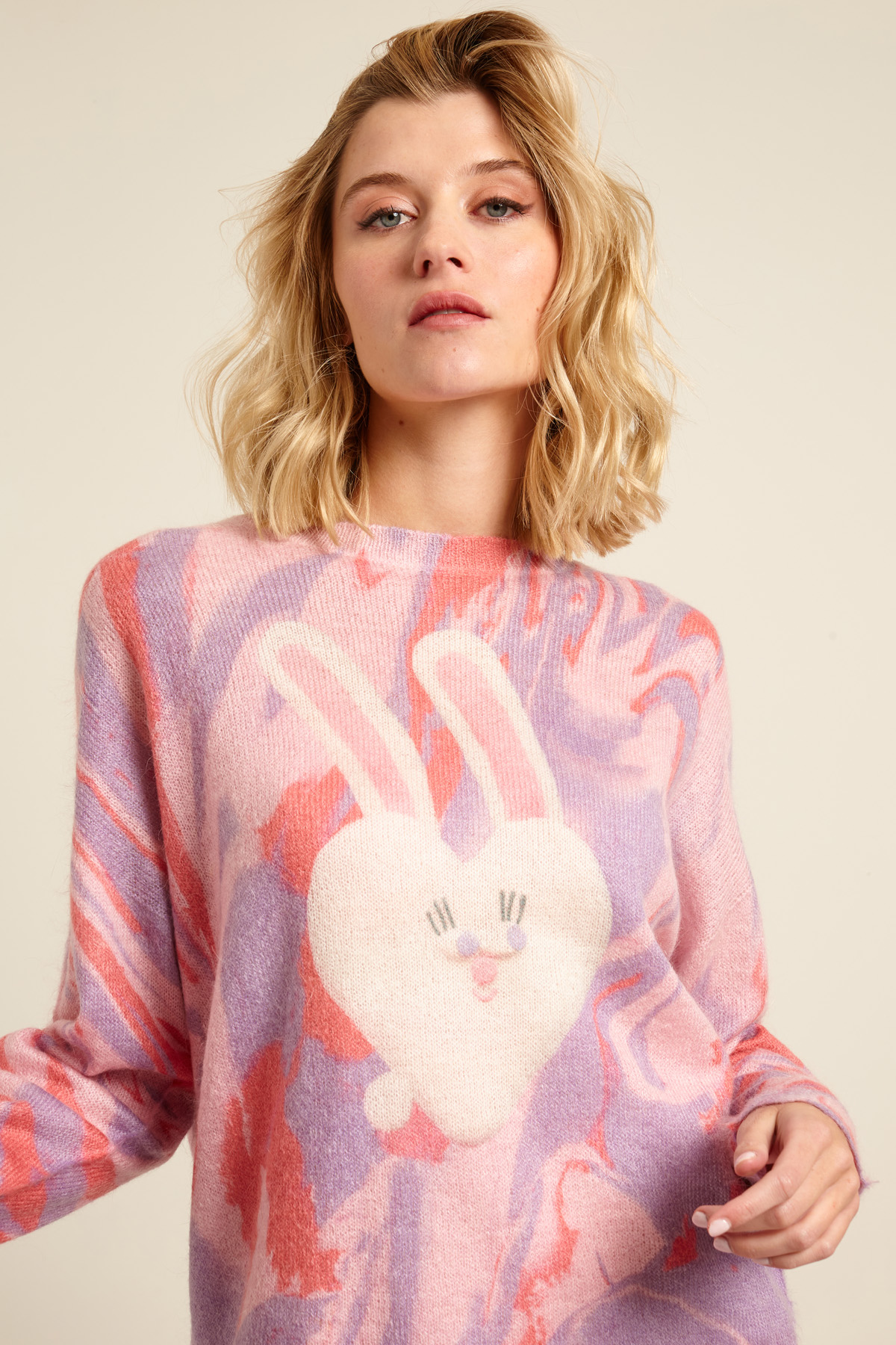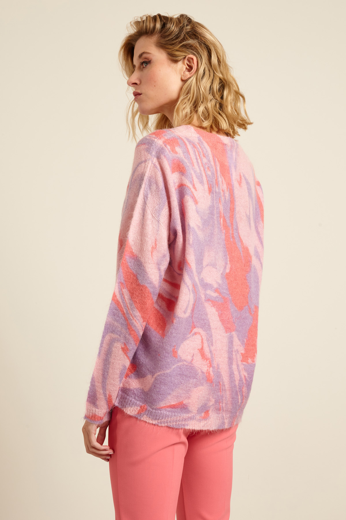 Maglia dalla linea morbida realizzata in filato di misto mohair stampato, con scollo a giro, maniche lunghe dal giro sceso e profili rifiniti a coste.