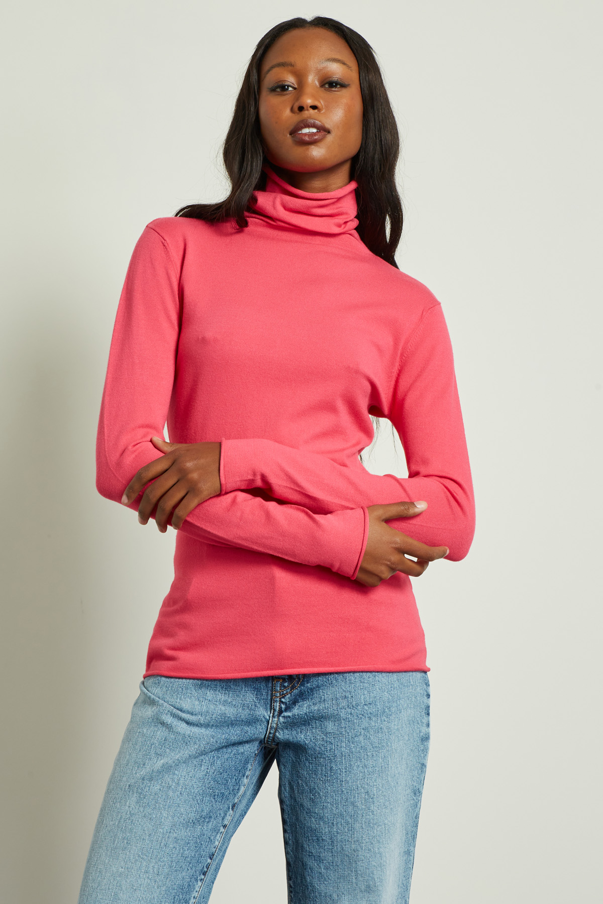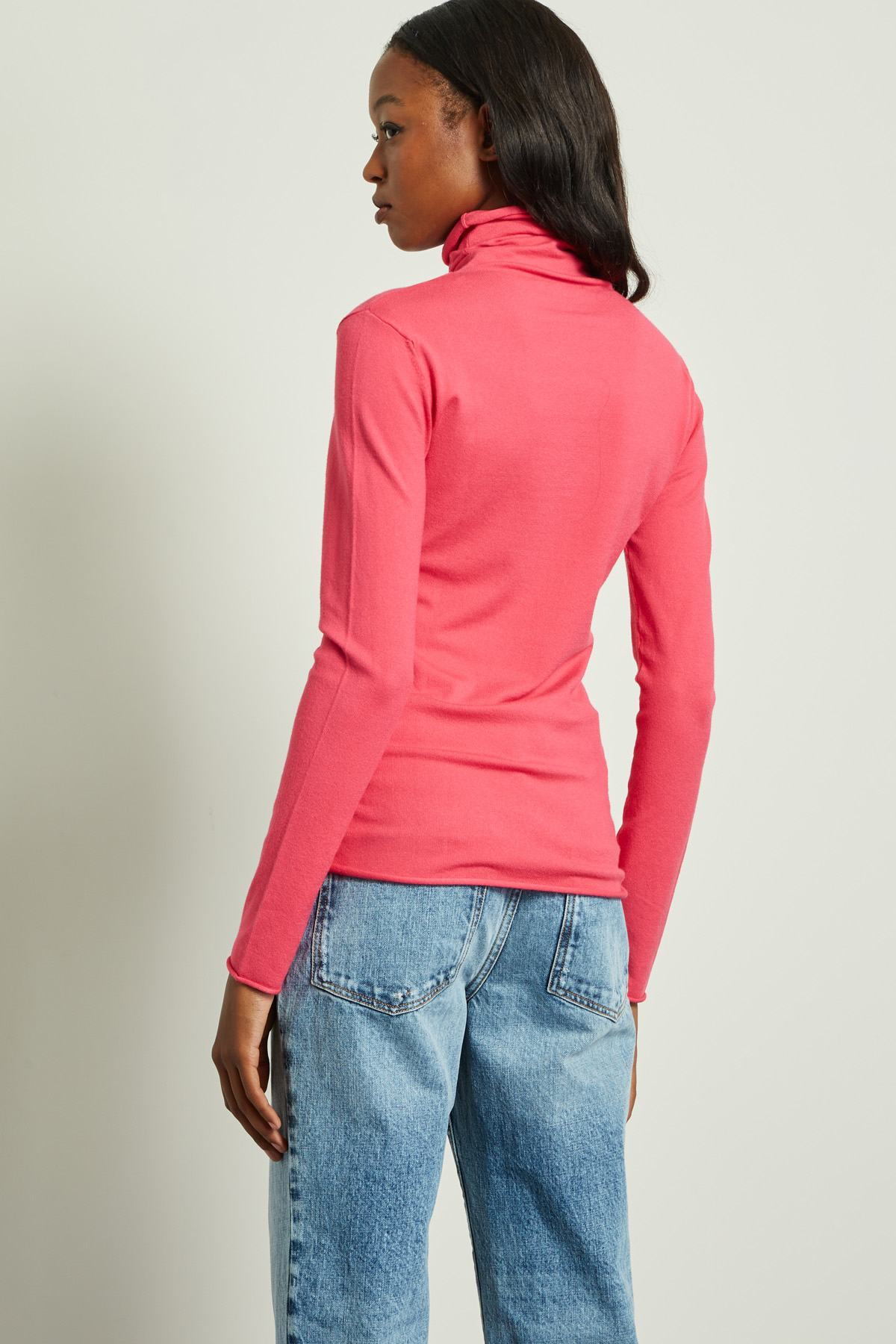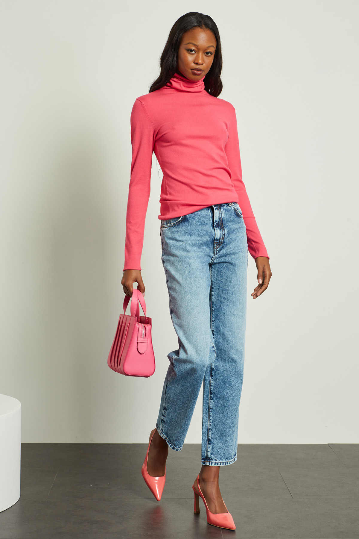 Dolcevita dalla linea aderente realizzato in filato di misto viscosa stretch, con collo alto morbido e maniche lunghe.