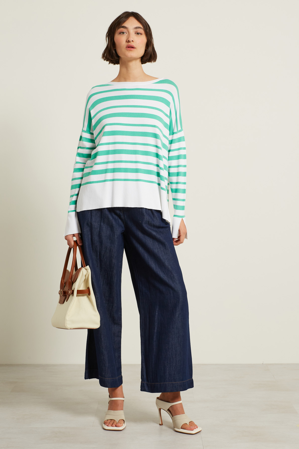 Maglia dalla linea morbida realizzata in filato di misto viscosa, con scollo rotondo, maniche lunghe dal giro sceso, spacchetti al fondo e profili rifiniti a coste.