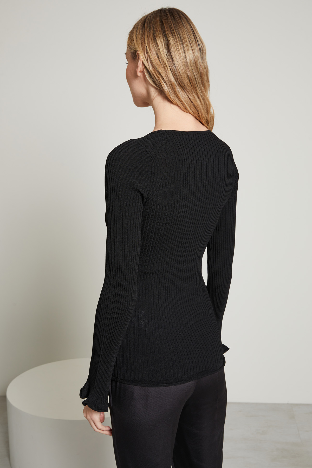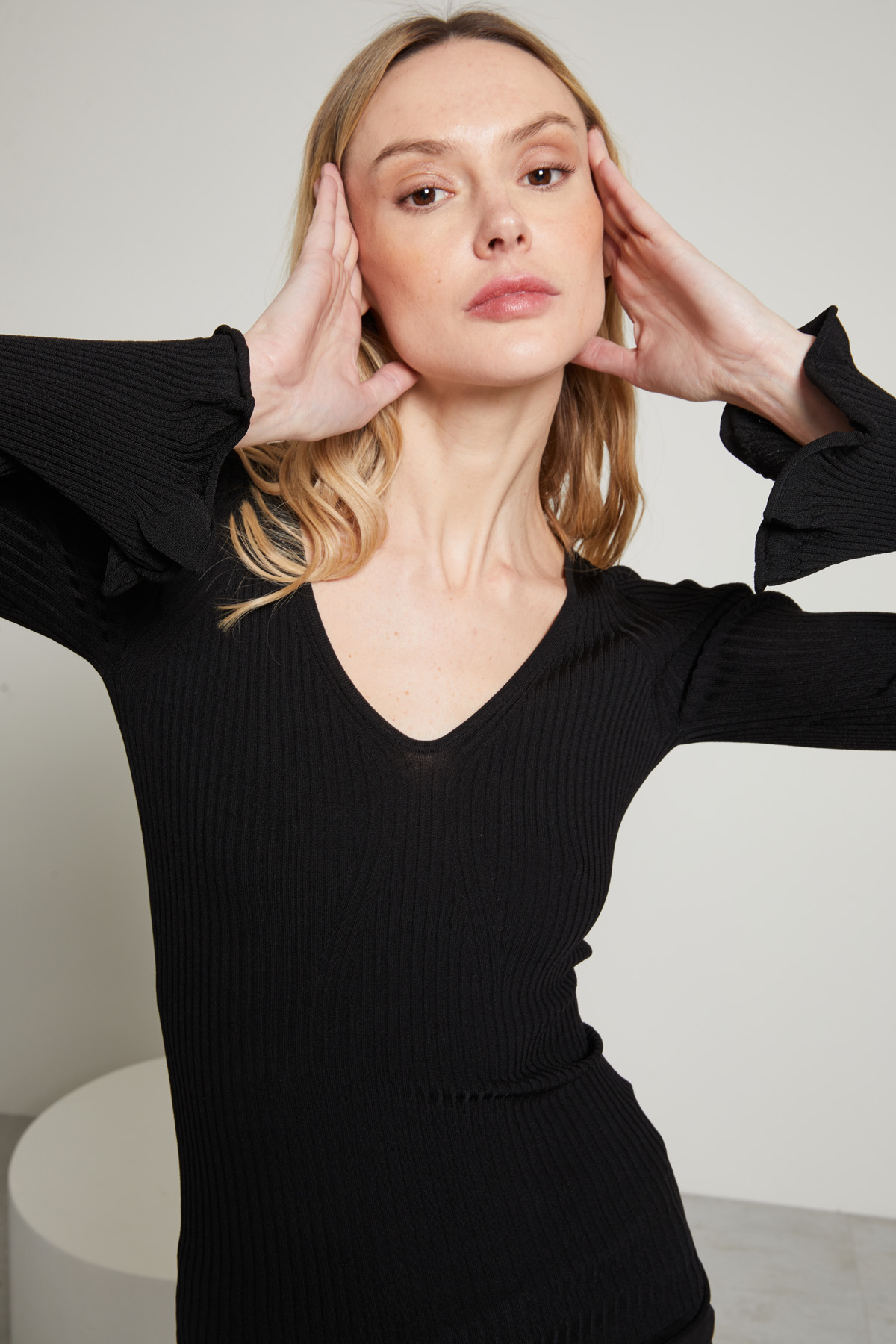 Maglia dalla linea aderente realizzata in filato di misto viscosa a coste, con scollo a V, maniche lunghe e bordi ondulati.