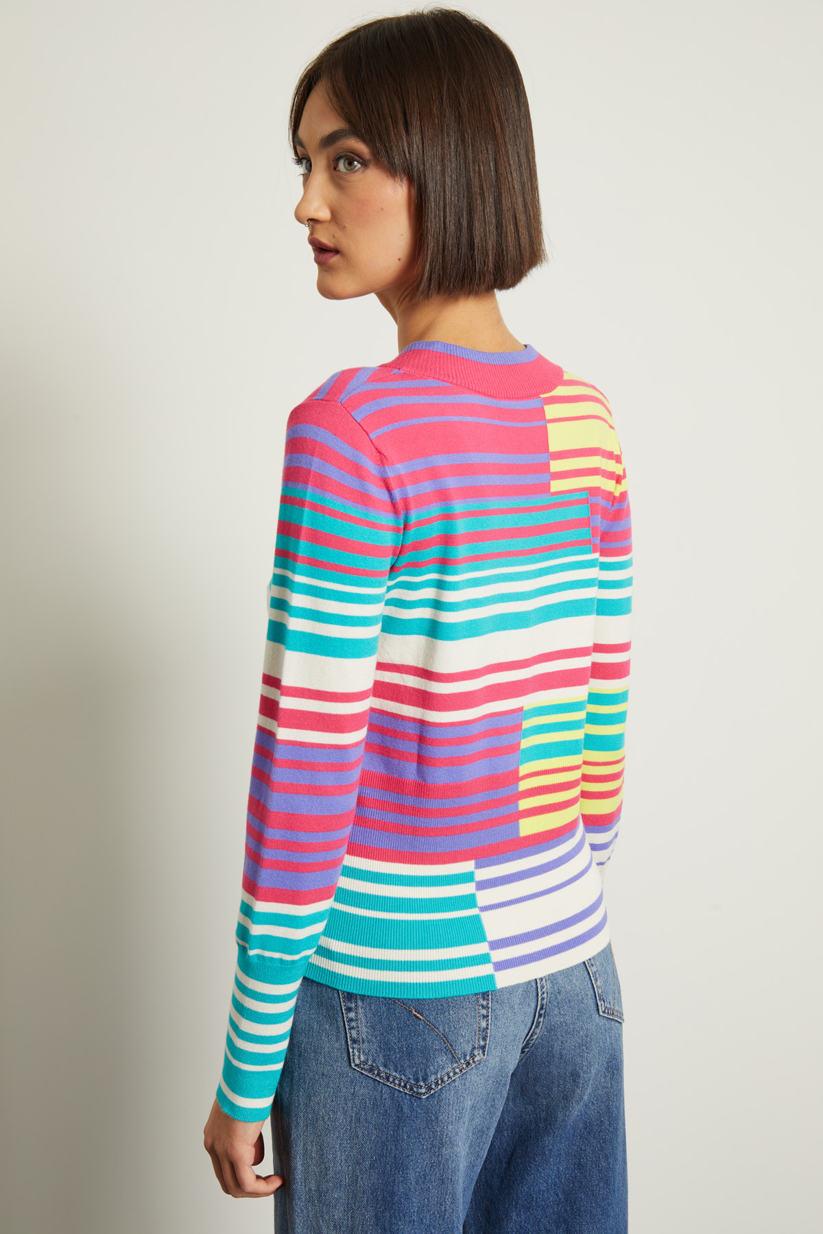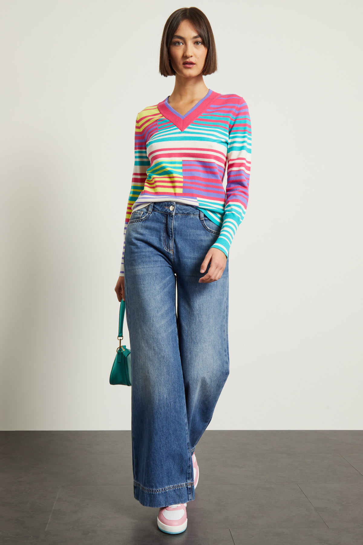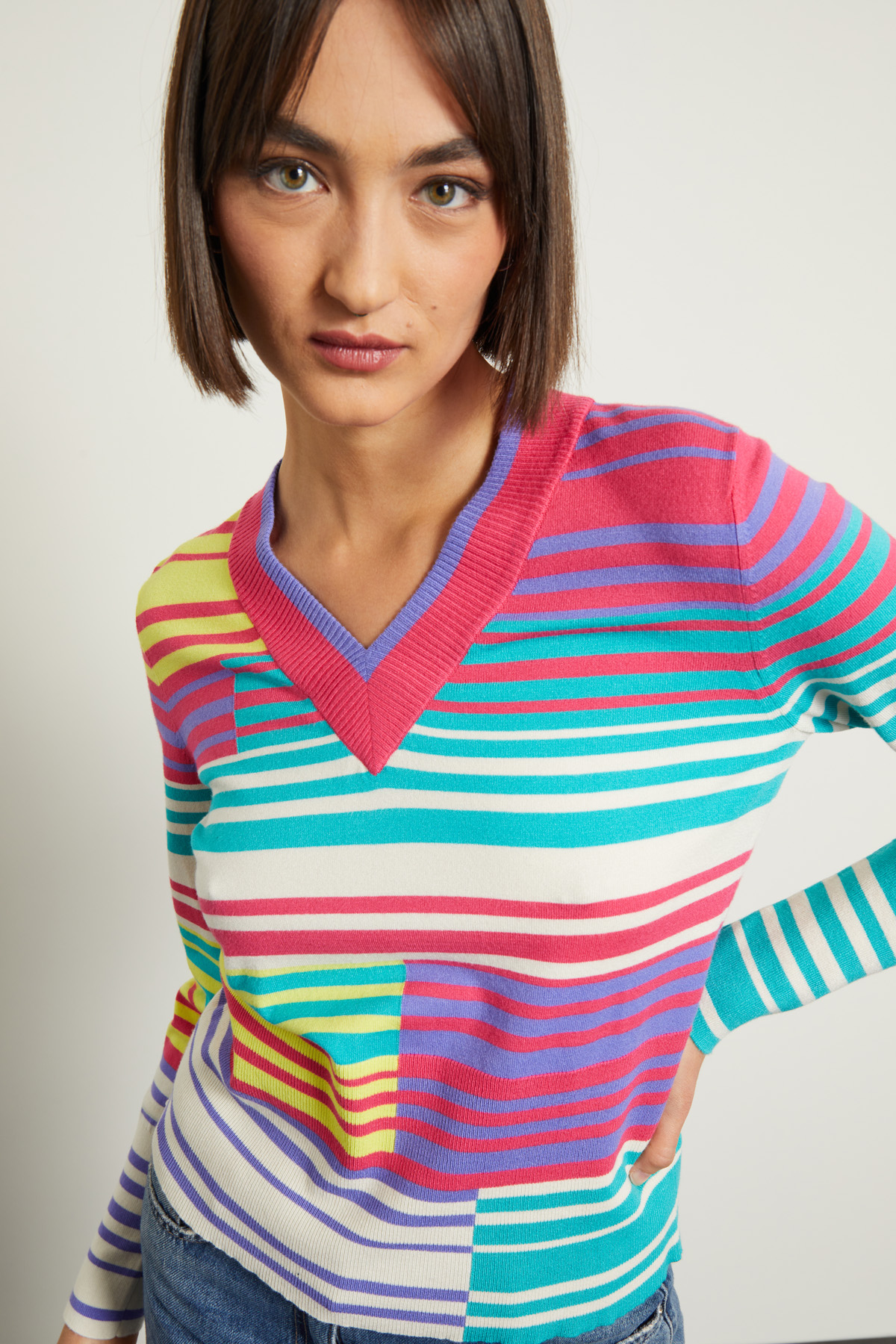 Maglia dalla linea dritta realizzata in filato di misto viscosa tinto filo, con scollo a V, maniche lunghe strette al fondo e profili rifiniti a coste.