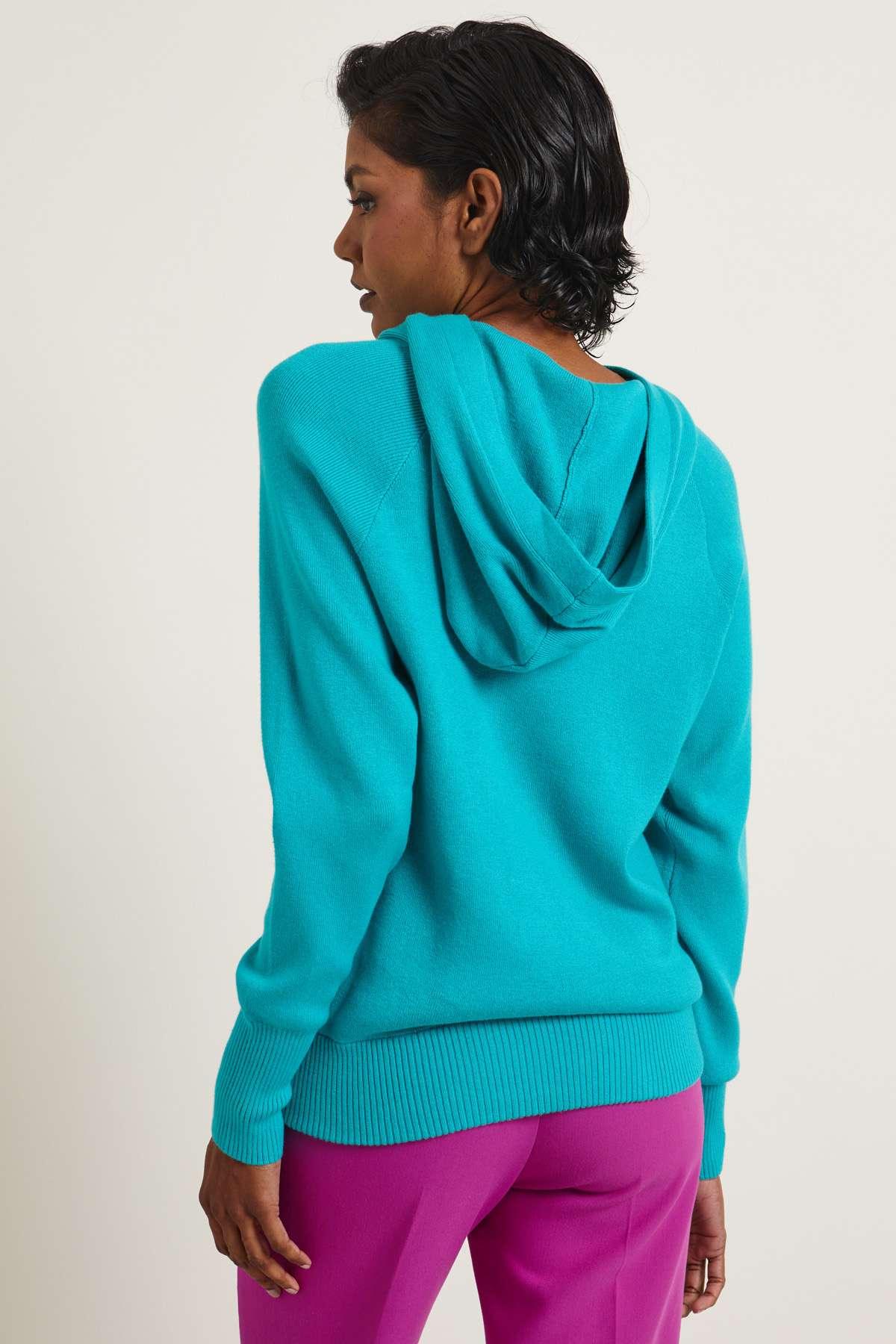 Maglia dalla linea morbida realizzata in filato di misto cotone e cashmere con cappuccio, maniche lunghe raglan e profili rifiniti a coste.