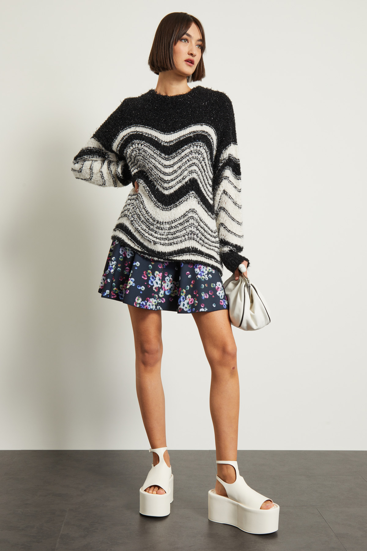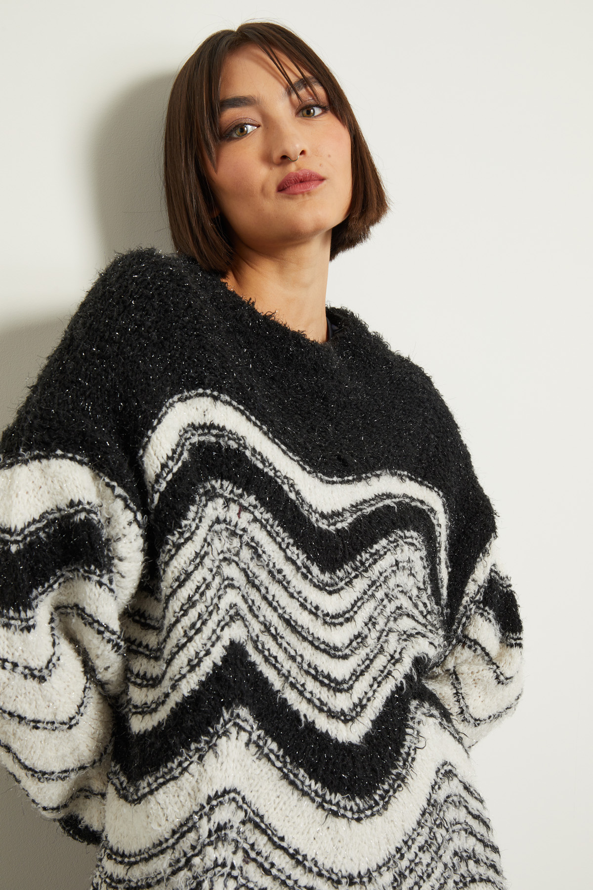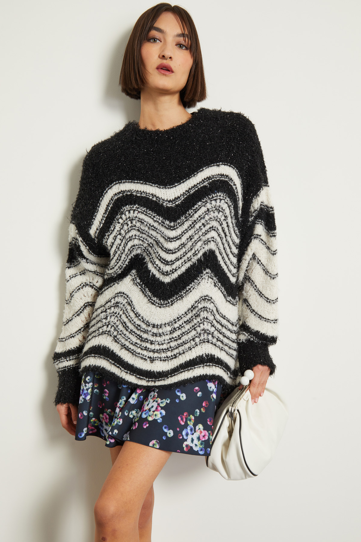 Maglia dalla linea over realizzata in filato di misto lana e alpaca tinto filo, con inserti lamè, scollo a giro e maniche lunghe dal giro sceso.