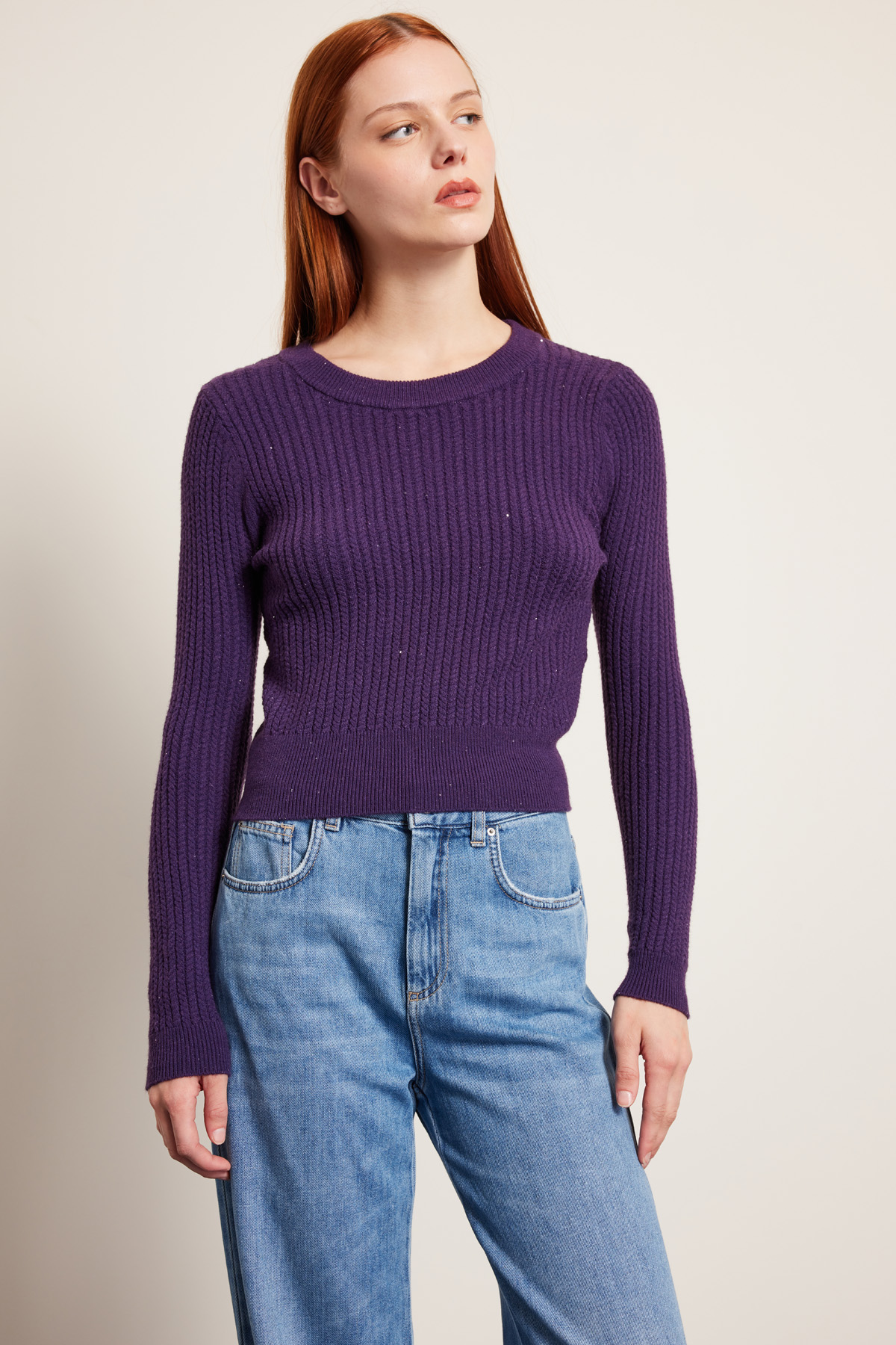 Maglia dalla linea aderente realizzata in filato di misto viscosa a trecce, con motivo di micro paillettes ricamate, scollo a giro, maniche lunghe, dettaglio cut out nel retro e profili rifiniti a coste.