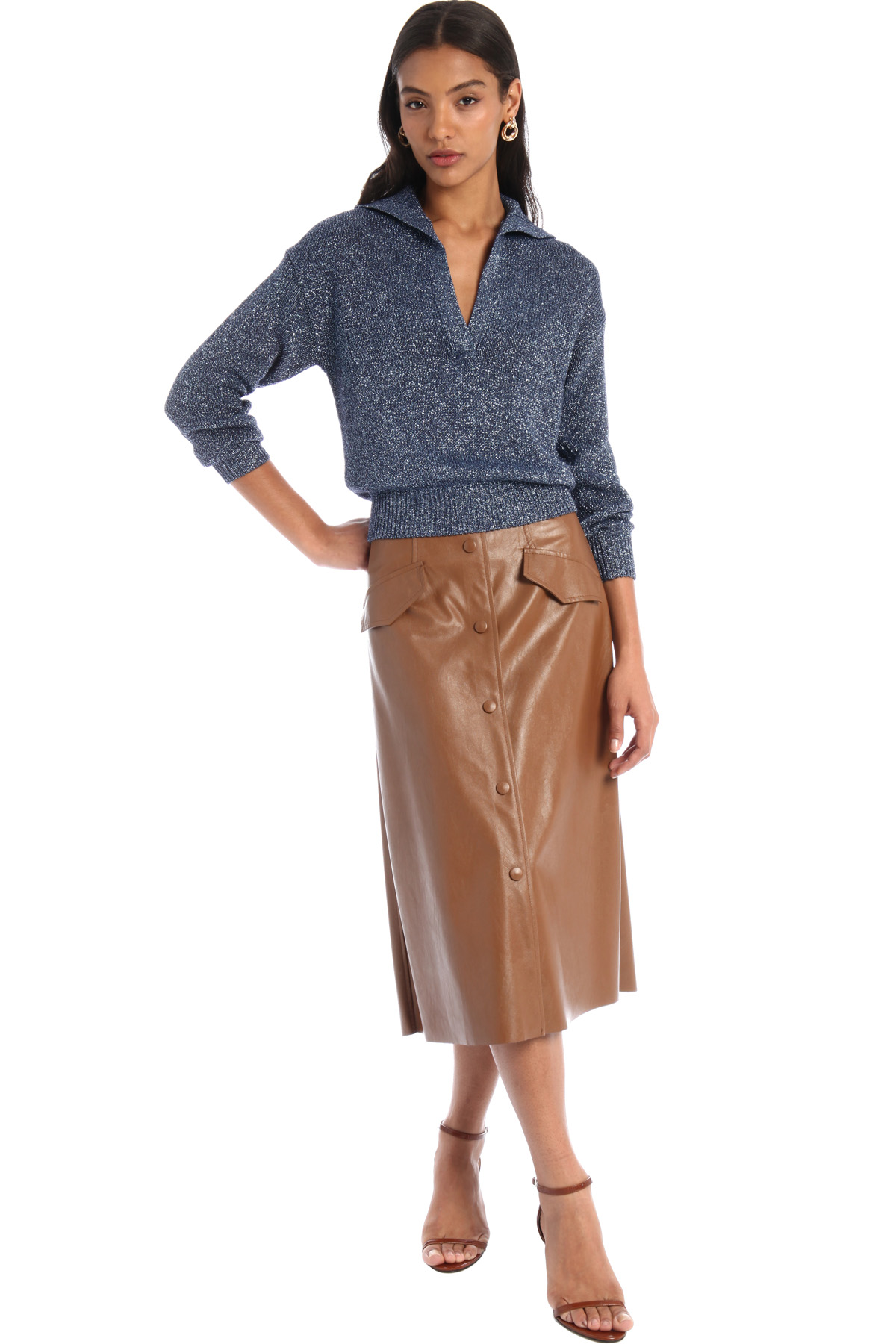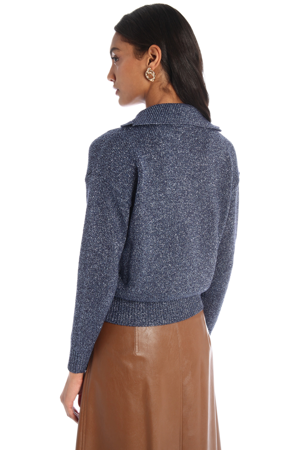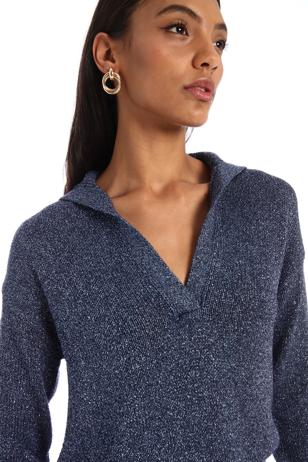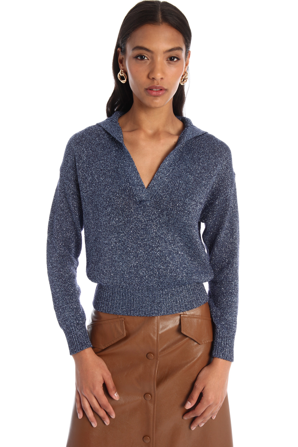 Maglia stile polo dalla linea morbida realizzata in filato cordonetto di viscosa lamé, con scollo a V e colletto, maniche lunghe dal giro sceso e bordi rifiniti a coste.
