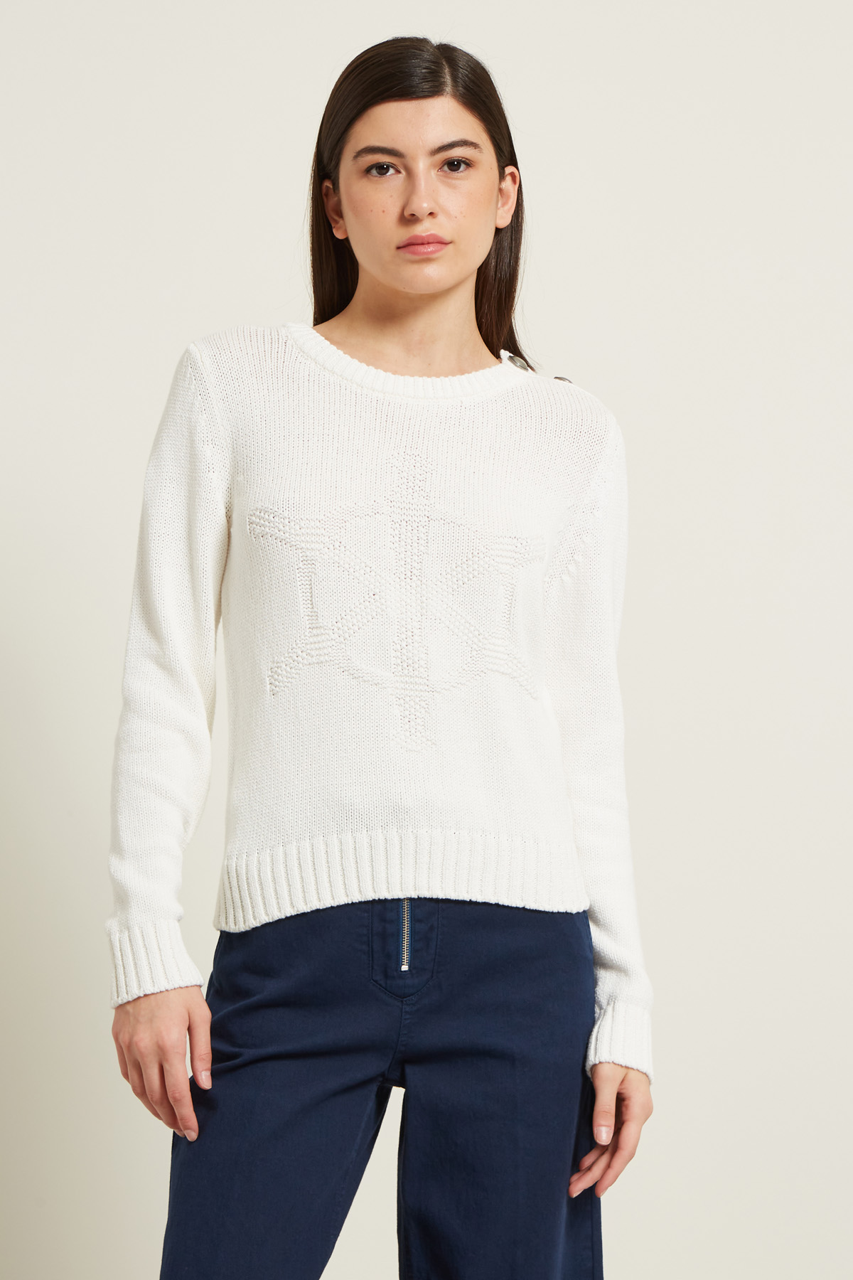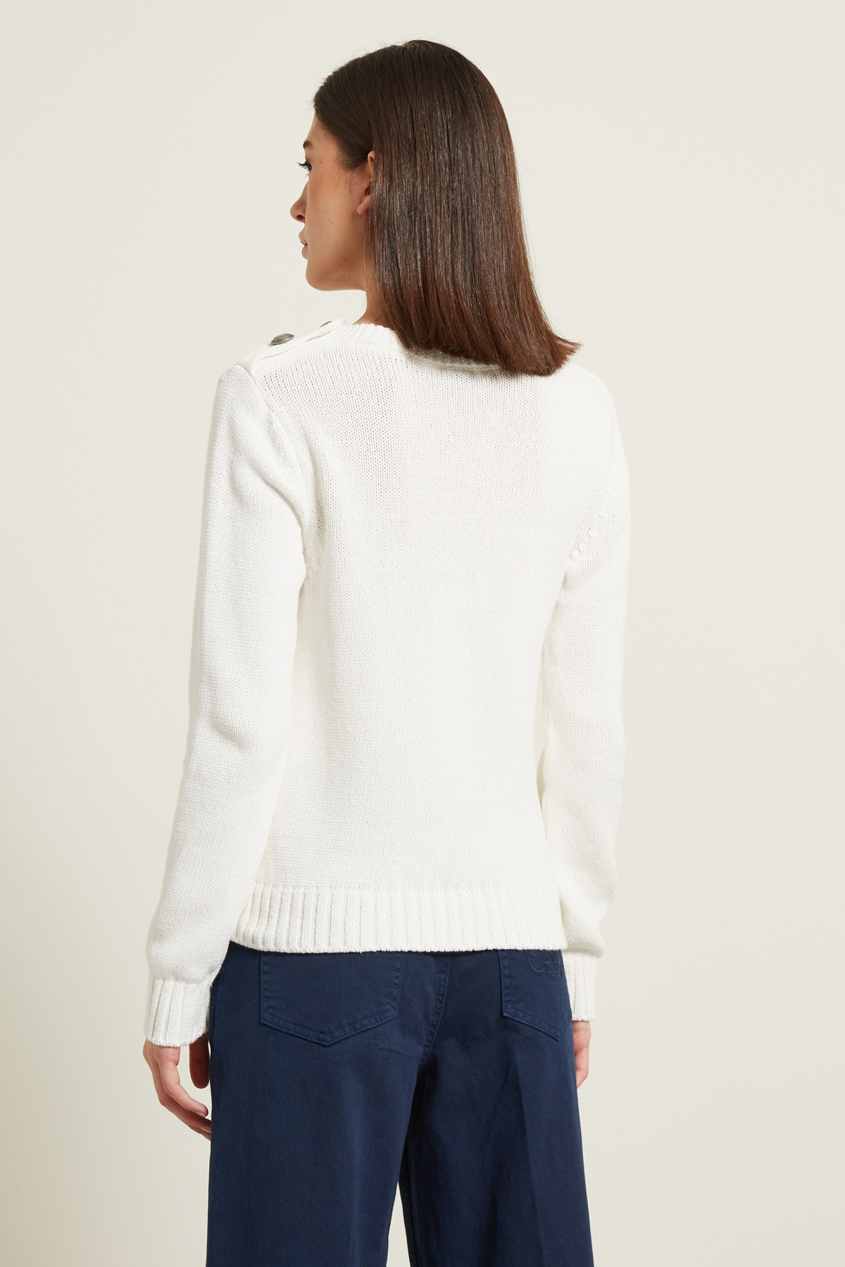 Maglia dalla linea dritta realizzata in filato di cotone, con motivo a intarsio, scollo a giro, dettaglio di bottoni sulla spalla, maniche lunghe e profili rifiniti a coste.