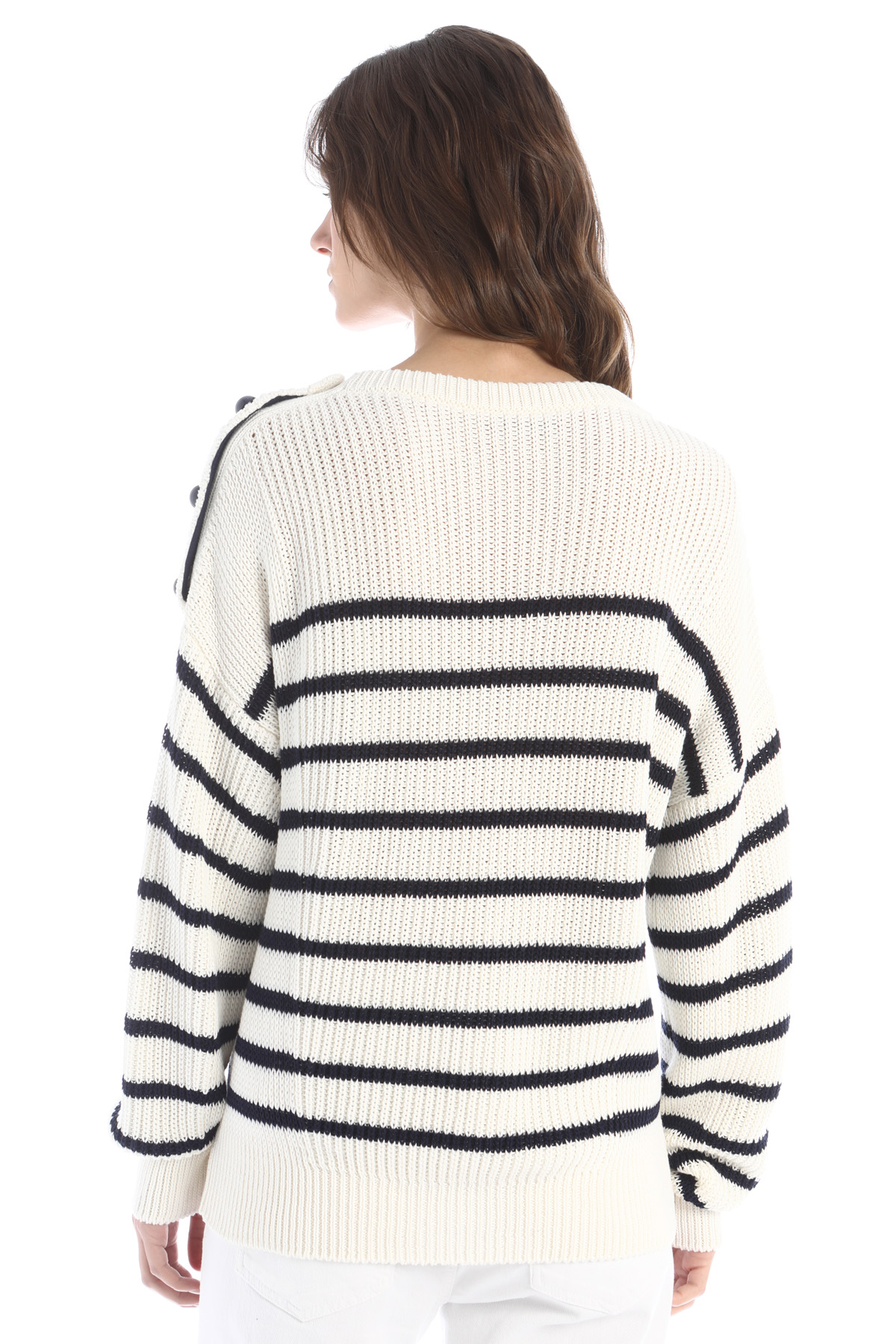 Maglia dalla linea morbida realizzata in cordonetto di cotone, con lavorazione tinto filo, scollo a barchetta, motivo di bottoni sulla spalla, maniche lunghe dal giro sceso e bordi rifiniti a coste.