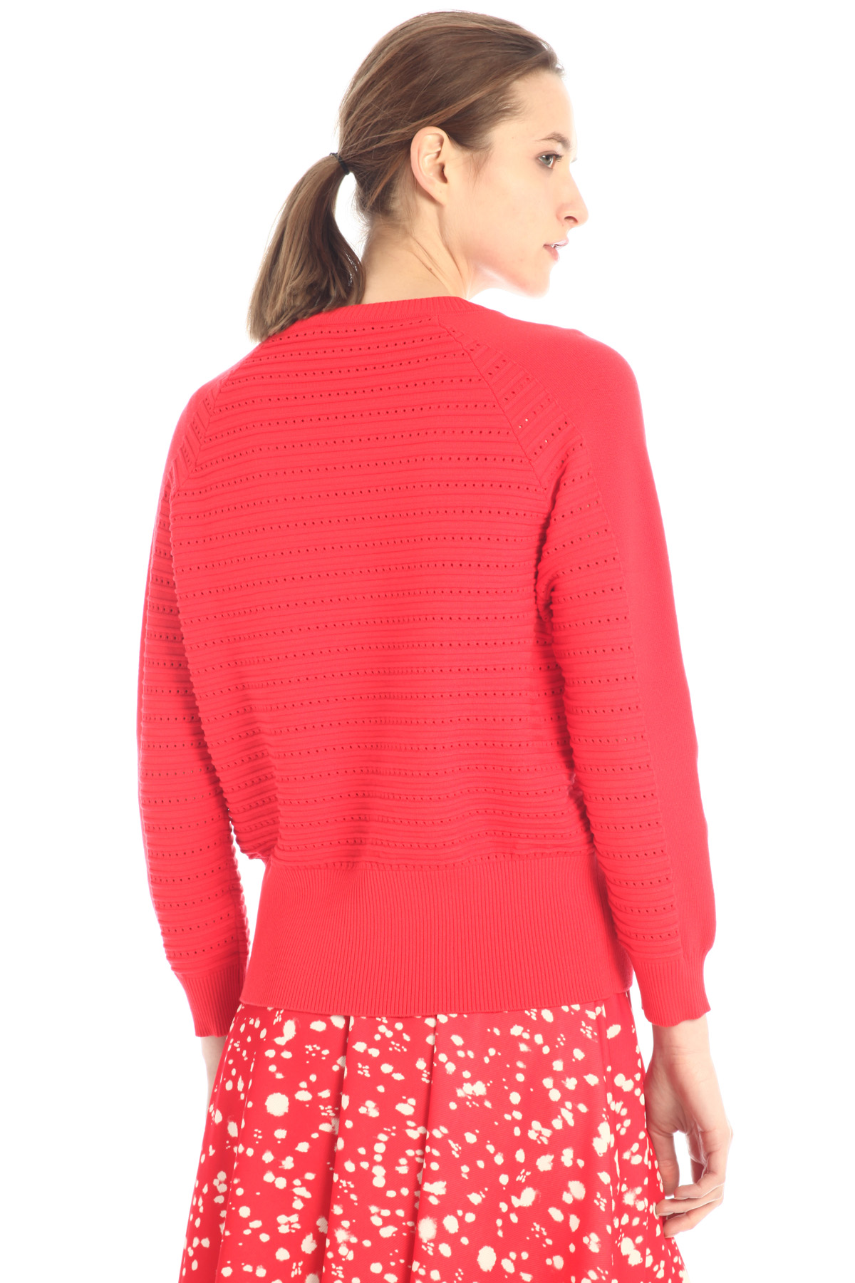 Maglia dalla linea morbida realizzata in filato di misto viscosa, con lavorazione in rilievo e traforata, scollo rotondo, maniche raglan lunghe e bordi rifiniti a coste.