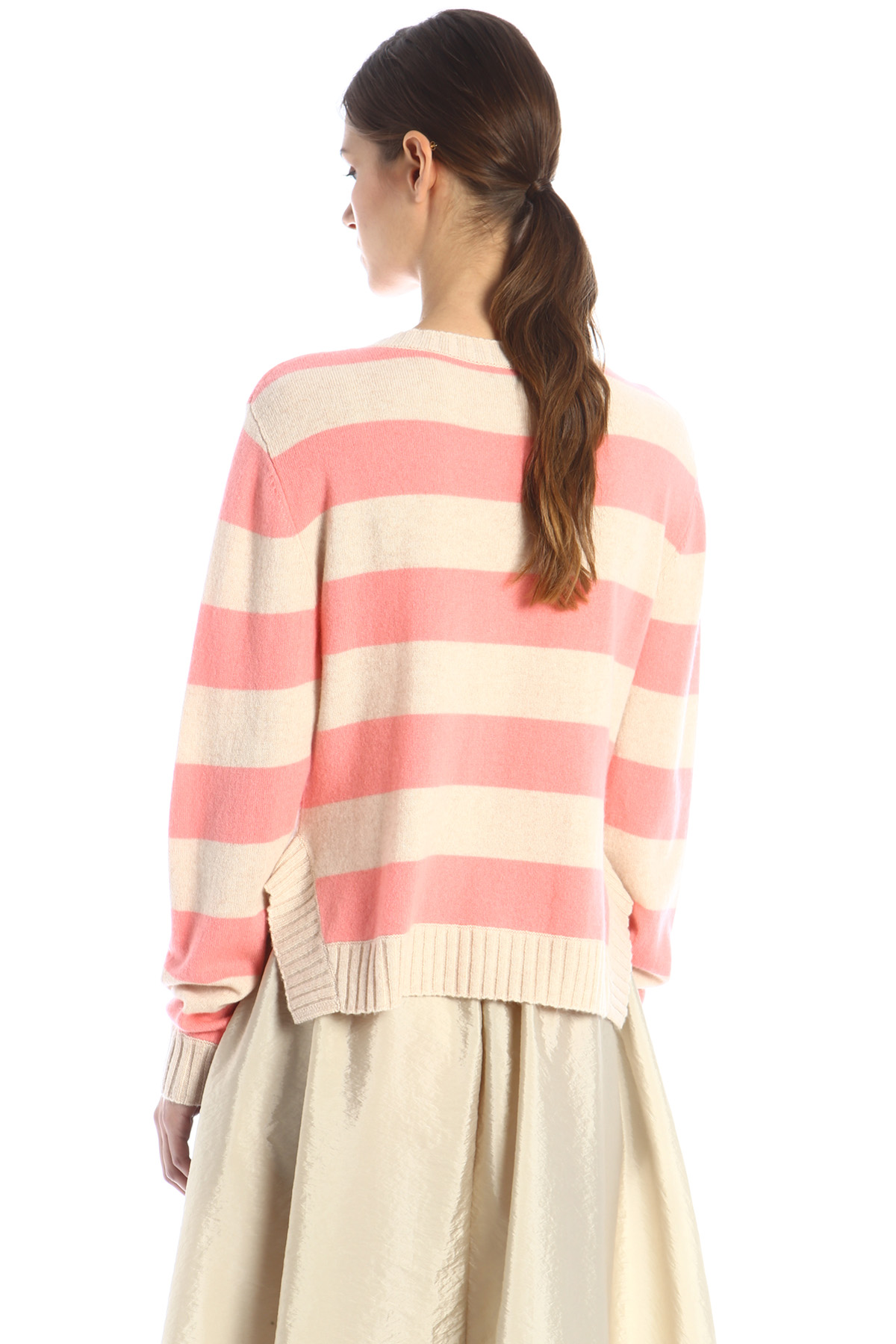 Maglia boxy realizzata in filato di lana e cashmere, con scollo rotondo, maniche lunghe dal giro sceso, spacchi laterali al fondo e bordi rifiniti a coste.