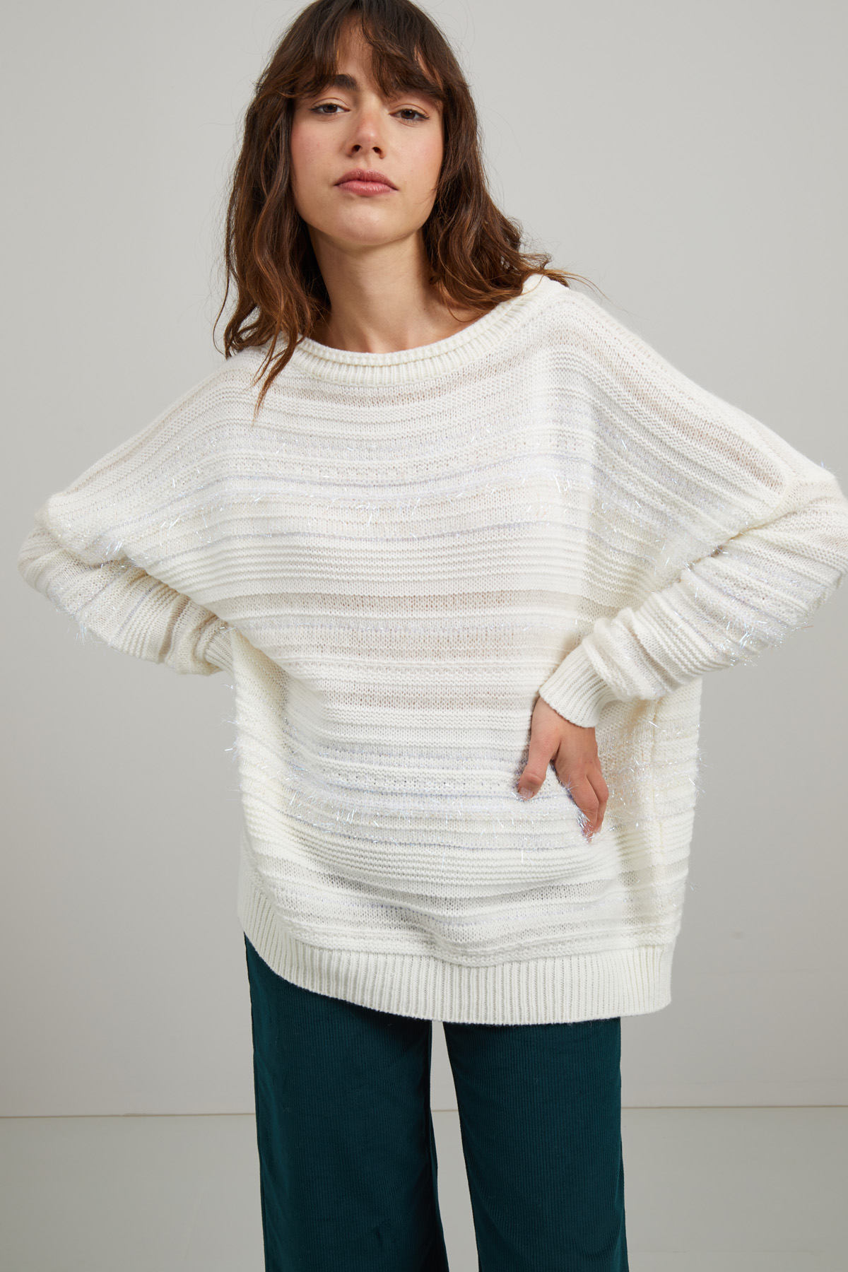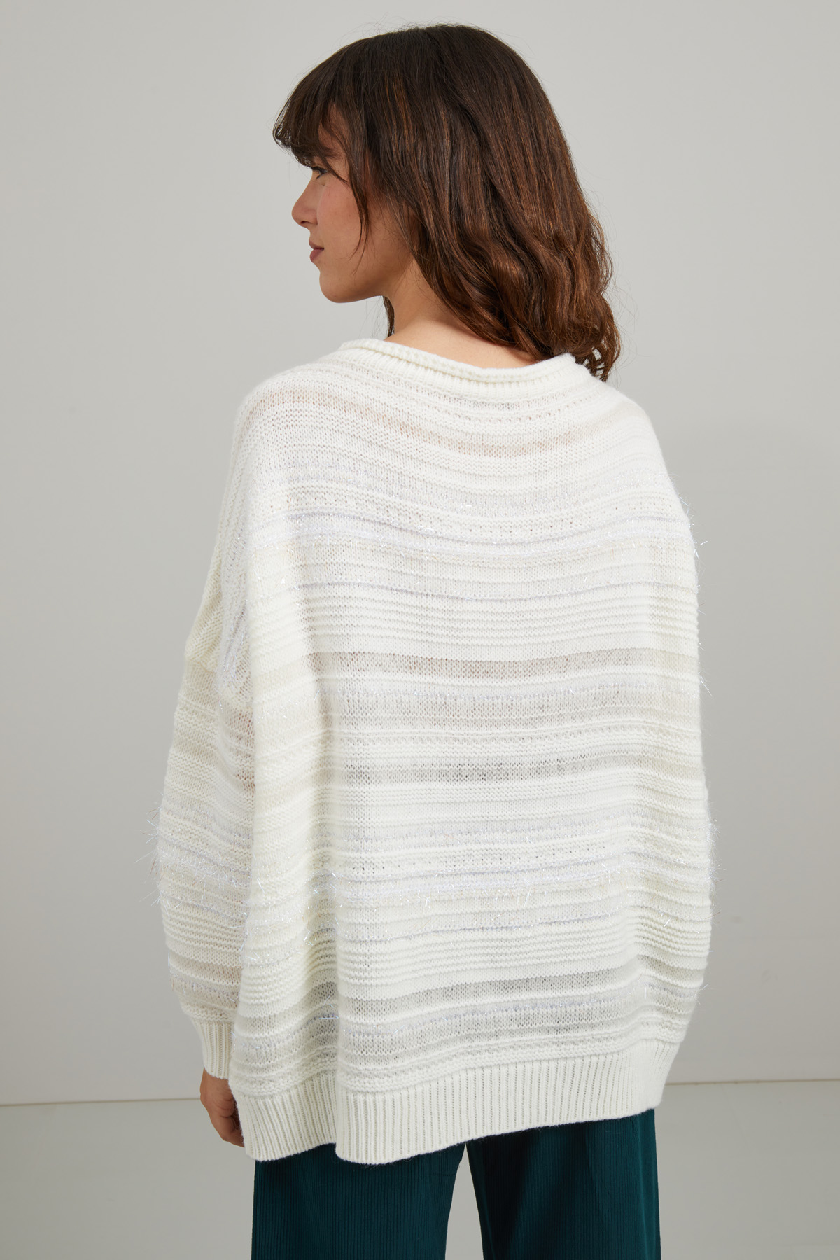 Maglia dalla linea morbida realizzata in filato di misto lana e mohair tinto filo, scollo a barchetta, maniche lunghe dal giro sceso e profili rifiniti a coste.