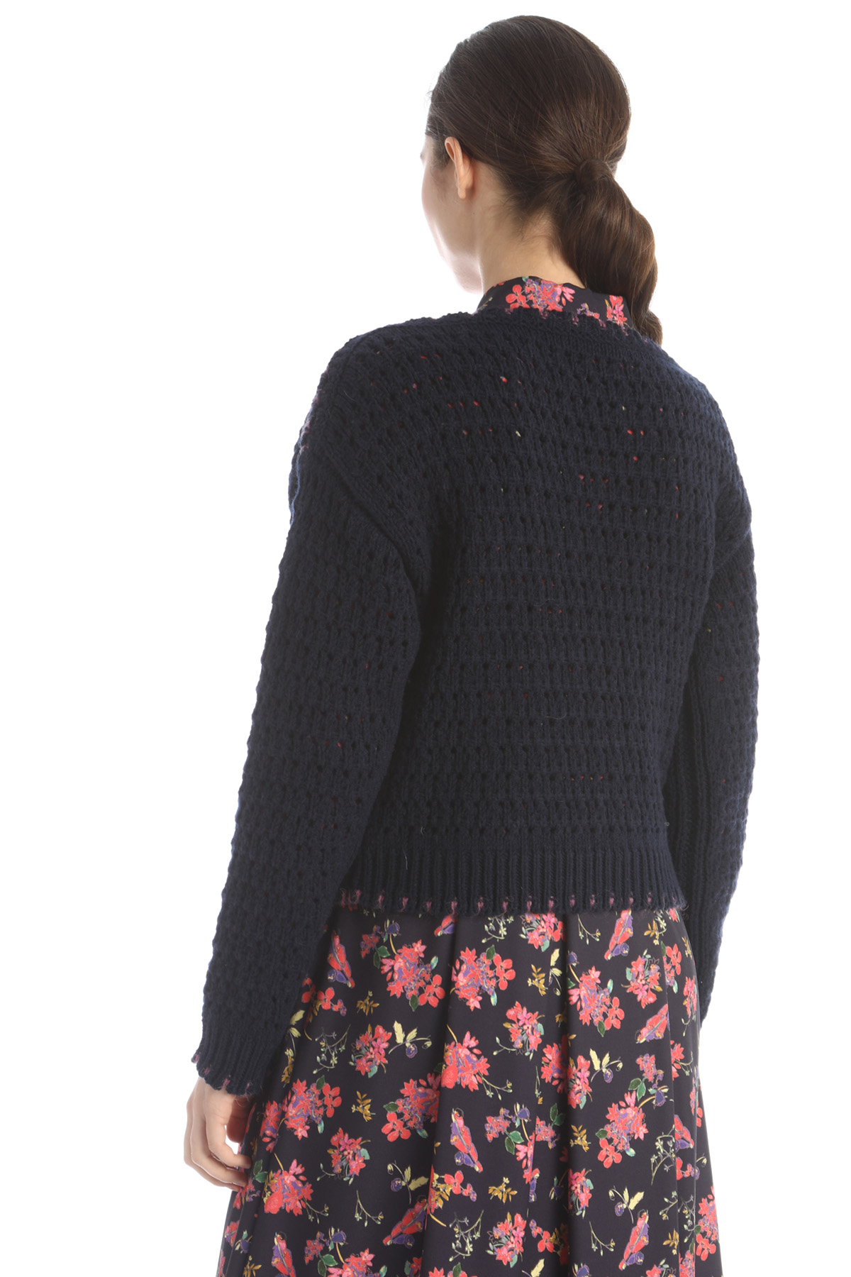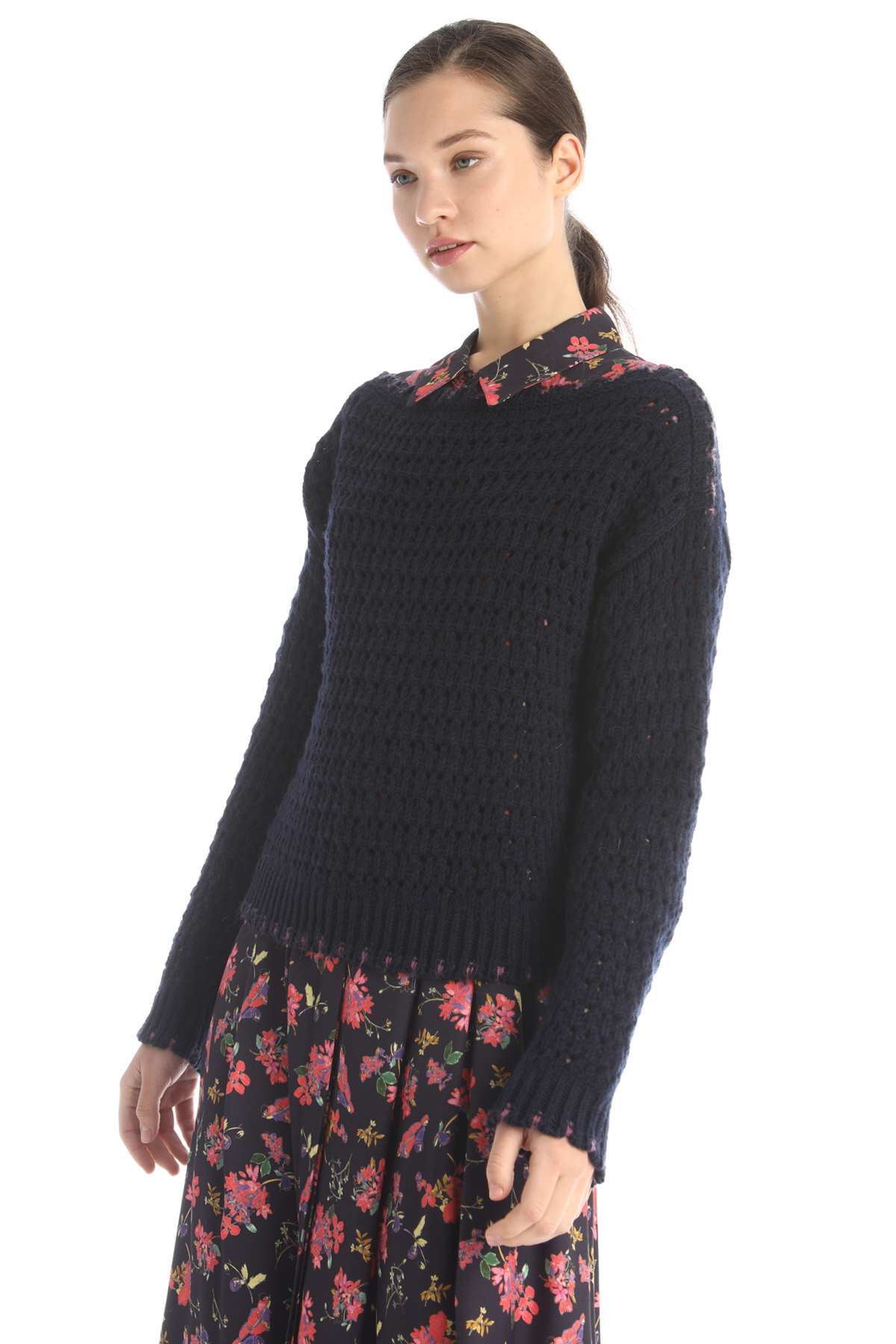 Maglia dalla linea morbida realizzata in filato di misto lana, con motivo traforato, scollo a barchetta, maniche lunghe e profili rifiniti a coste.
