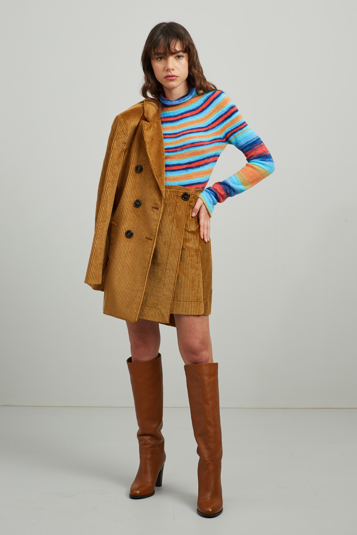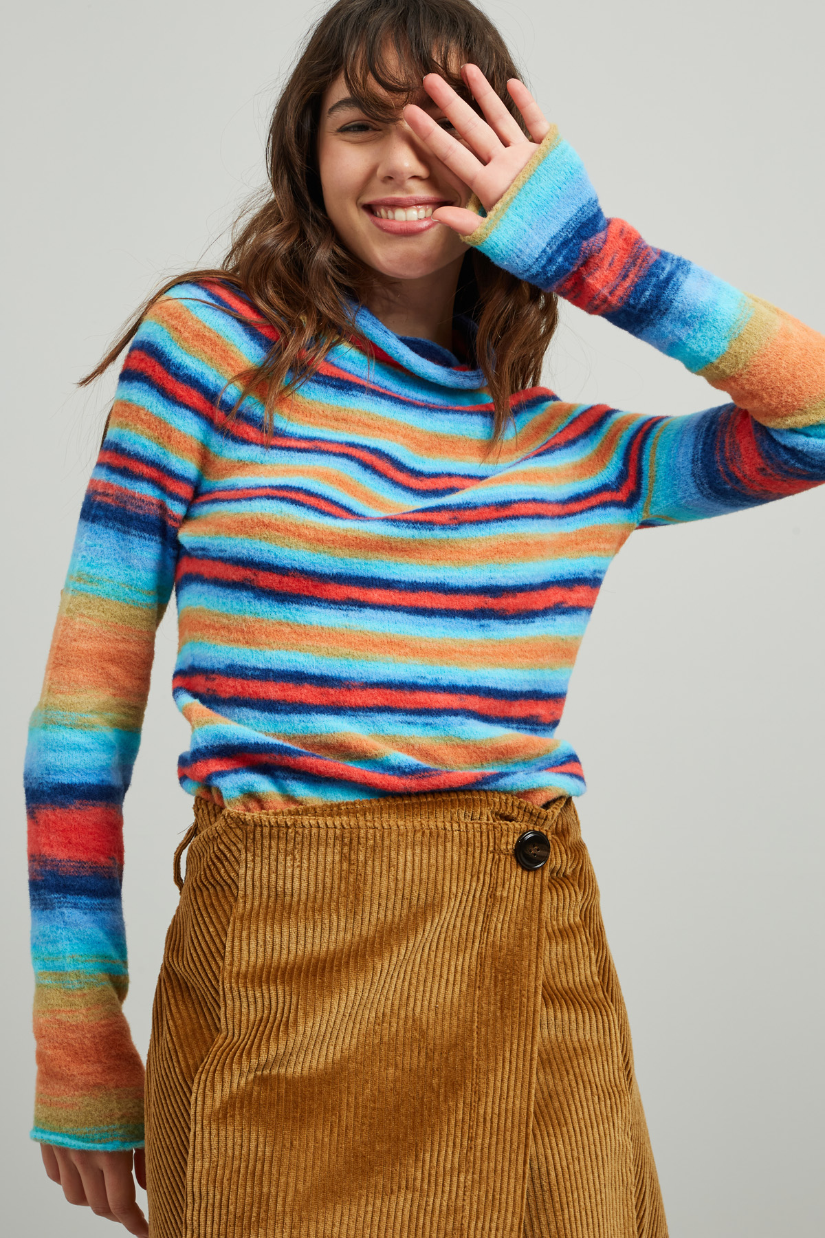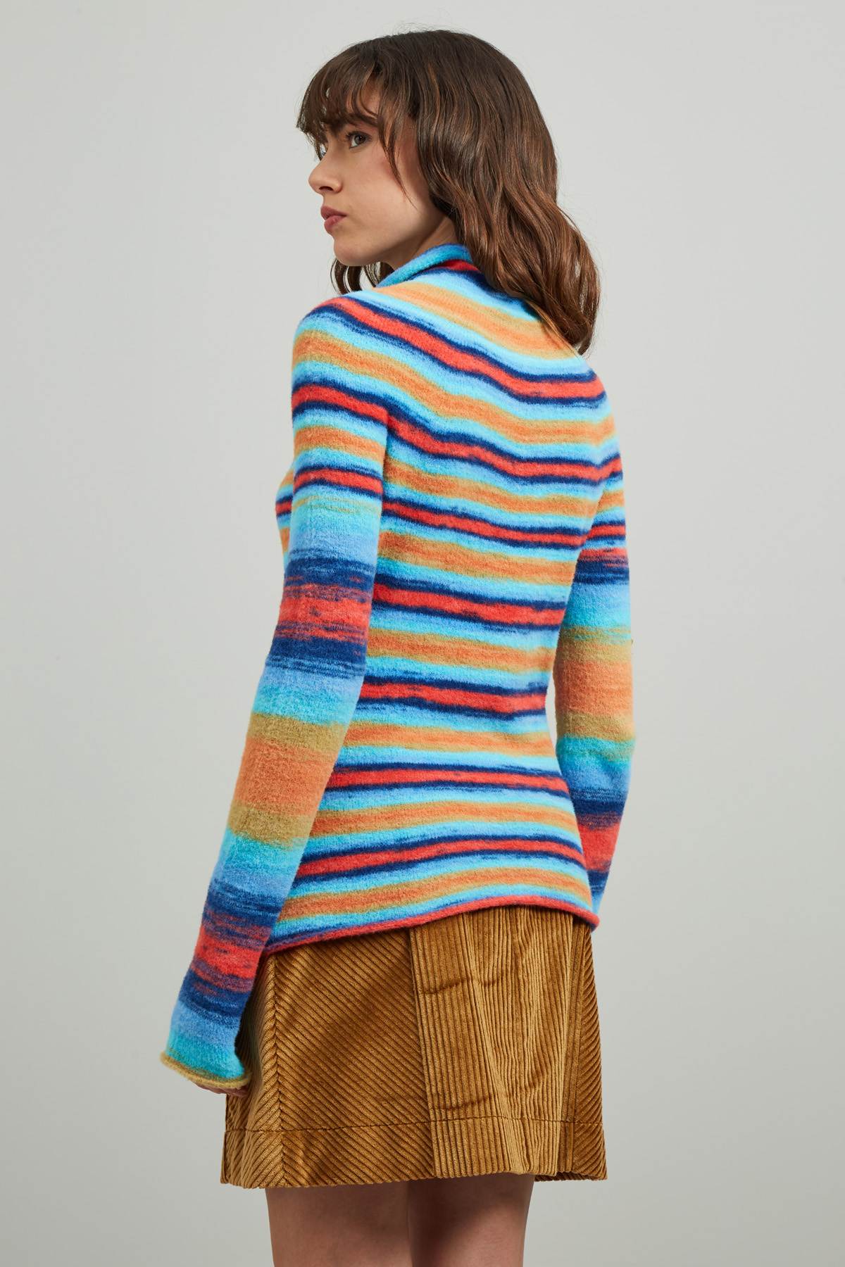 Maglia dalla linea dritta realizzata in filato garzato tinto filo, con collo a cratere e maniche lunghe a kimono.