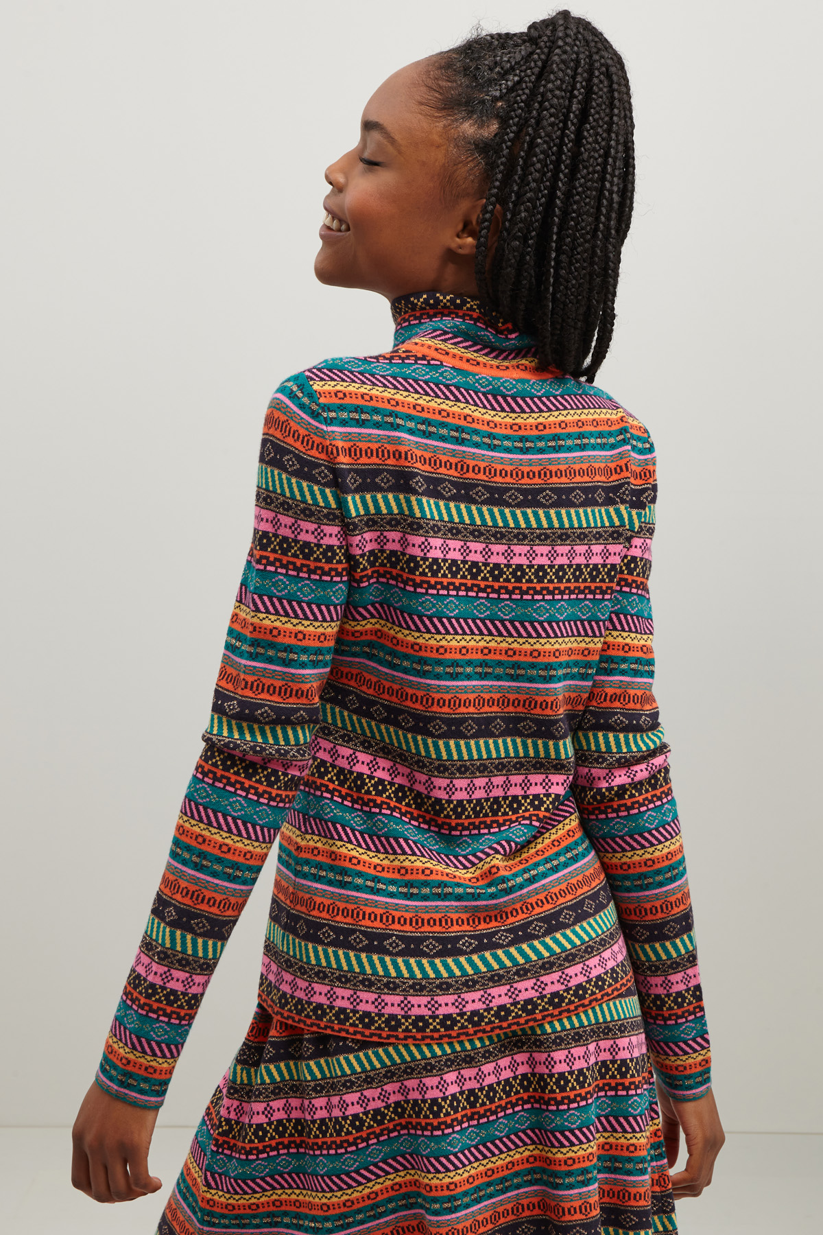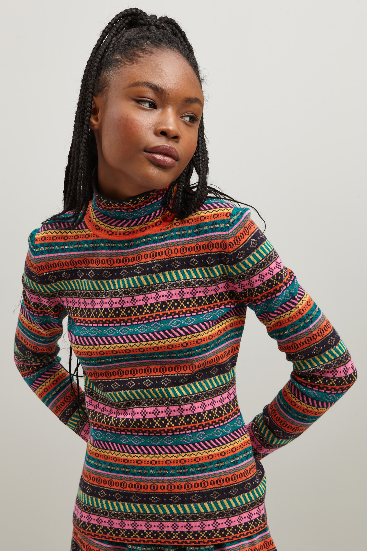 Maglia dalla linea aderente realizzata in filato di misto viscosa jacquard, con collo alto e maniche lunghe.