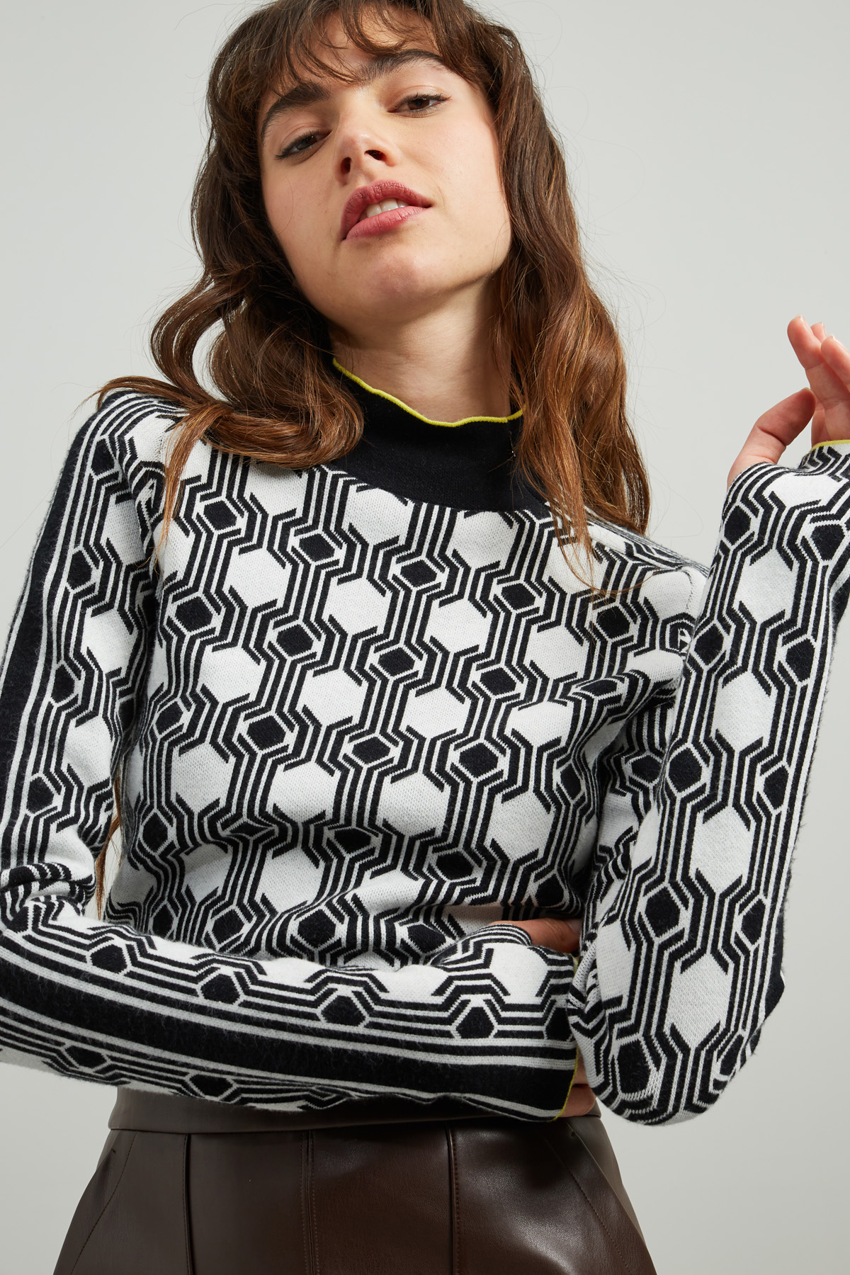 Maglia dalla linea semiaderente realizzata in filato di viscosa stretch con lavorazione jacquard, collo montante, maniche lunghe raglan e chiusura tramite cerniera invisibile sulla spalla.