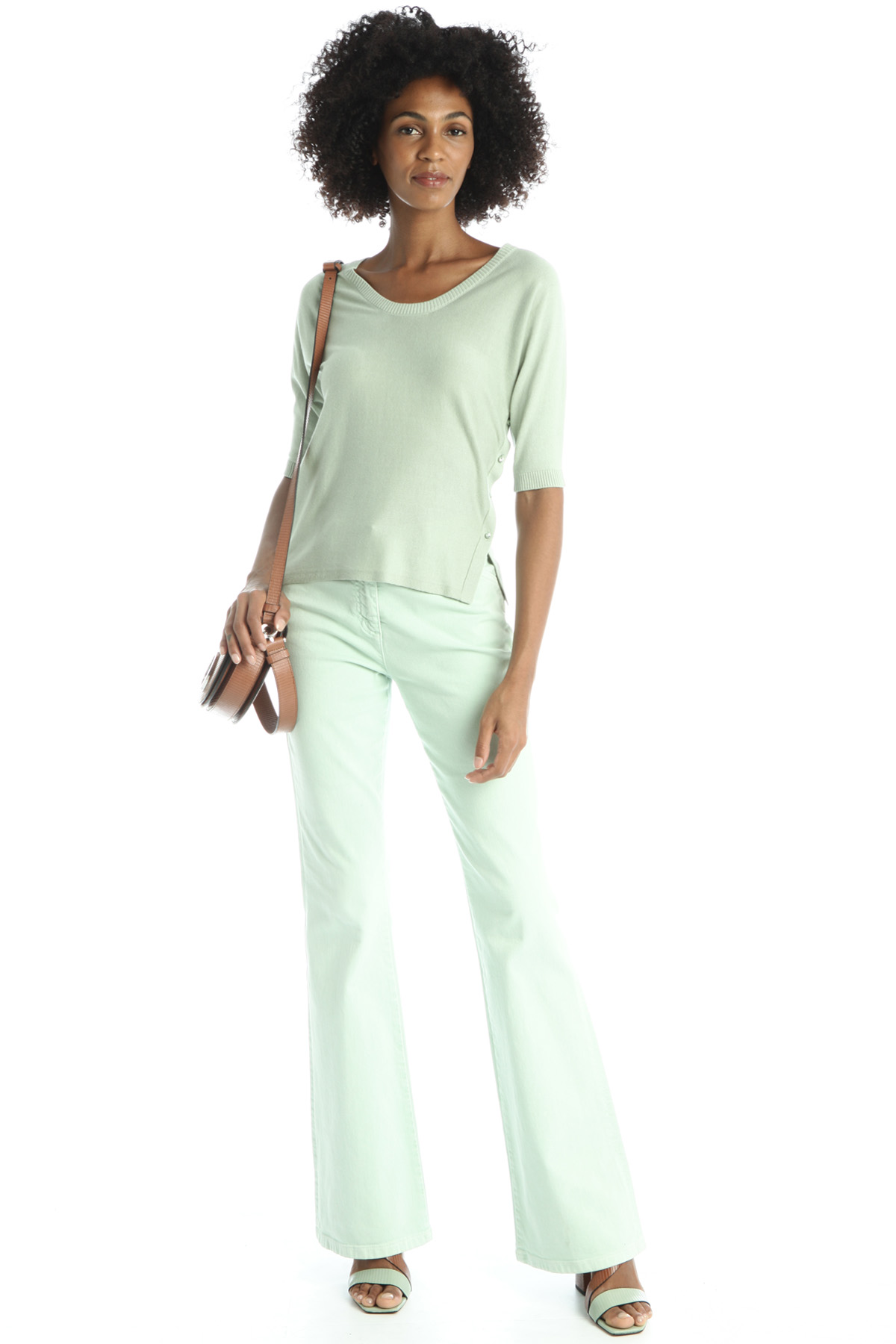 Maglia dalla linea semi aderente realizzata in filato di misto cotone, con scollo a U, maniche tre quarti a kimono, spacco sul fianco apribile tramite bottoni gioiello e profili rifiniti a coste.
