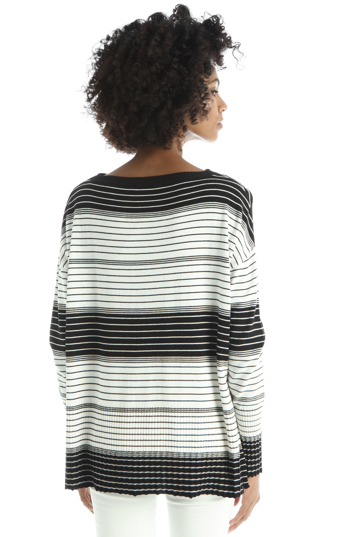 Maglia dalla linea morbida realizzata in filato di cotone e seta, con lavorazione tinto filo, scollo a barchetta, maniche lunghe dal giro sceso e fondo asimmetrico più lungo nel retro.
