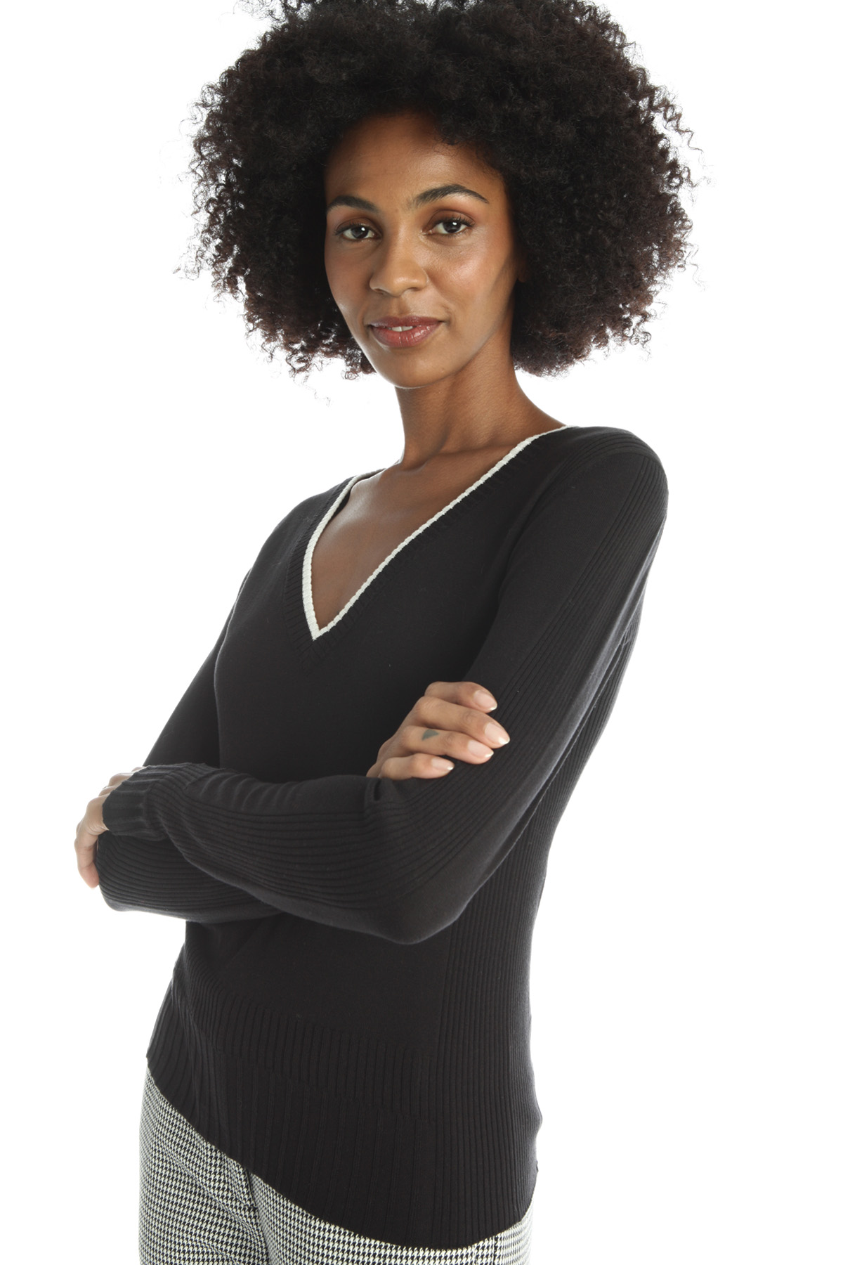 Maglia dalla linea aderente realizzata in filato di seta e cotone tinto filo, con scollo a V, maniche lunghe e profili rifiniti a coste.