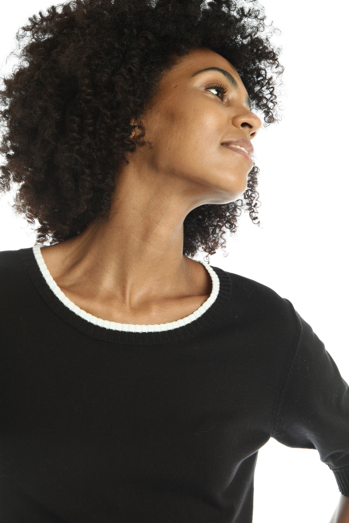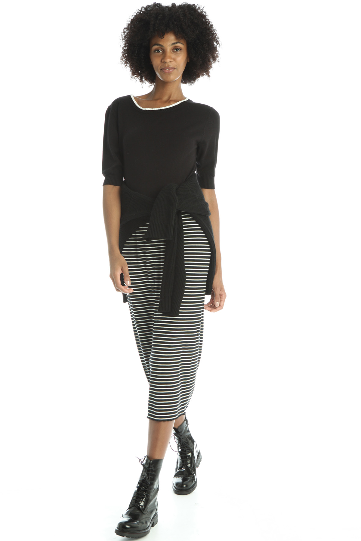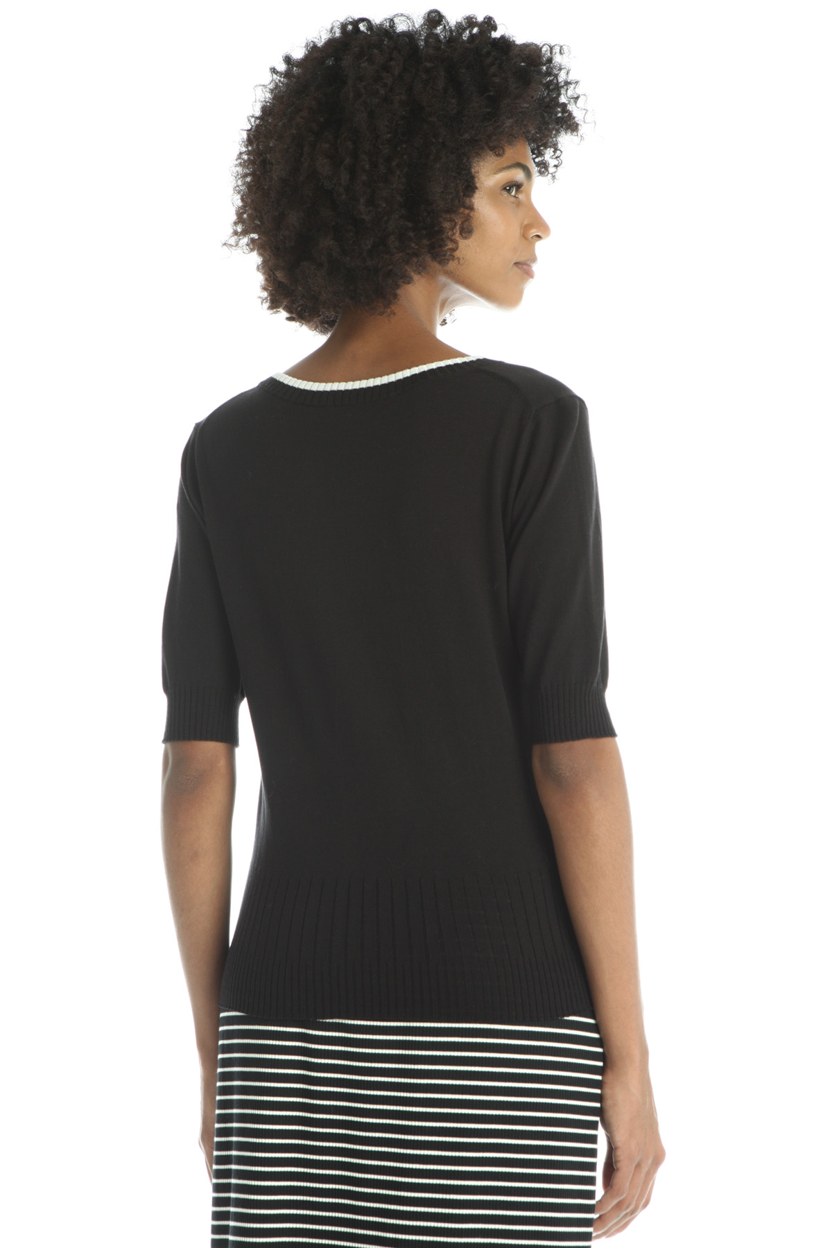 Maglia dalla linea semiaderente realizzata in filato di cotone e seta, con lavorazione tinto filo, scollo rotondo e maniche corte.