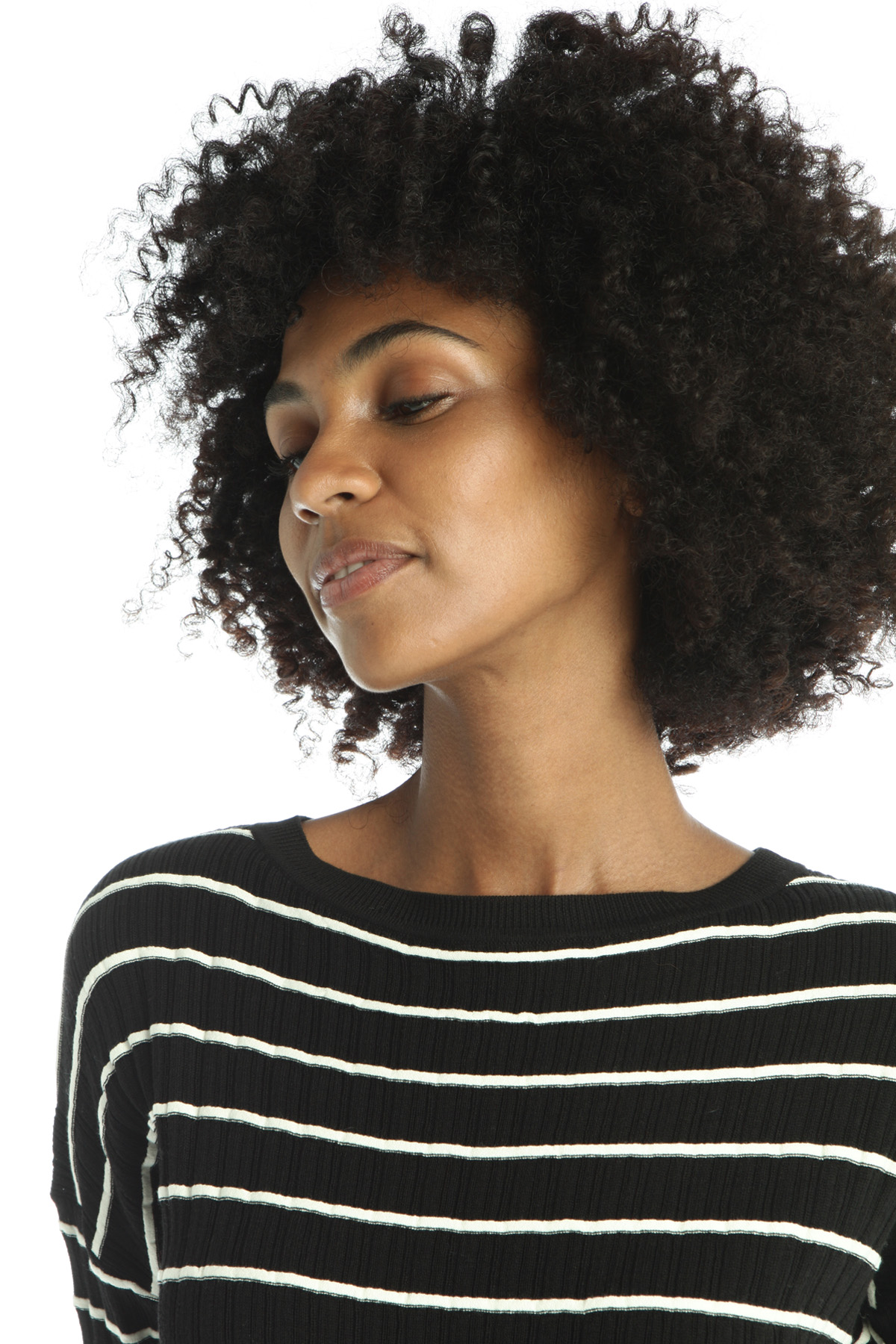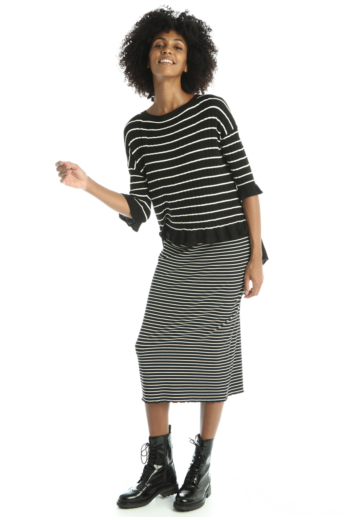 Maglia dalla linea morbida realizzata in filato di misto cotone e viscosa tinto filo, con lavorazione a coste, scollo a barchetta, maniche a tre quarti, spacchi laterali a fondo capo, fondo asimmetrico e profili rifiniti a rouches.