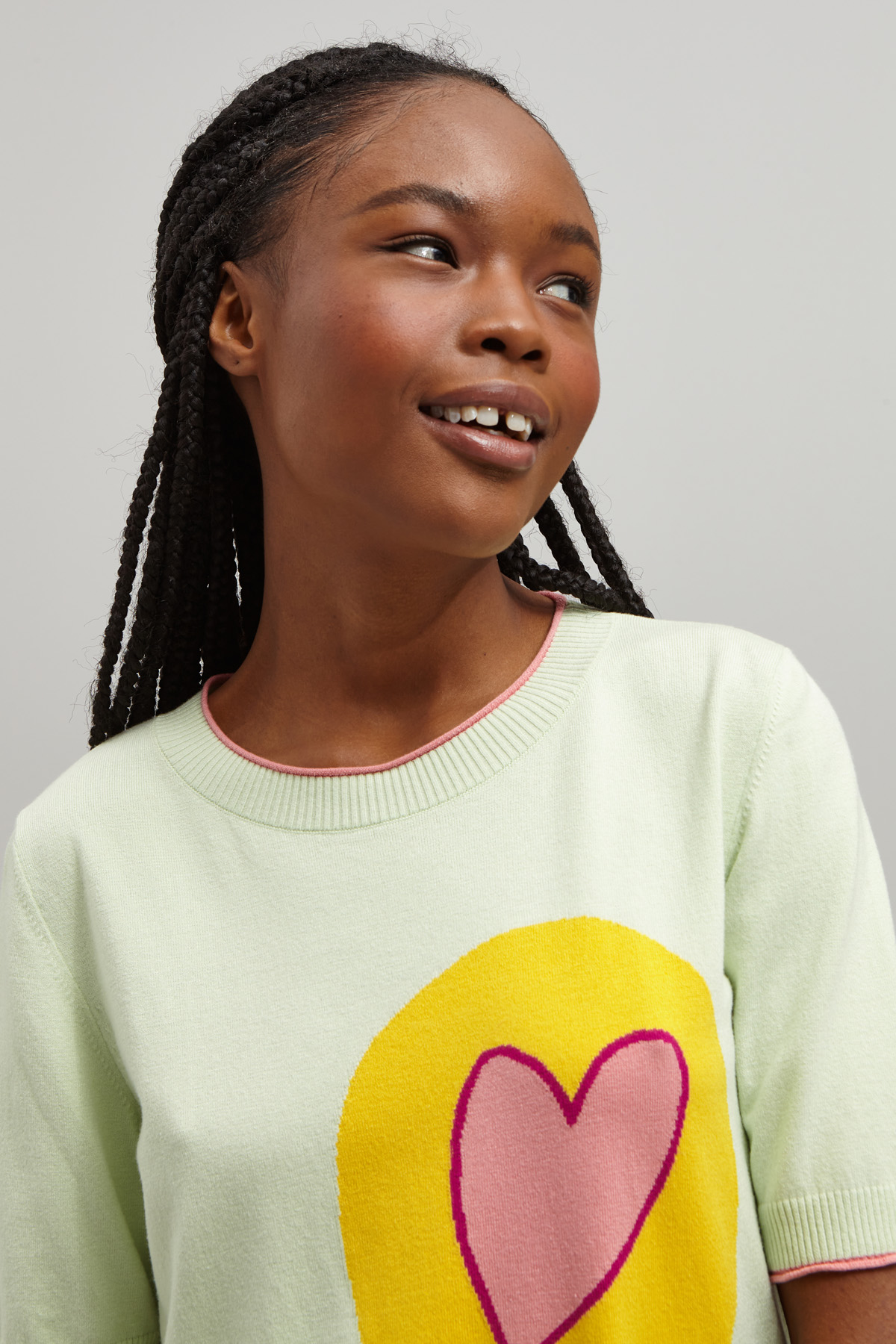 Maglia dalla linea dritta realizzata in filato di misto viscosa tinto filo, con collo rotondo, maniche corte e profili a contrasto.