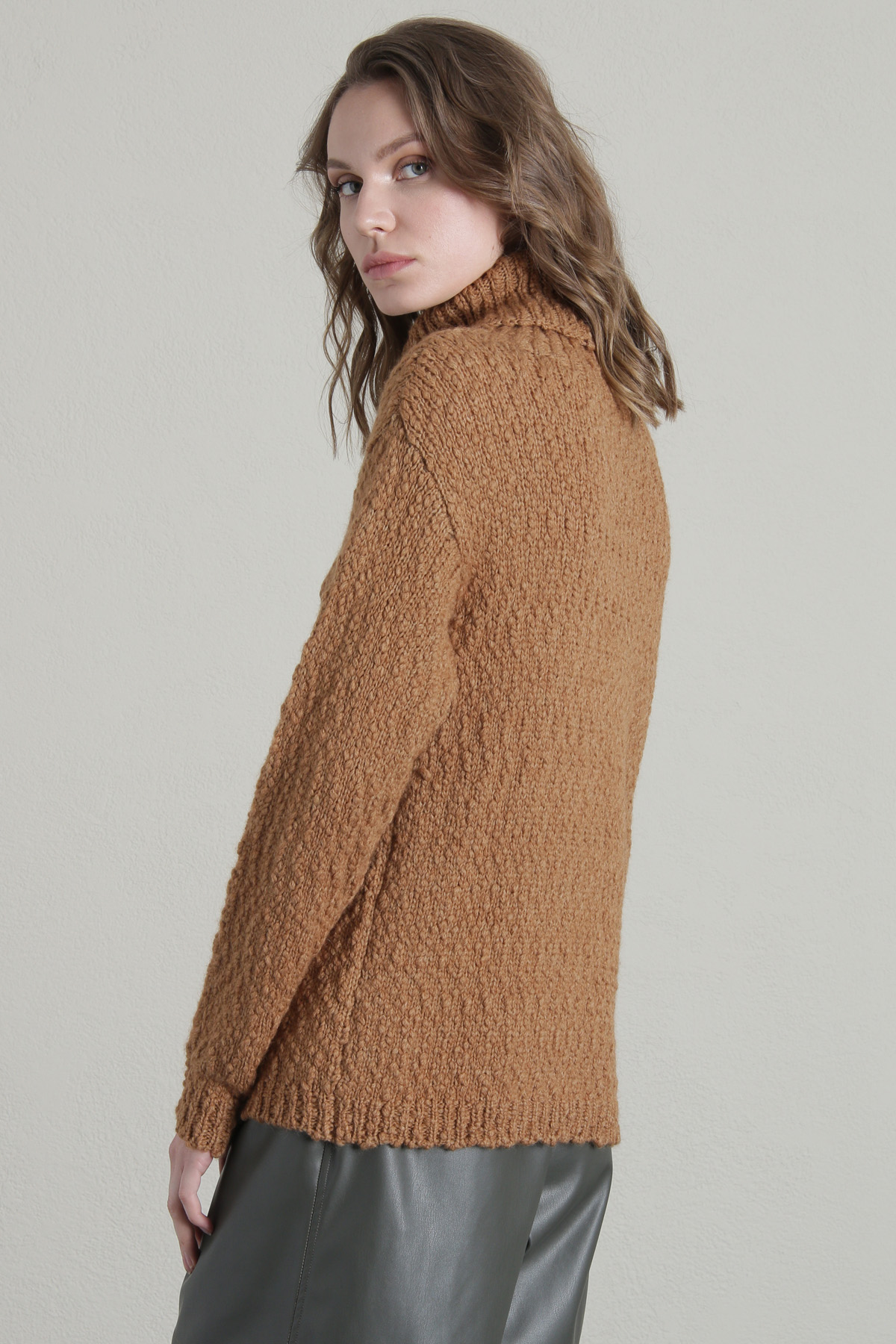 Maglia dalla linea morbida realizzata in filato di misto lana, con collo alto risvoltato, maniche lunghe e profili rifiniti a coste.