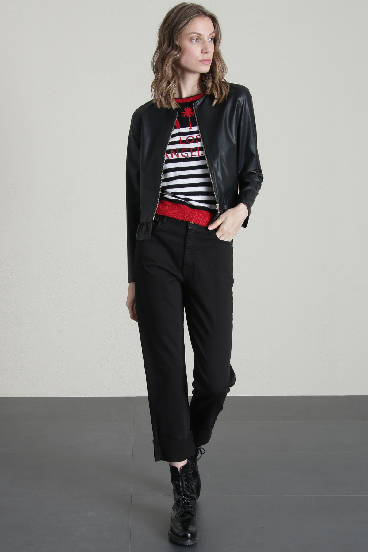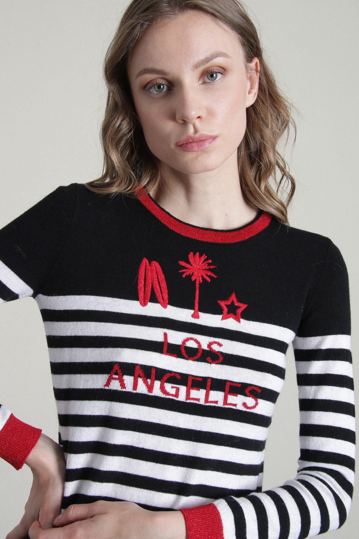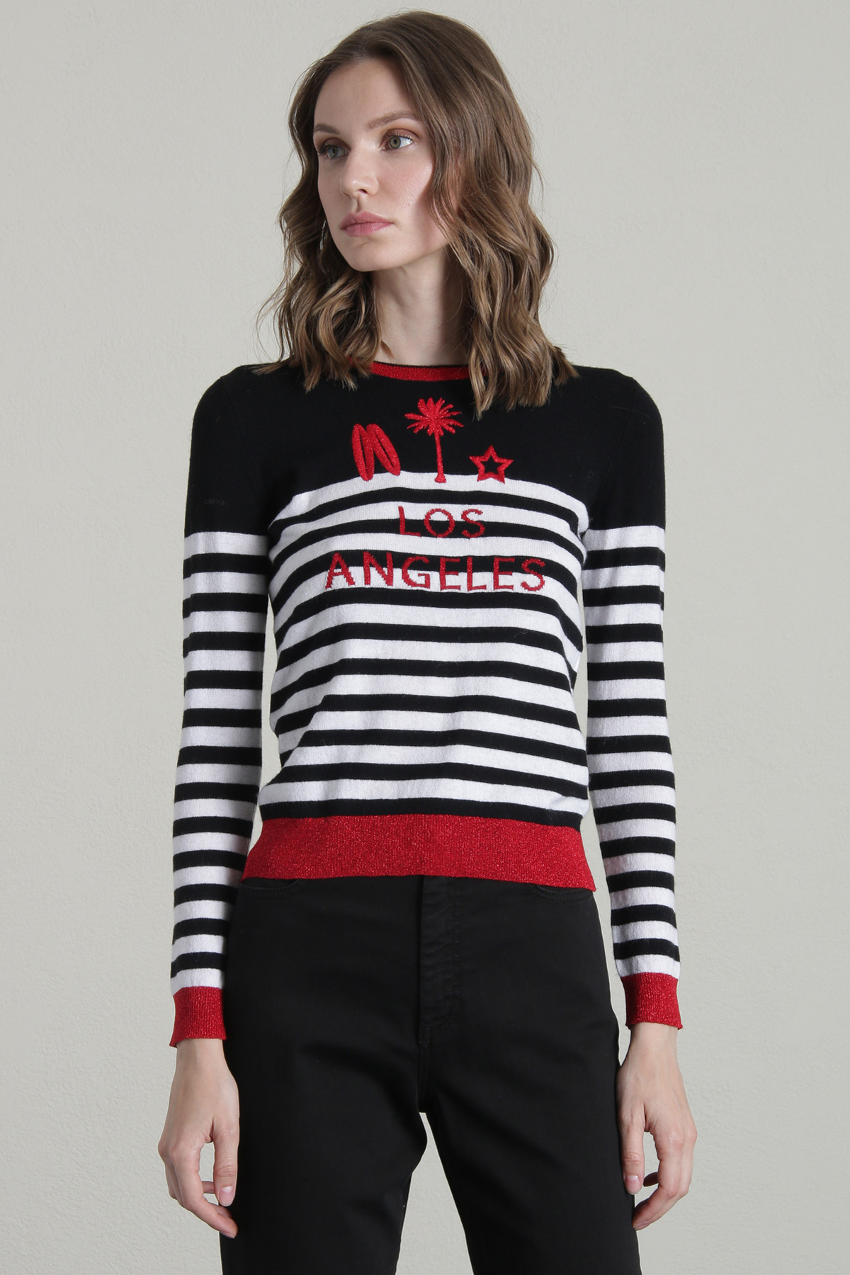 Maglia dalla linea morbida realizzata in filato di misto lana, viscosa e cashmere tinto filo, con inserto in filato lamè e motivo ricamato, scollo a giro, maniche lunghe e profili rifiniti a coste.