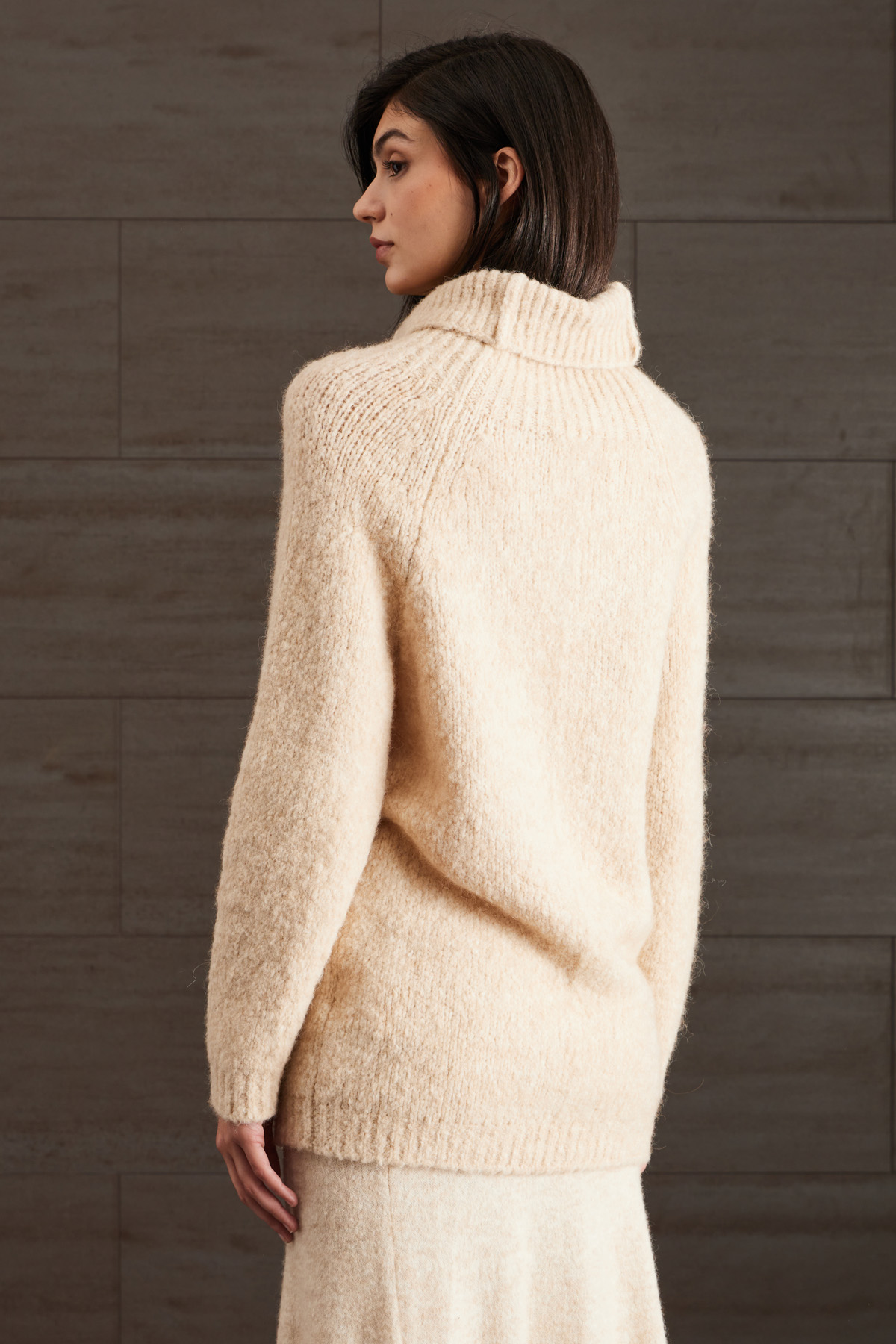 Maglia dalla linea dritta realizzata in filato di misto lana e alpaca stretch, con collo a cratere e maniche lunghe raglan.