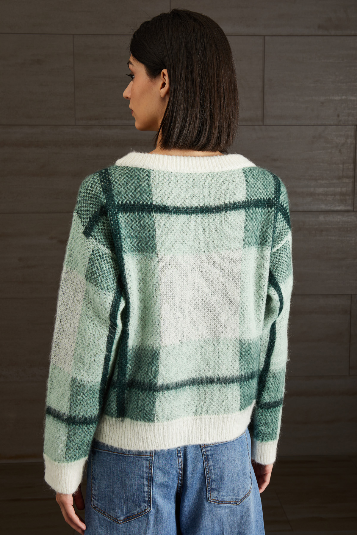 Maglia dalla linea morbida realizzata in filato di misto mohair tinto filo, con scollo a barchetta, maniche lunghe e profili rifiniti a coste.