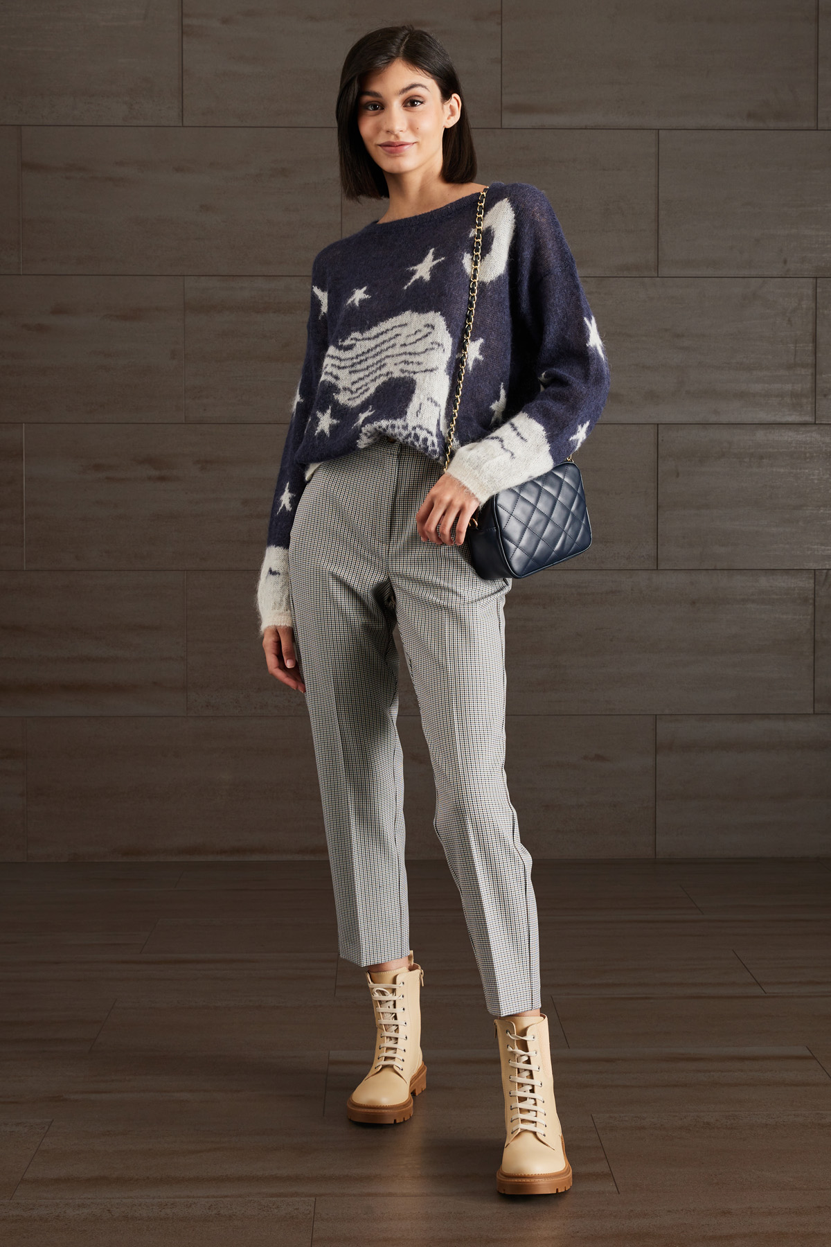 Maglia dalla linea dritta realizzata in filato garzato di misto alpaca e mohair, con motivo a intarsio, scollo rotondo, maniche lunghe e profili rifiniti a coste.