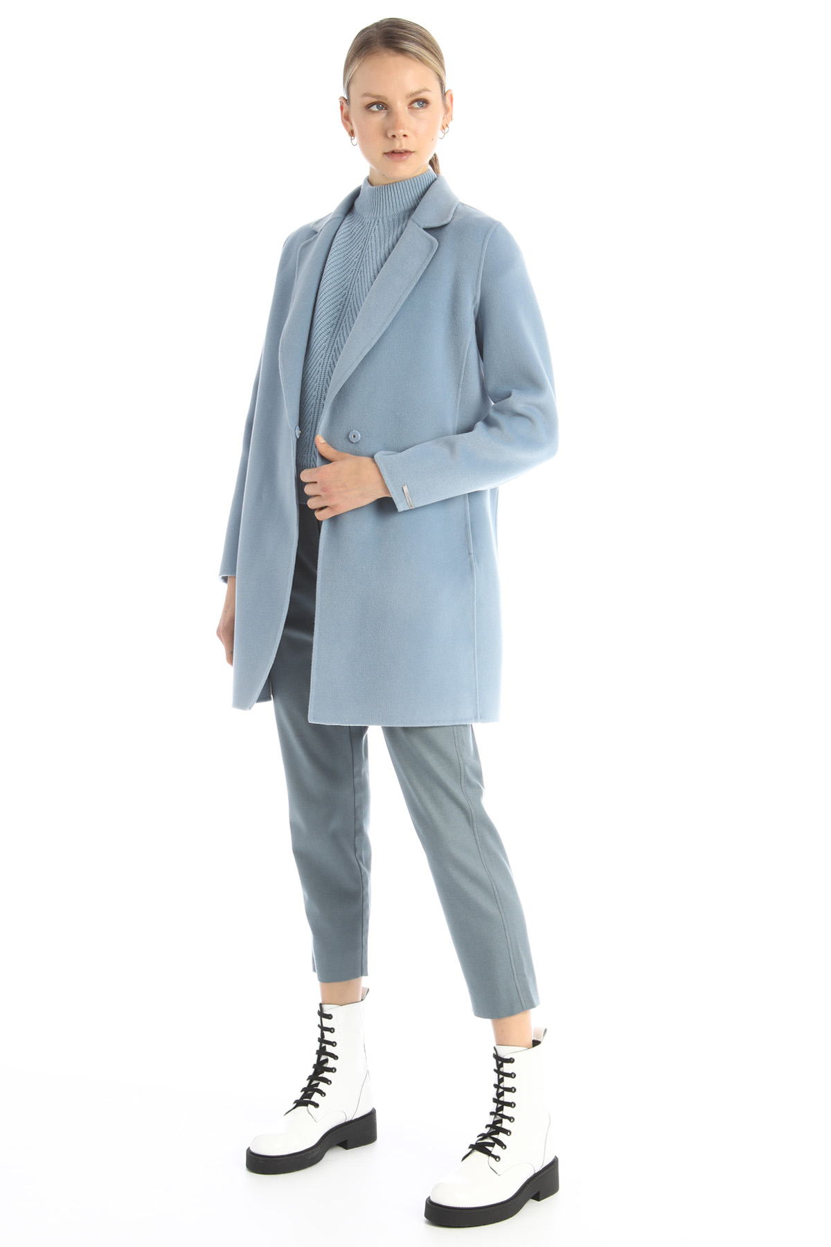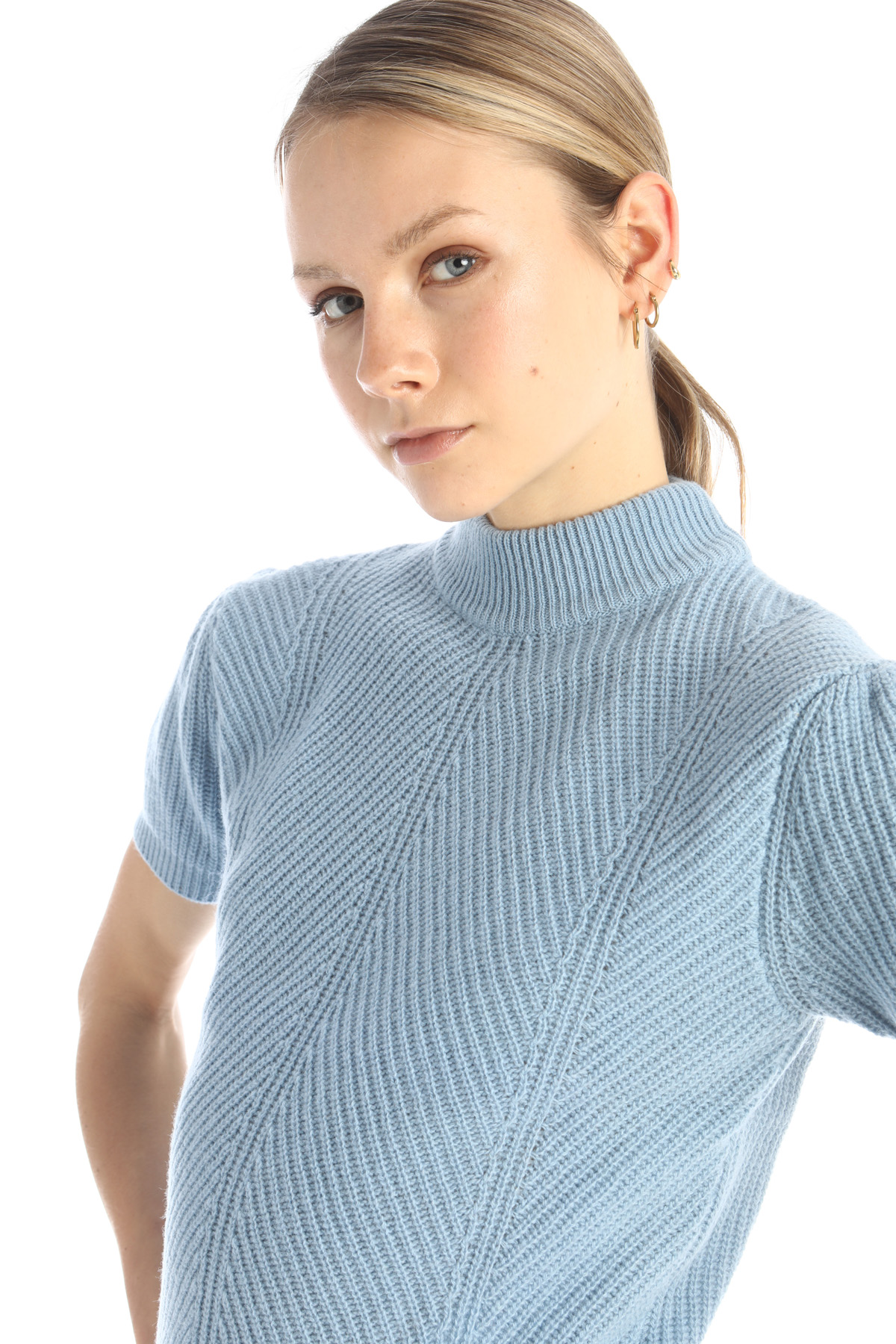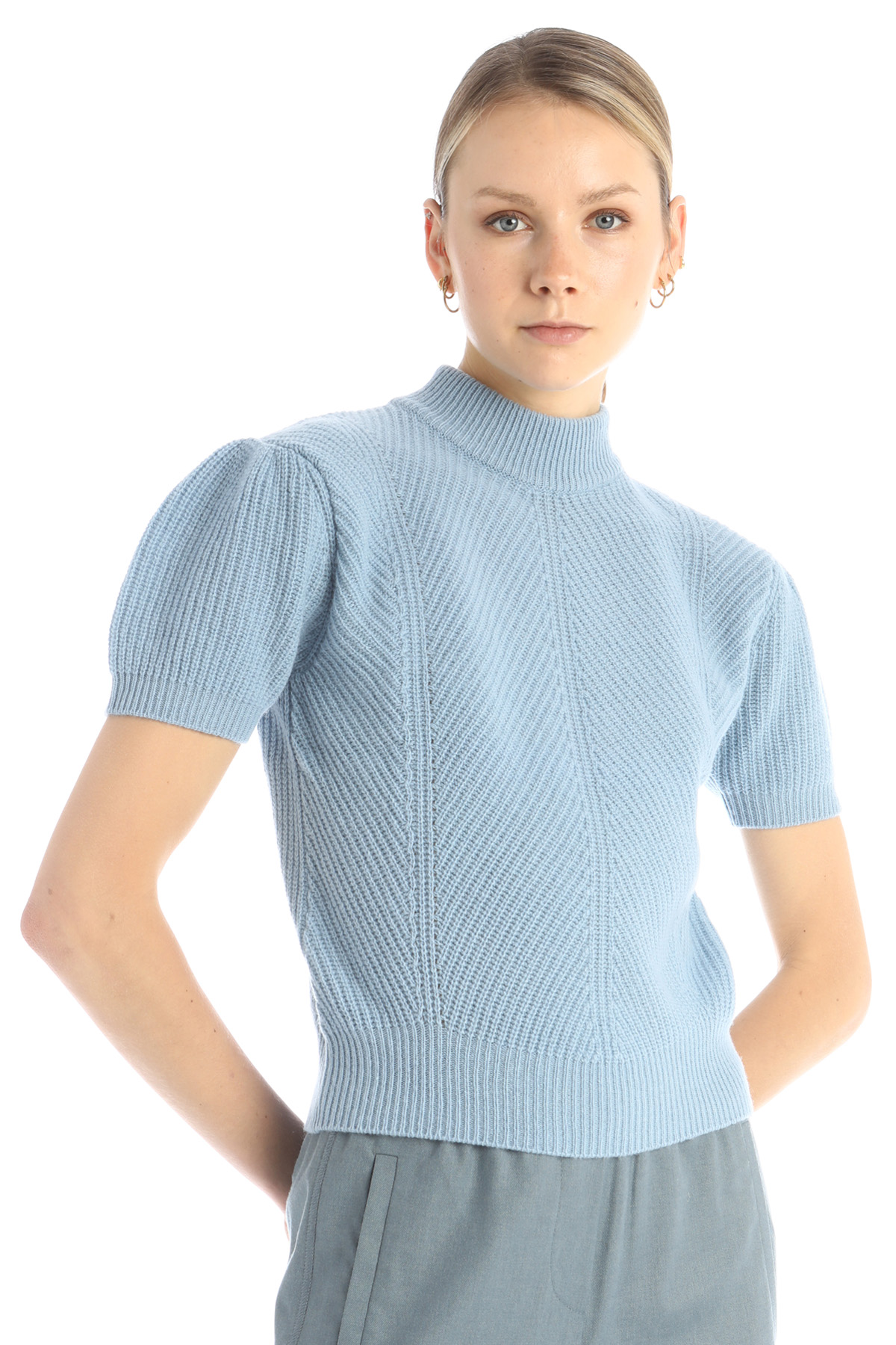 Maglia dalla linea morbida realizzato in filato di misto lana a coste, con collo alto e maniche corte a palloncino.