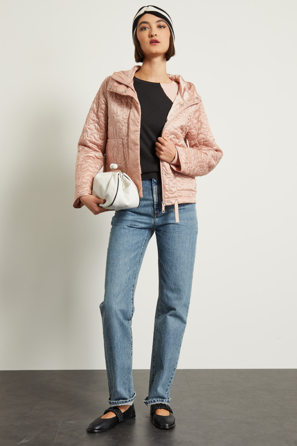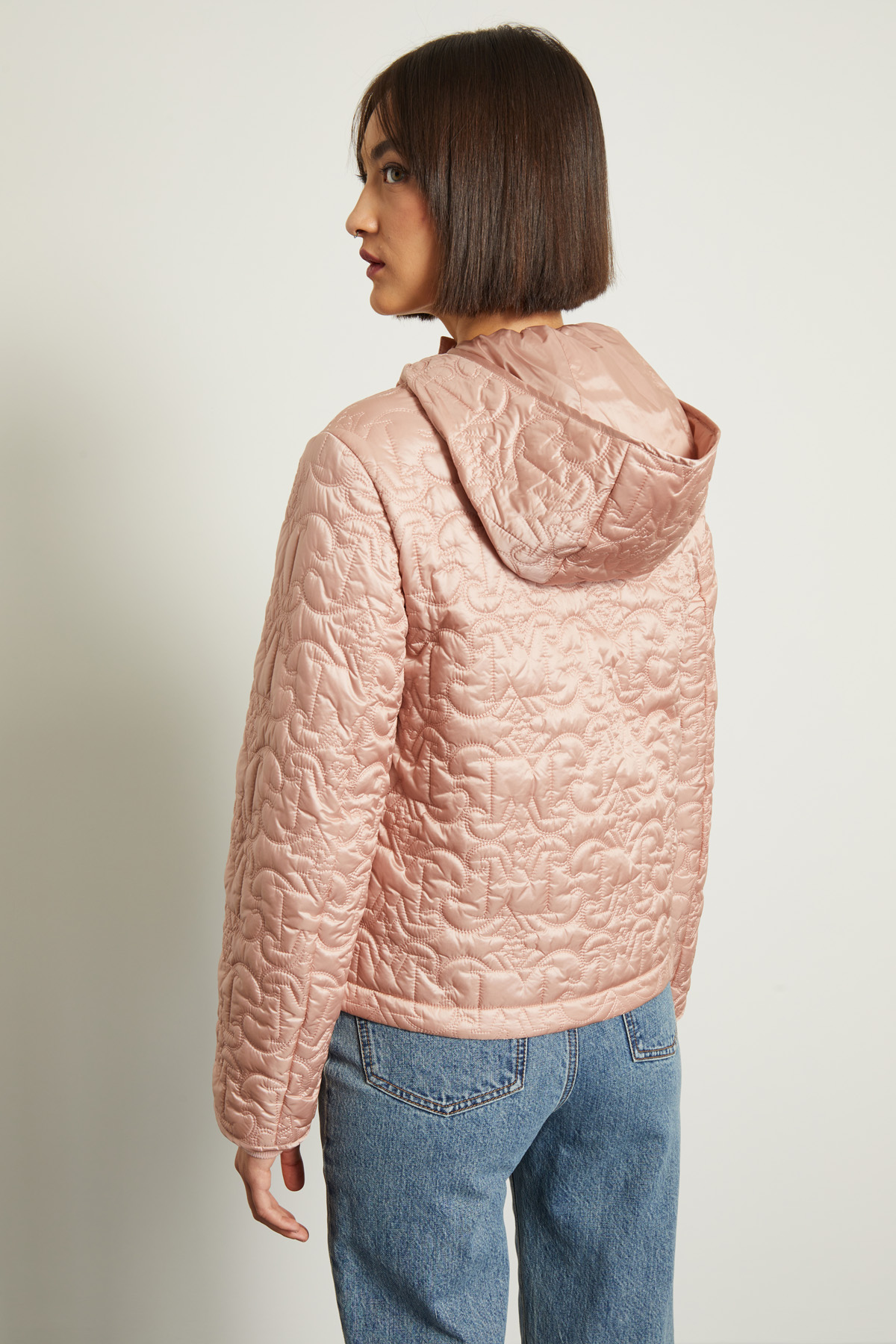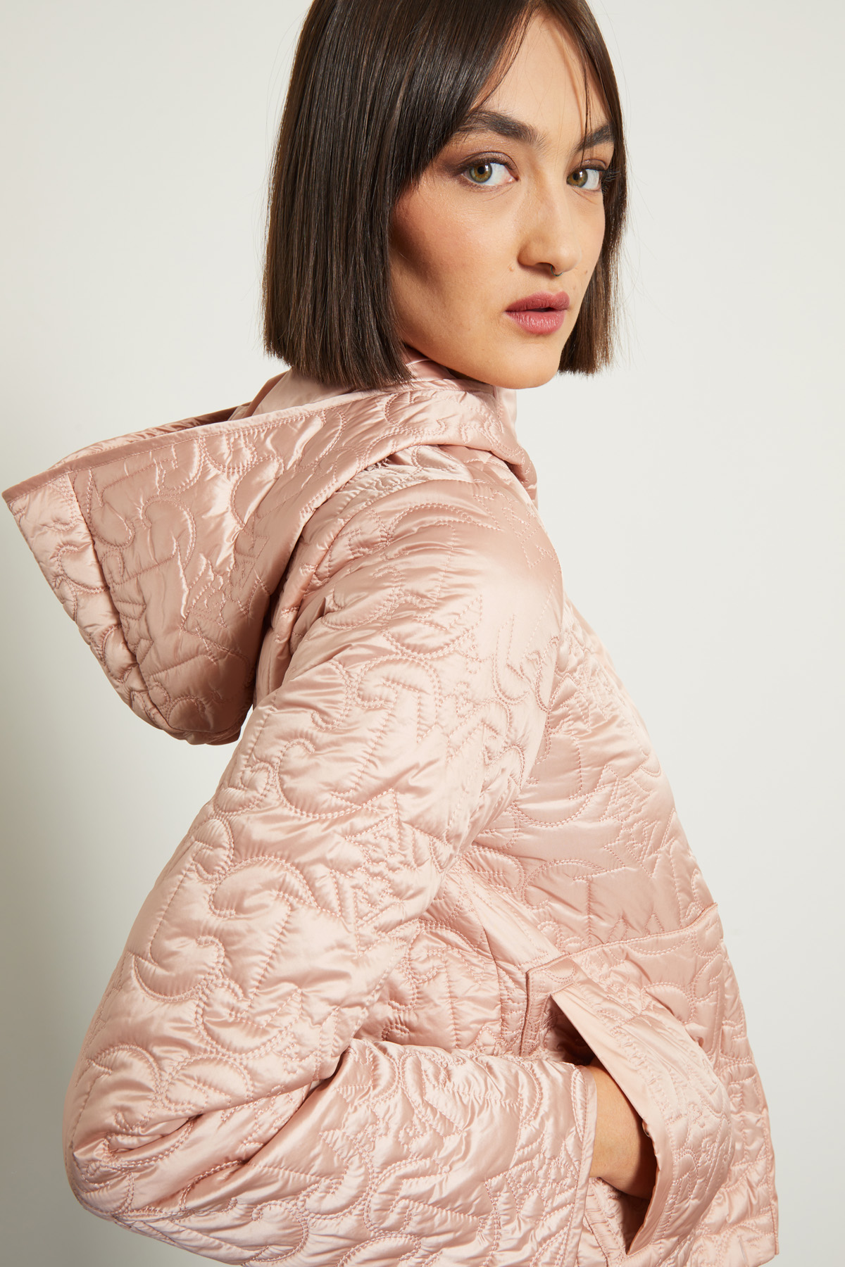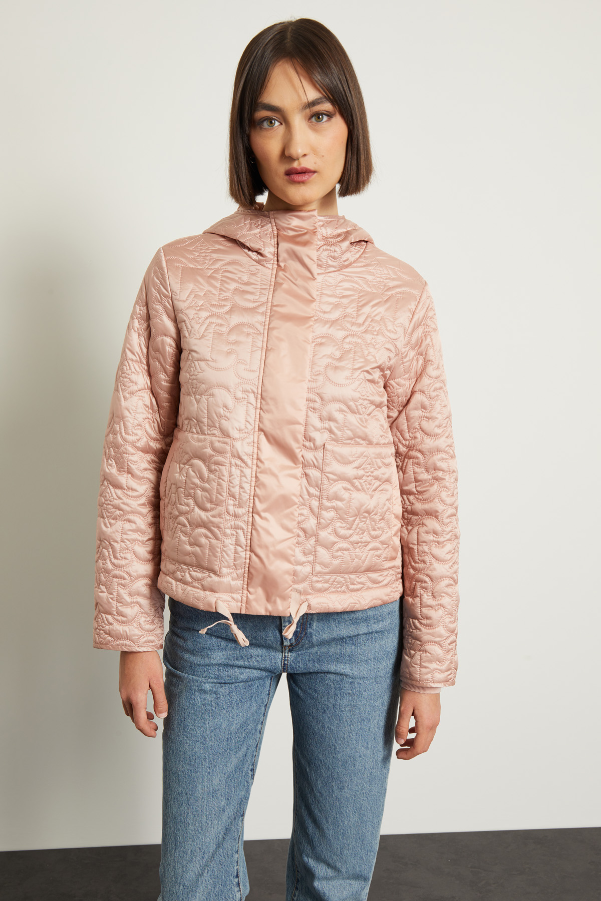 Imbottito dalla linea dritta realizzato in tessuto tecnico antigoccia trapuntato, collo alto con capuccio e maniche lunghe, tasche a filetto applicate e inserto di coulisse a fondo capo. Allacciatura tramite zip e bottoni a pressione.