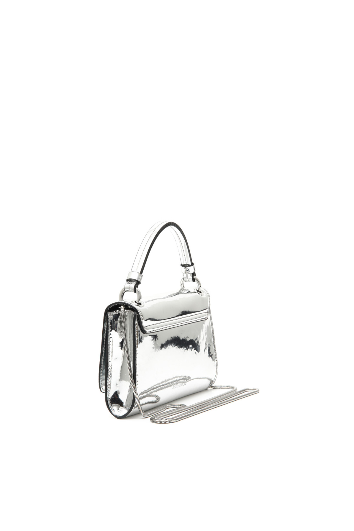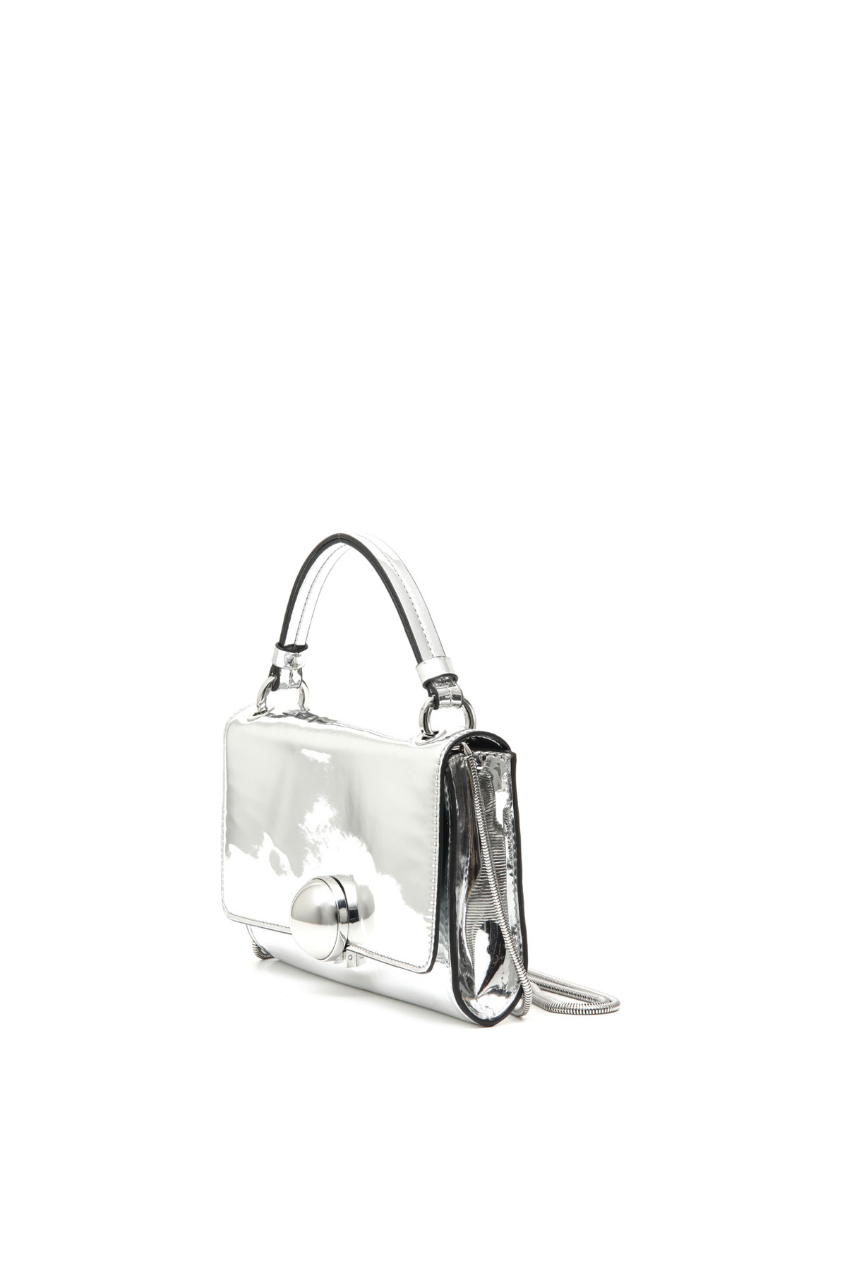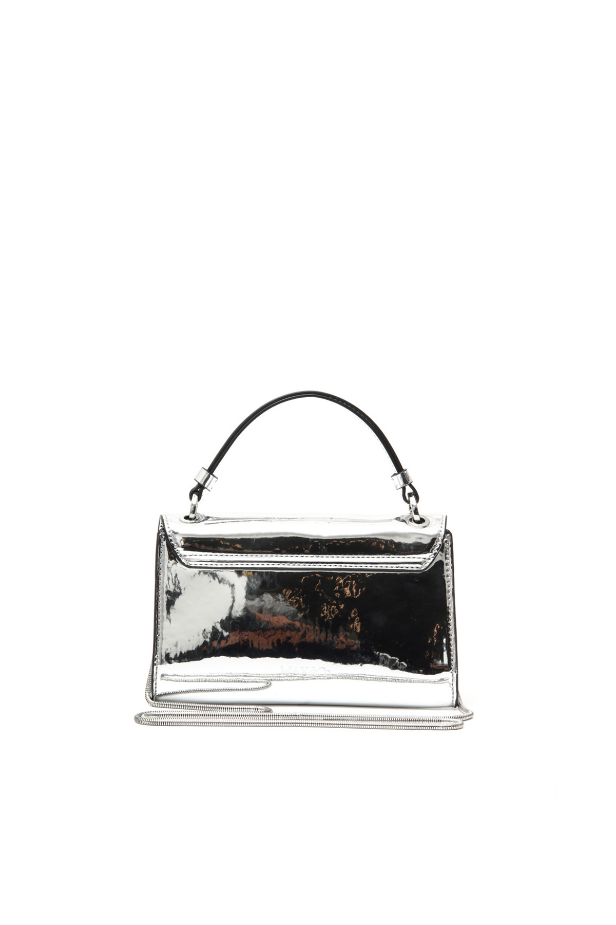 Pochette realizzata in similpelle effetto vernice, con manico singolo e tracolla a catena. Chiusura ad incastro con sfera metallica.