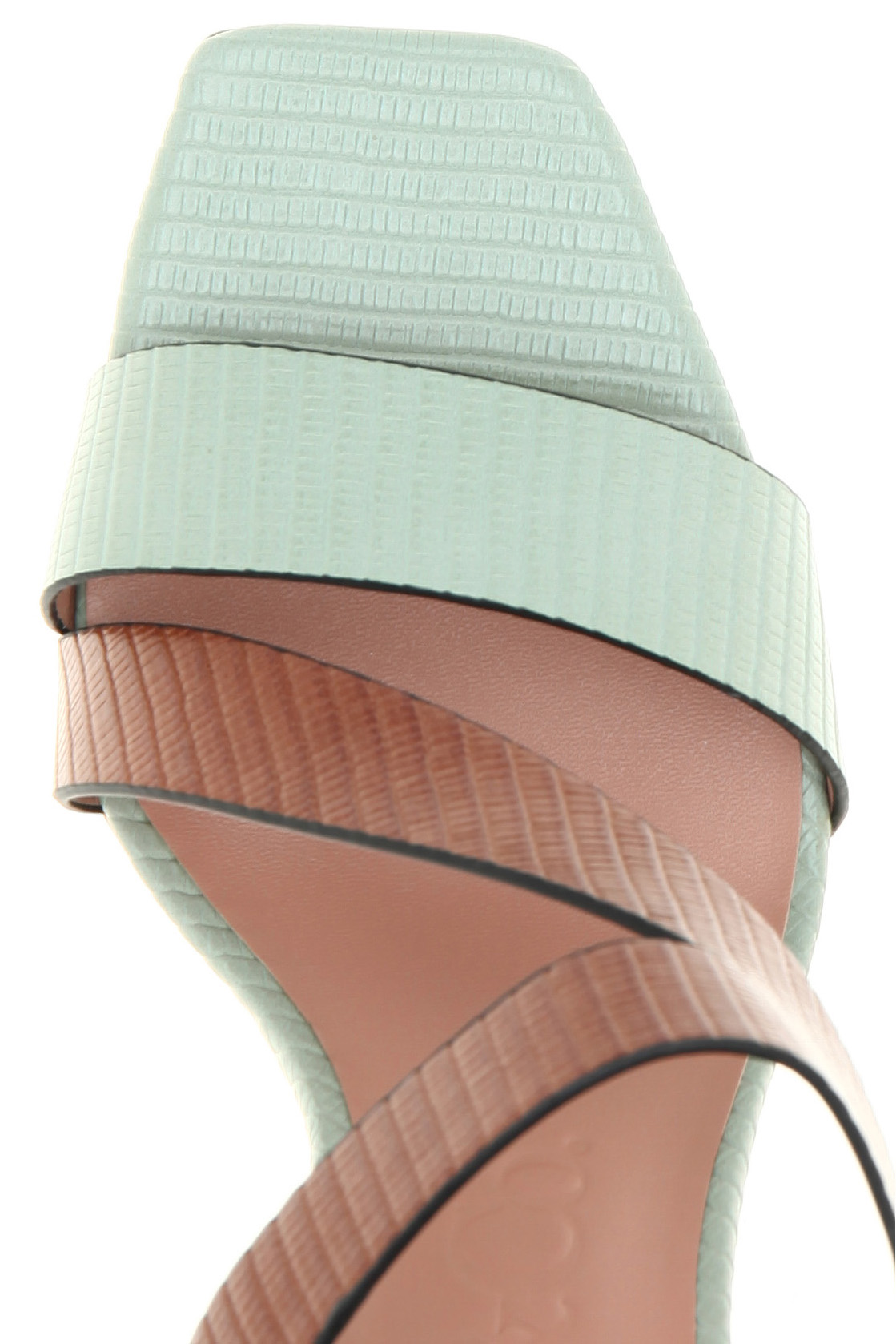 Sandali realizzati in similpelle stampa rettile, con punta squadratura, tacco a trapezio, e chiusura con cinturino alla caviglia. Suola in cuoio.