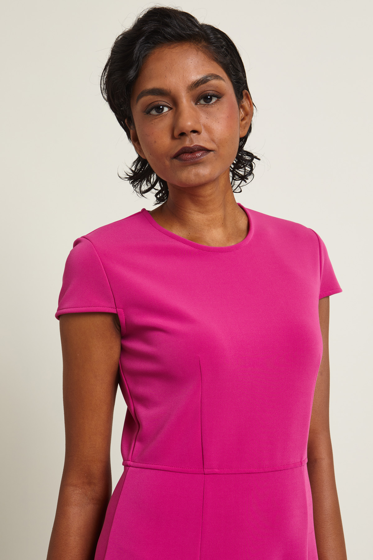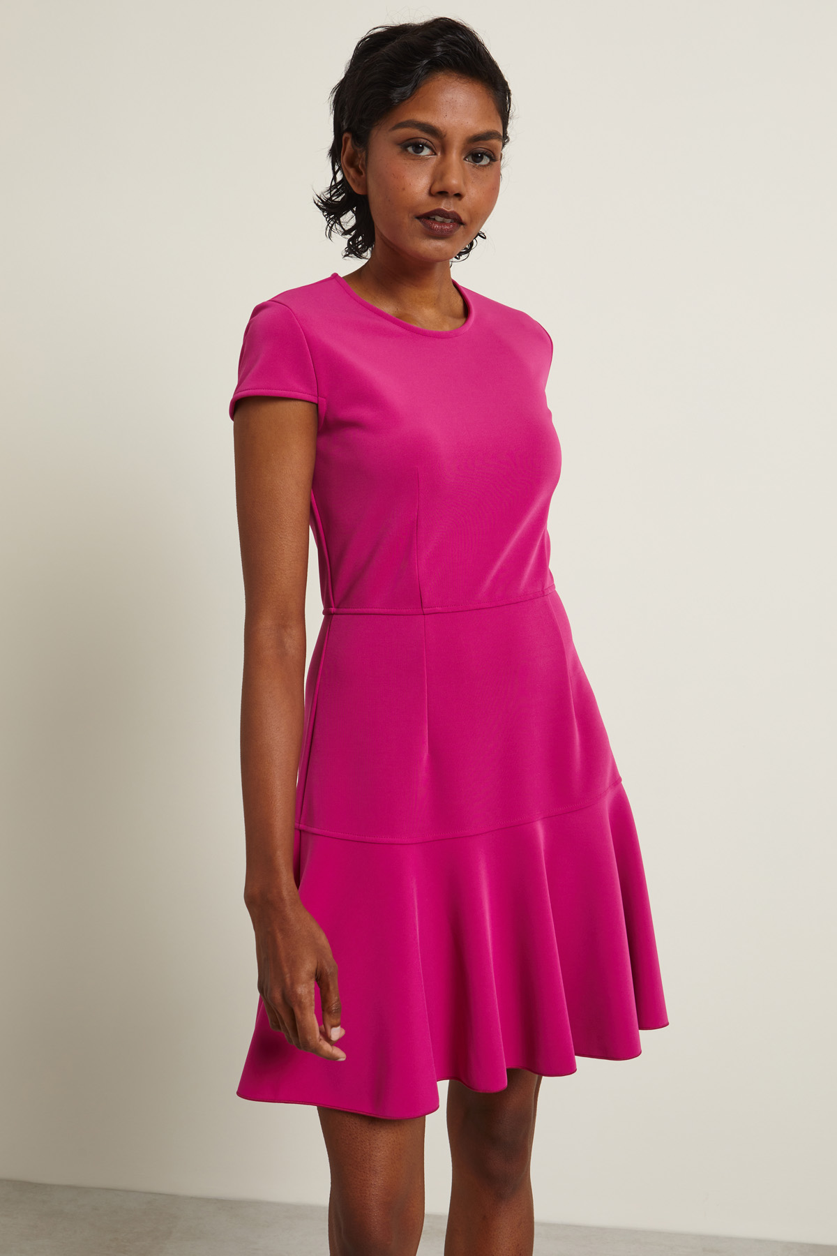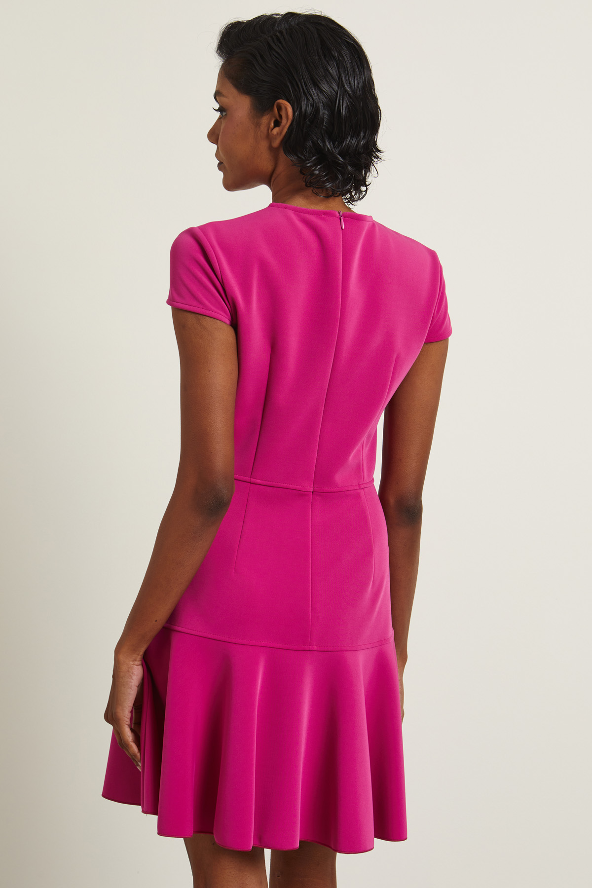 Abito dalla linea semiaderente realizzato in jersey tecnico, con scollo a giro, maniche corte e balza al fondo. Allacciatura tramite zip invisibile nel retro. Capo semifoderato.