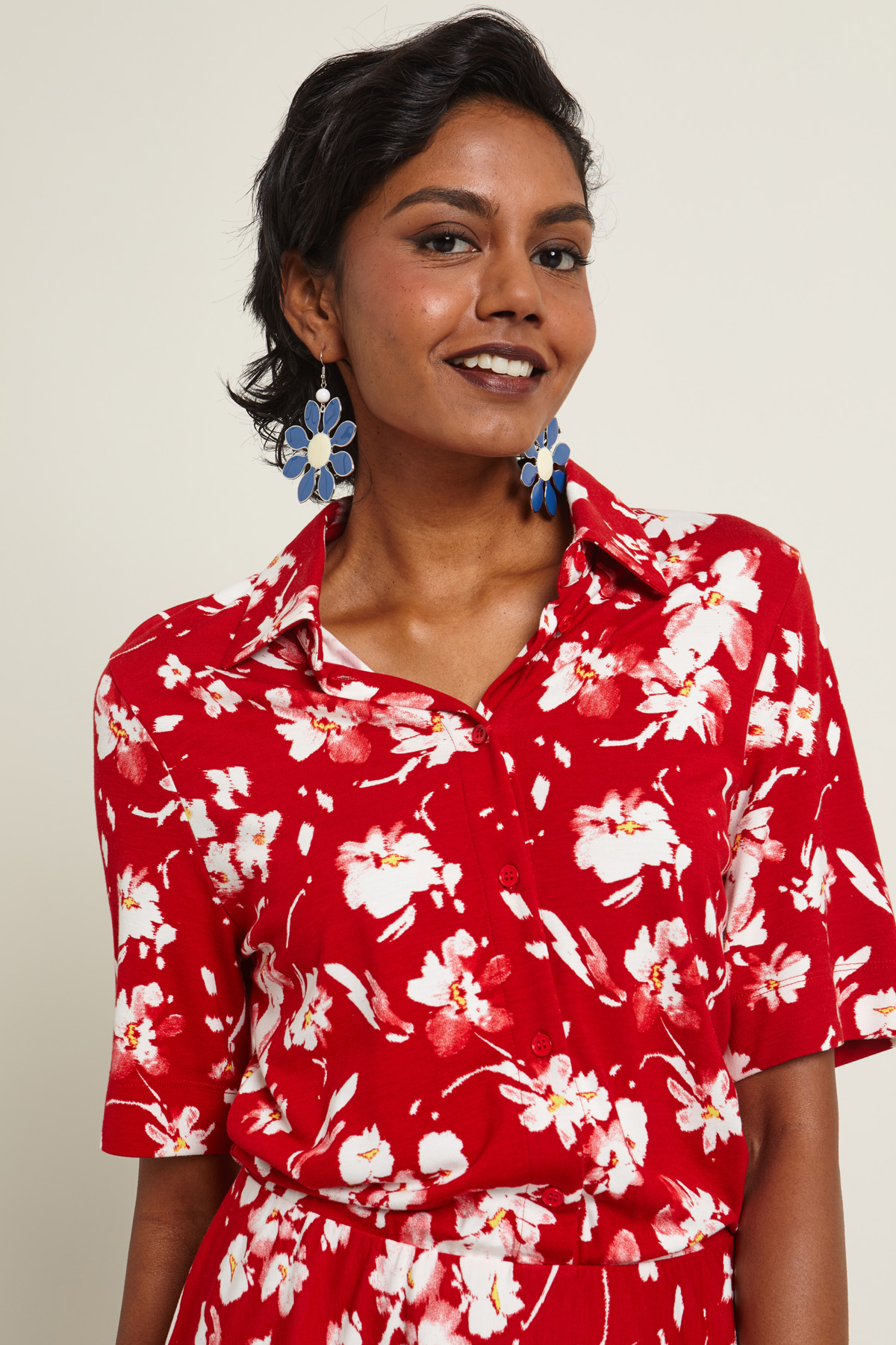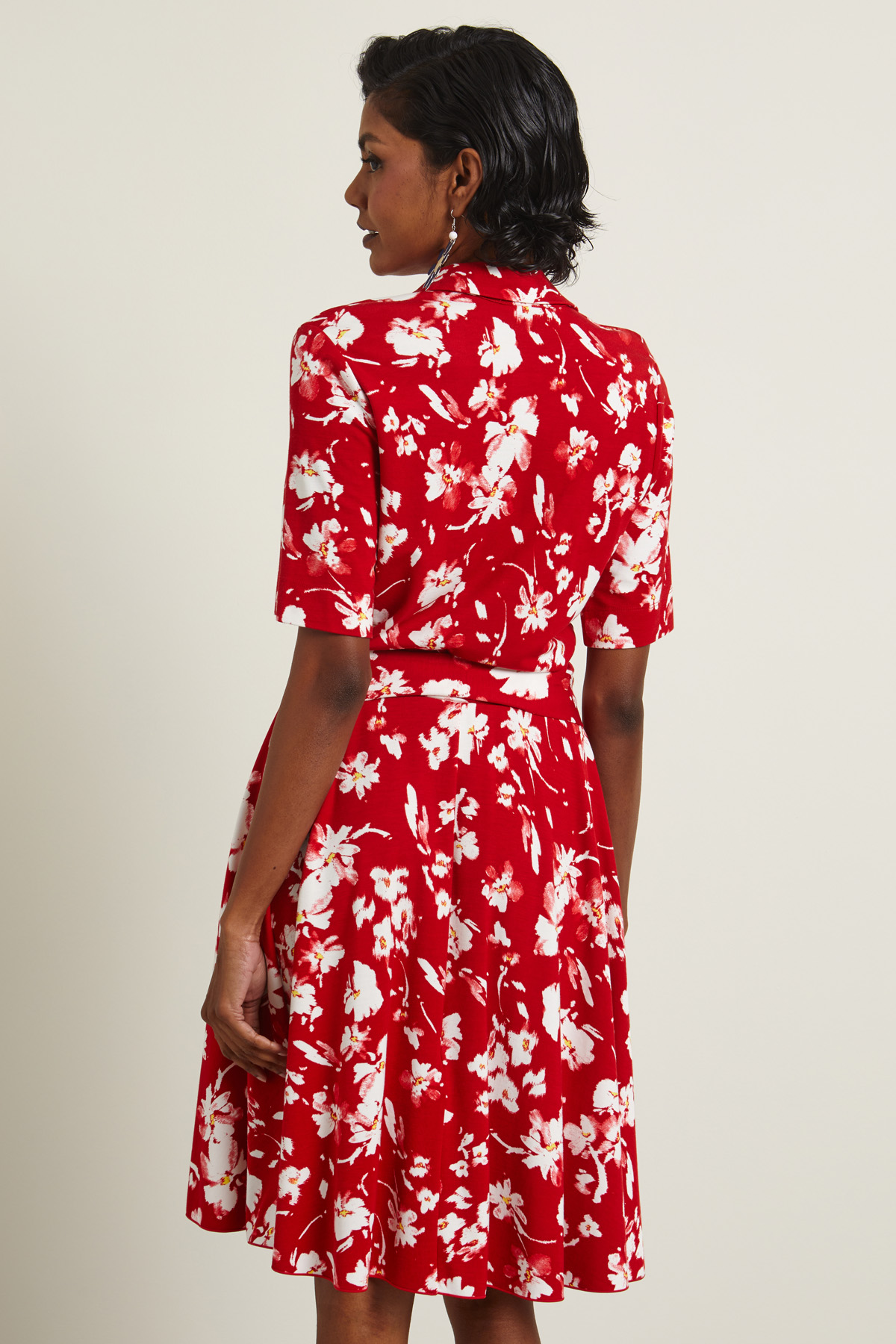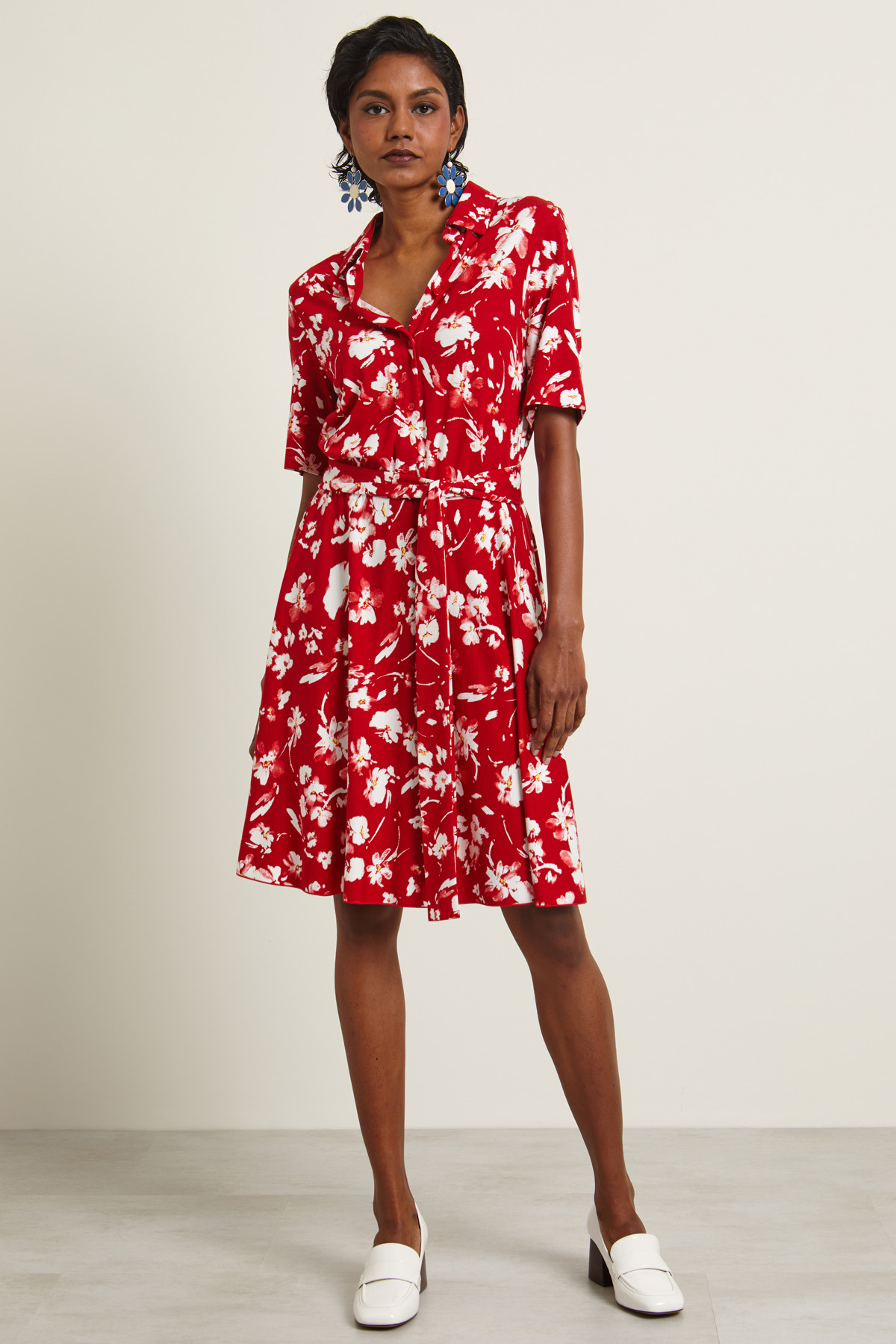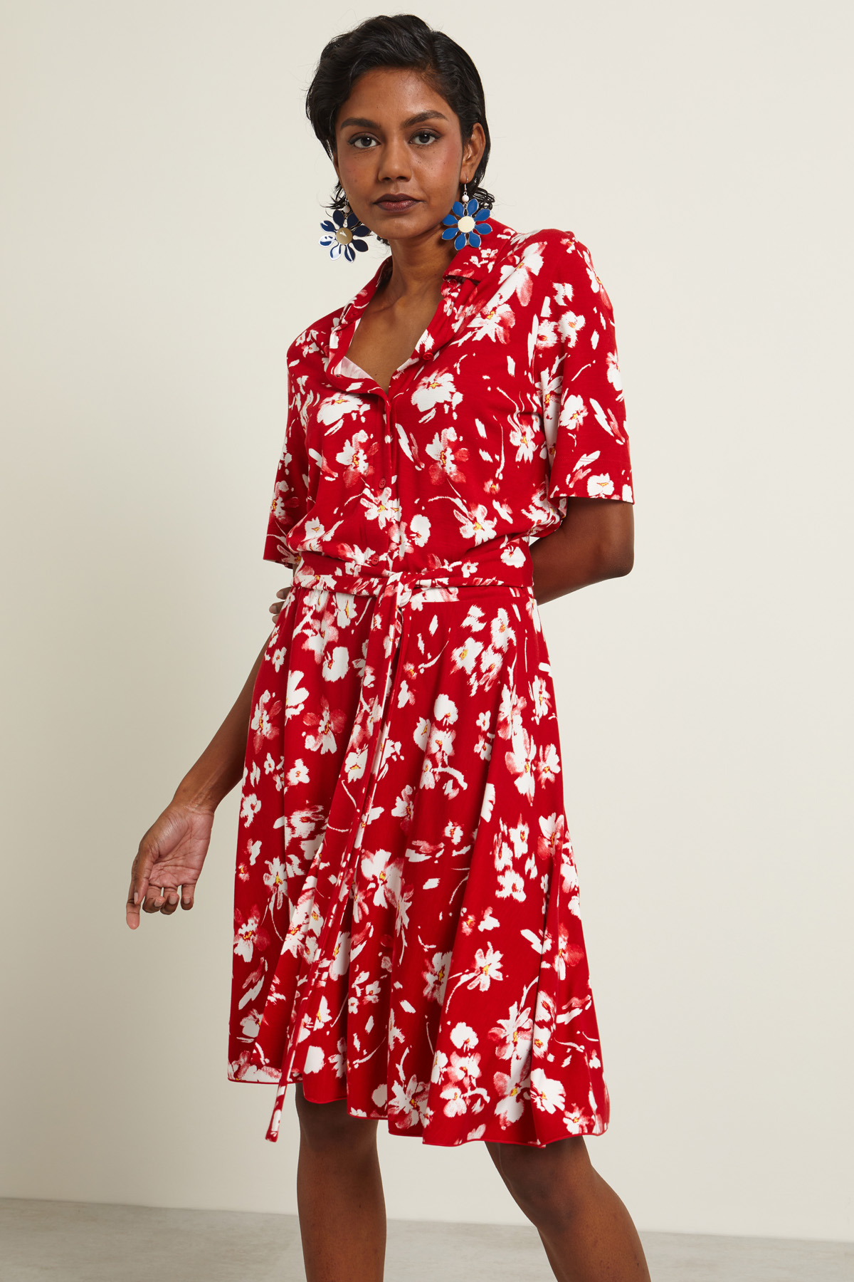 Abito chemisier realizzato in jersey stampato con colletto a camicia, maniche corte e inserto elastico in vita. Allacciatura tramite bottoni a vista e cintura coordinata. Capo sfoderato.