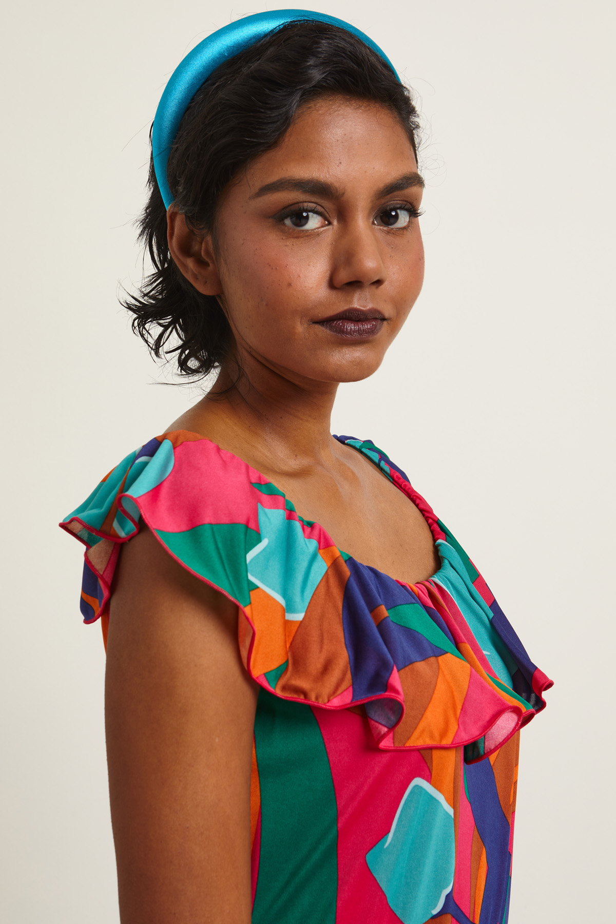 Abito dalla linea fluida realizzato in jersey stampato con motivo a balze, scollo ampio con inserto elastico e maniche ad aletta. Capo foderato.