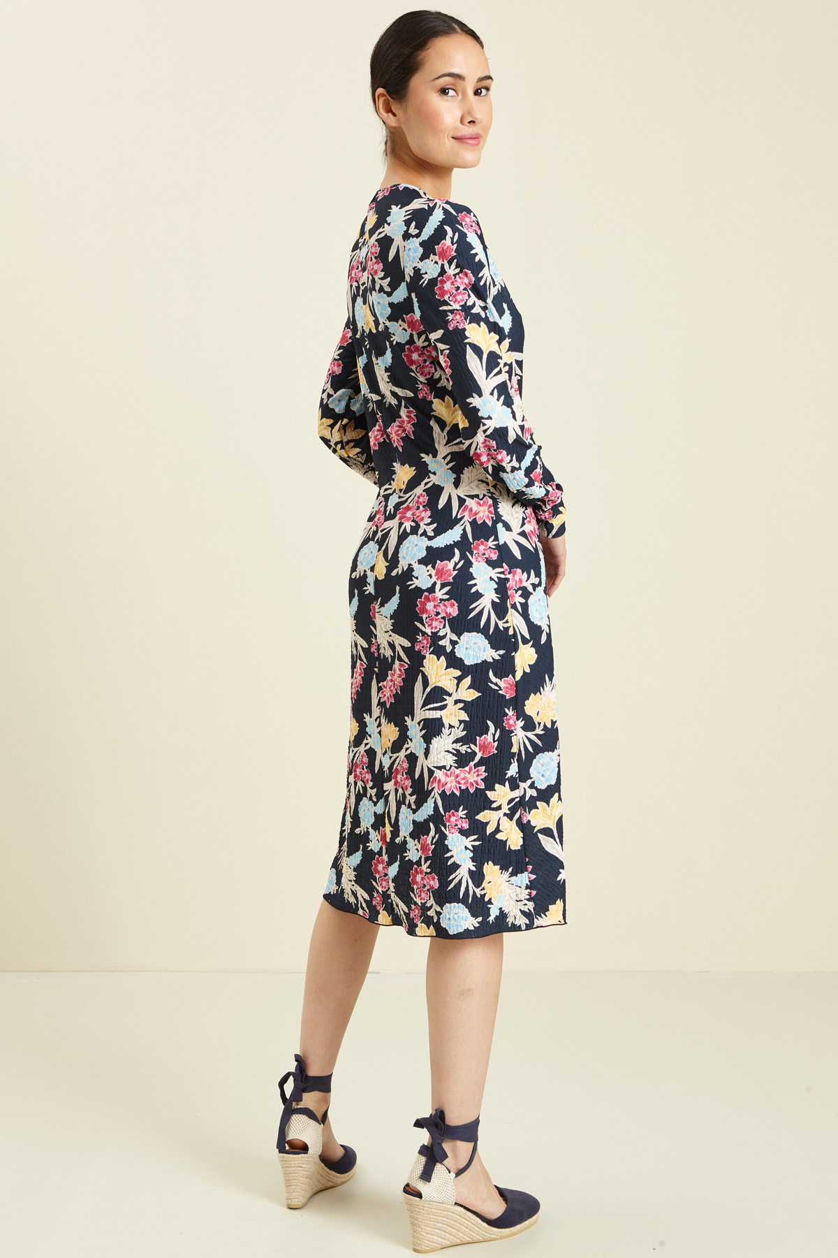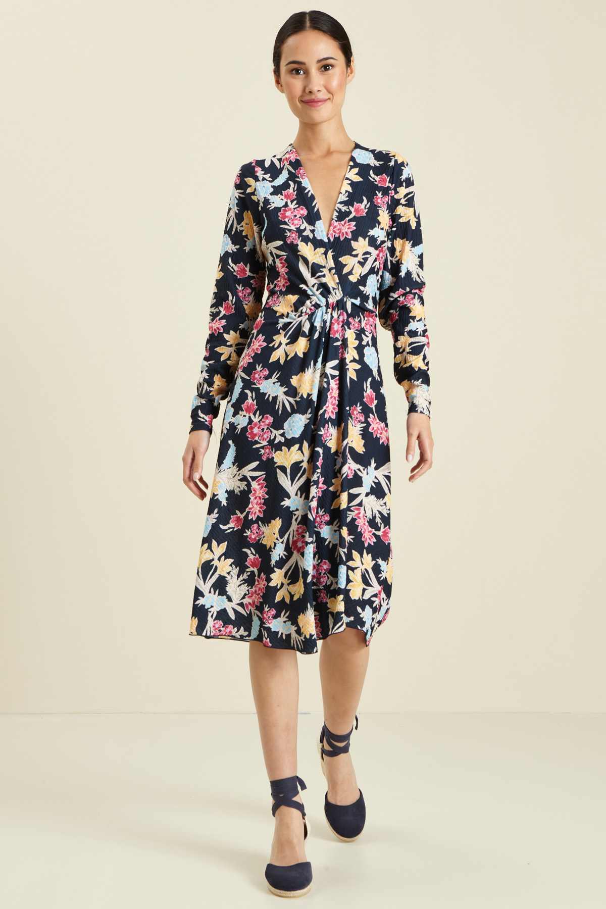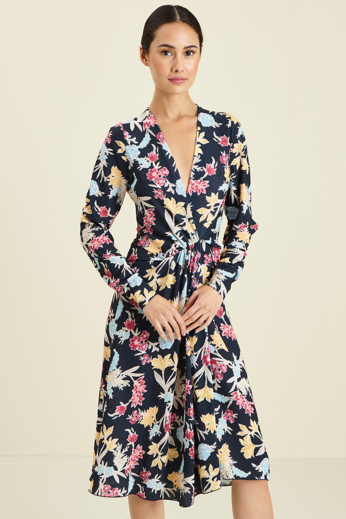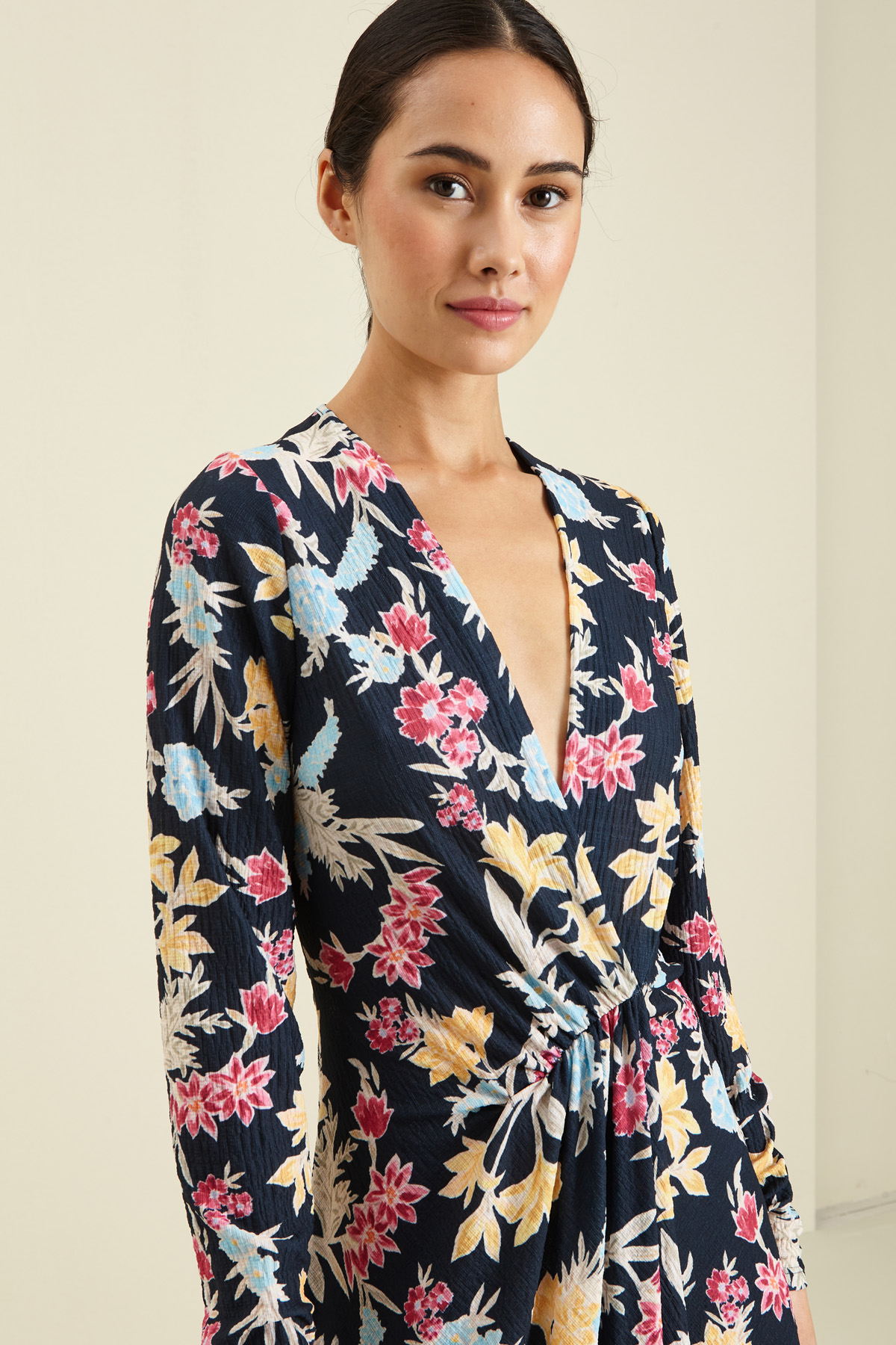 Abito a finto portafoglio realizzato in jersey stretch, con scollo a V incrociato, taglio in vita, arriccio e finto sormonto nel centro davanti.