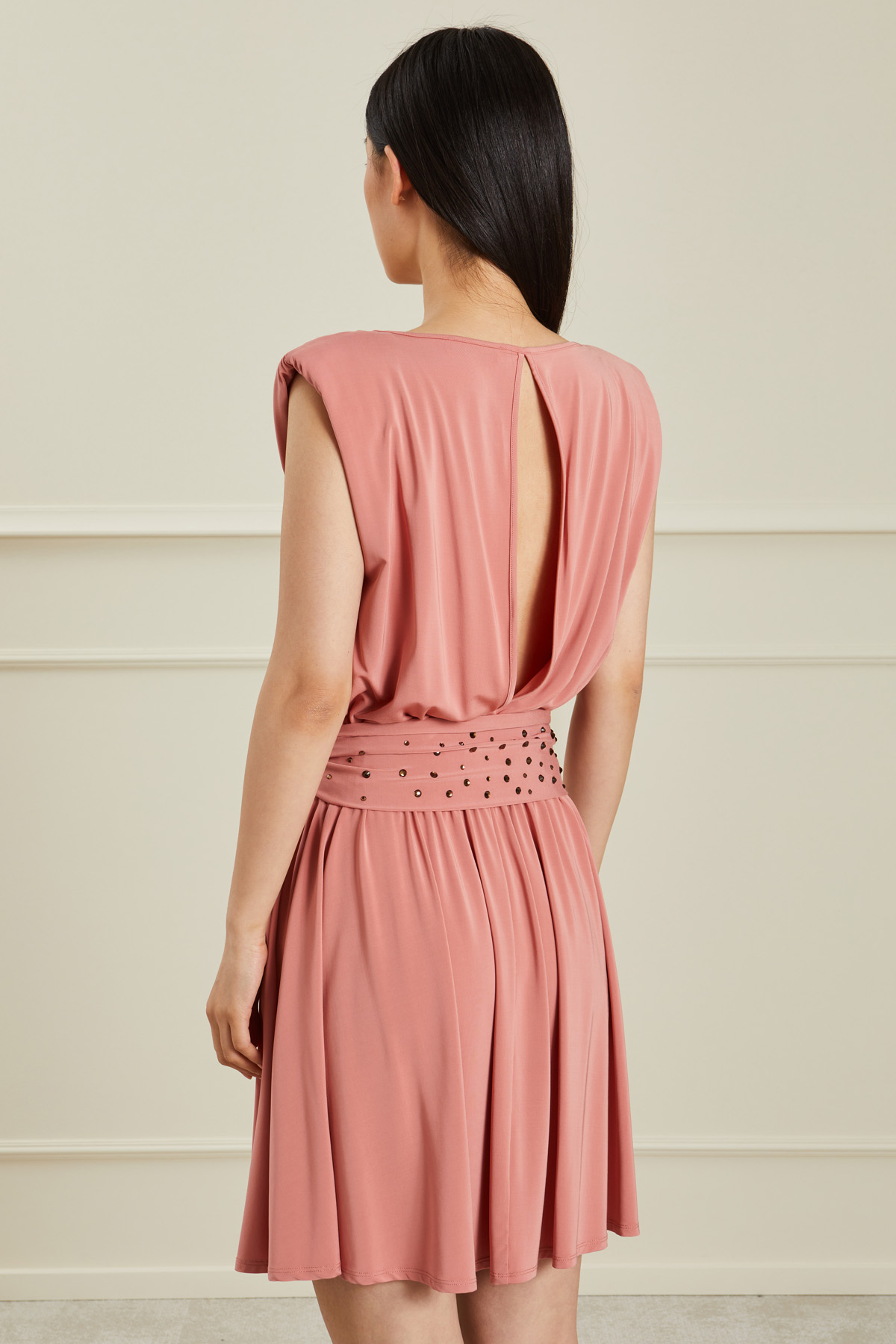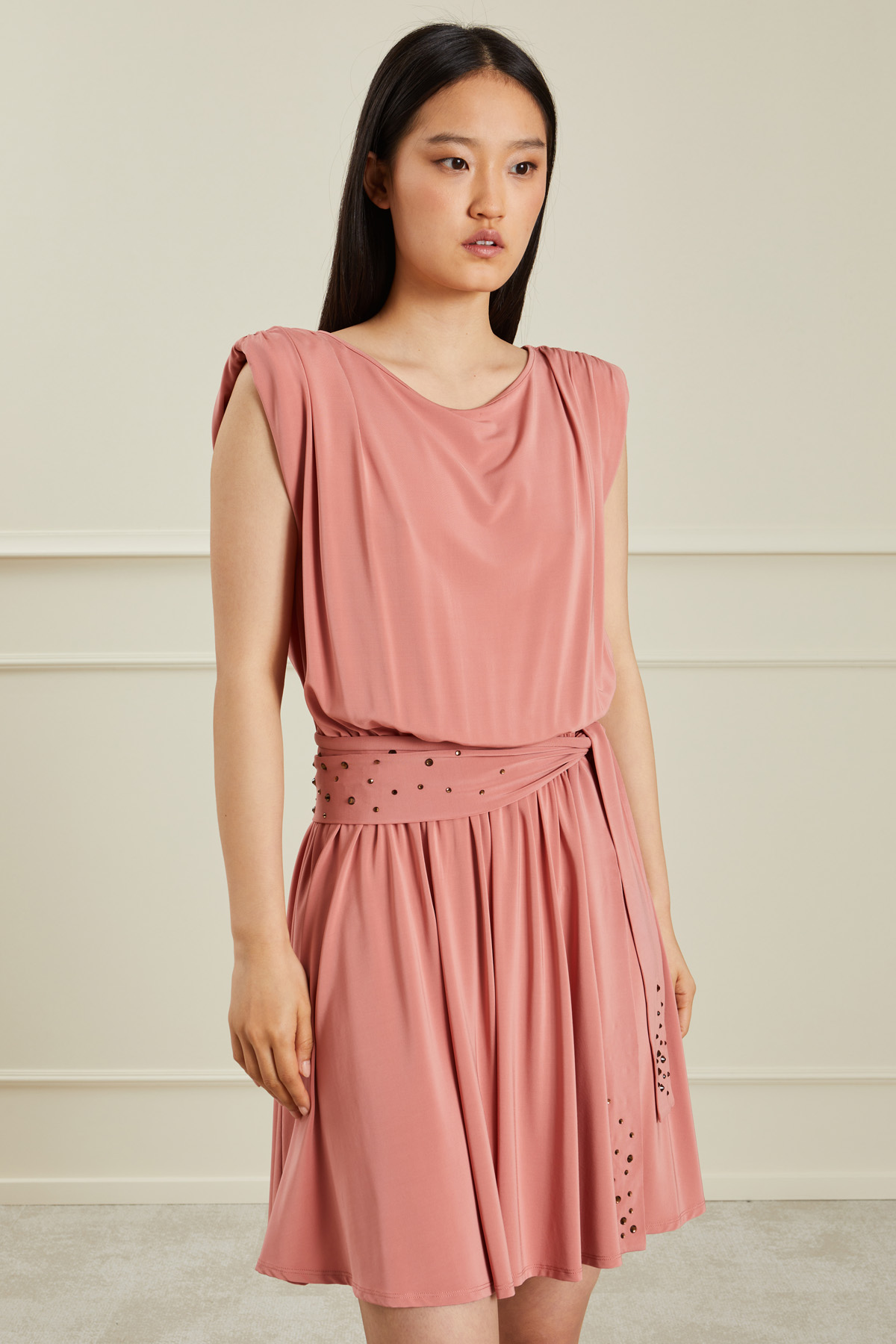 Abito corto dalla linea fluida realizzato in jersey di viscosa stretch, con scollo rotondo, maniche ad aletta con motivo arricciato e drappeggio, inserto elastico in vita e maxi apertura a goccia nel retro. Capo dotato di fusciacca in abbinamento.