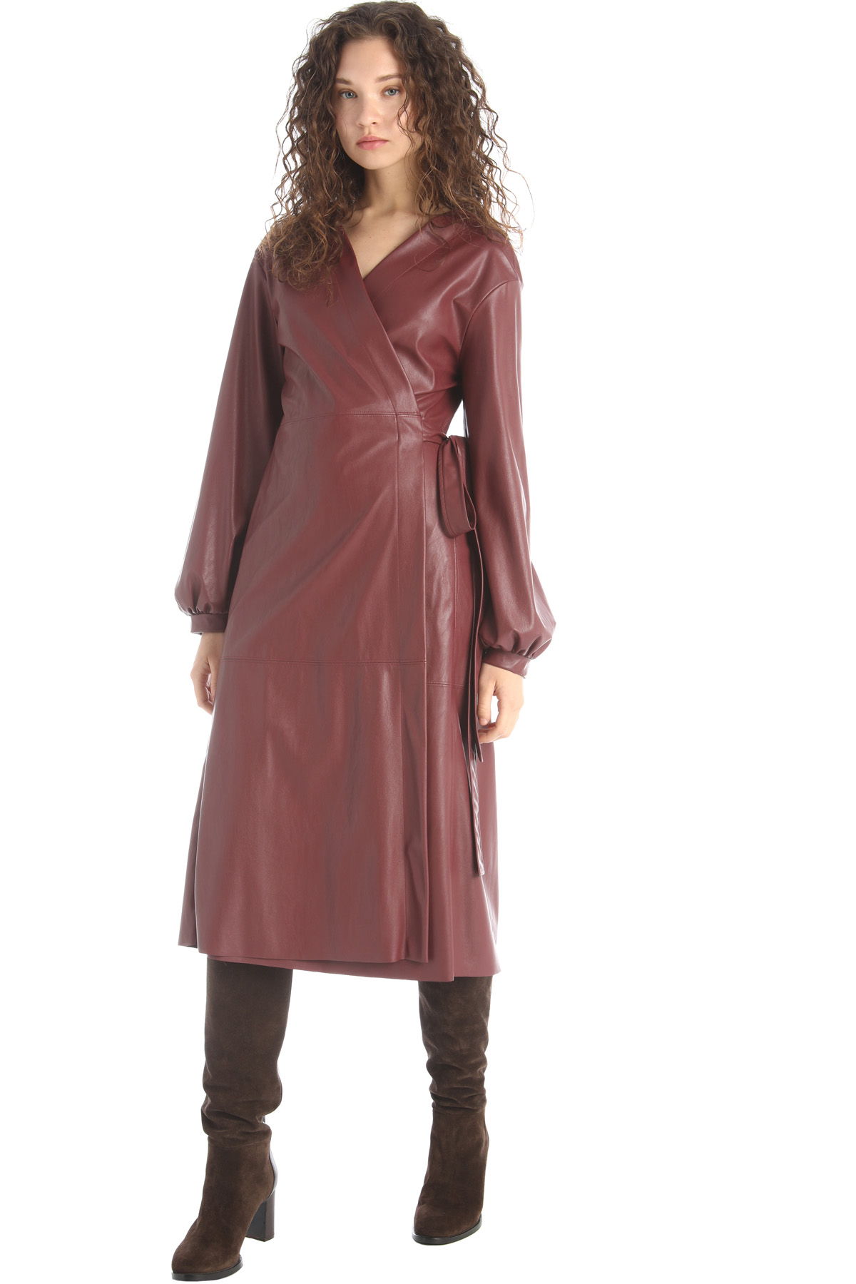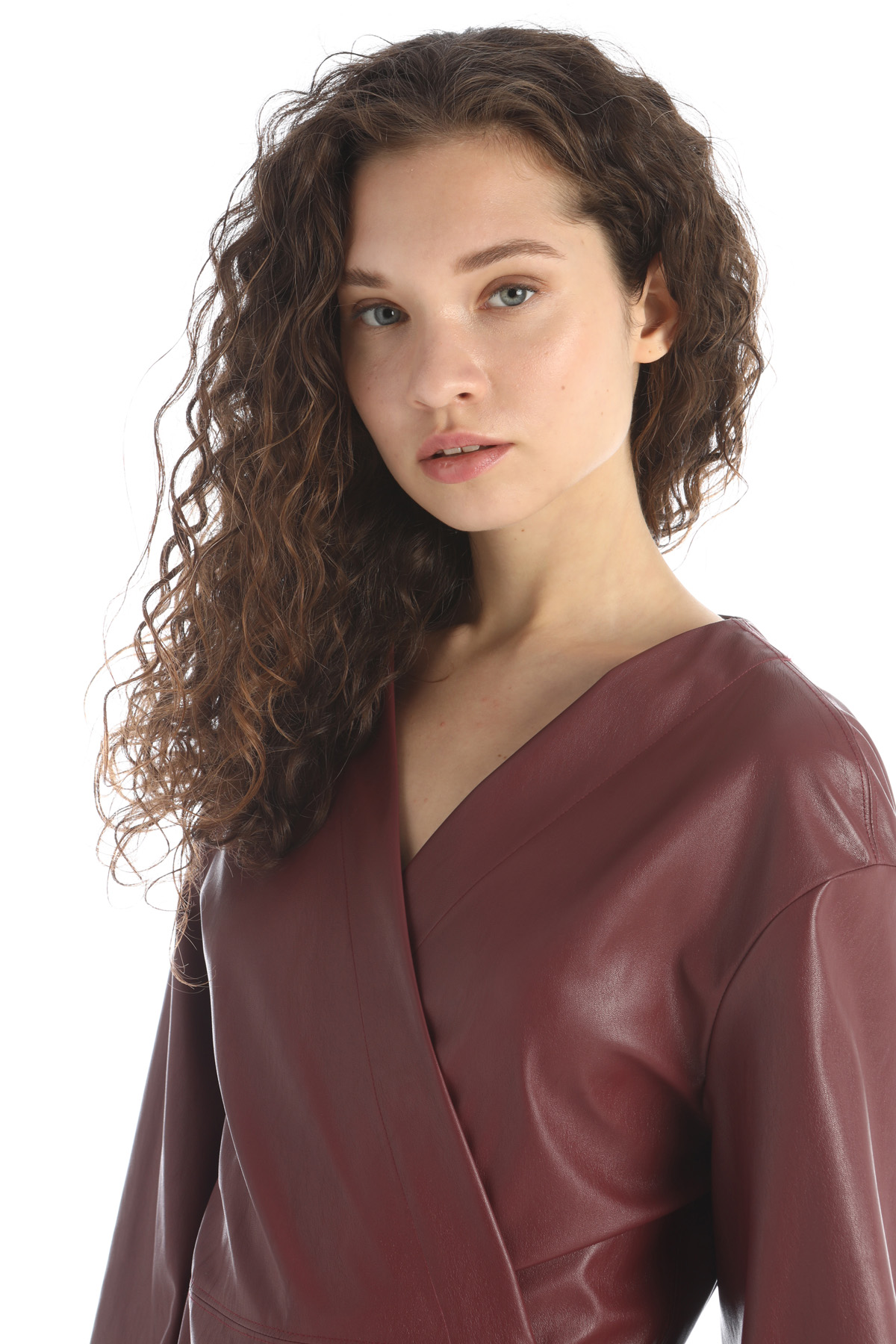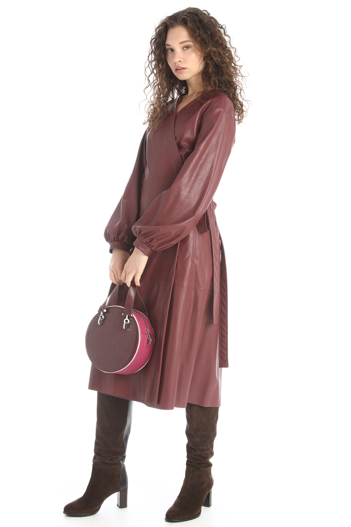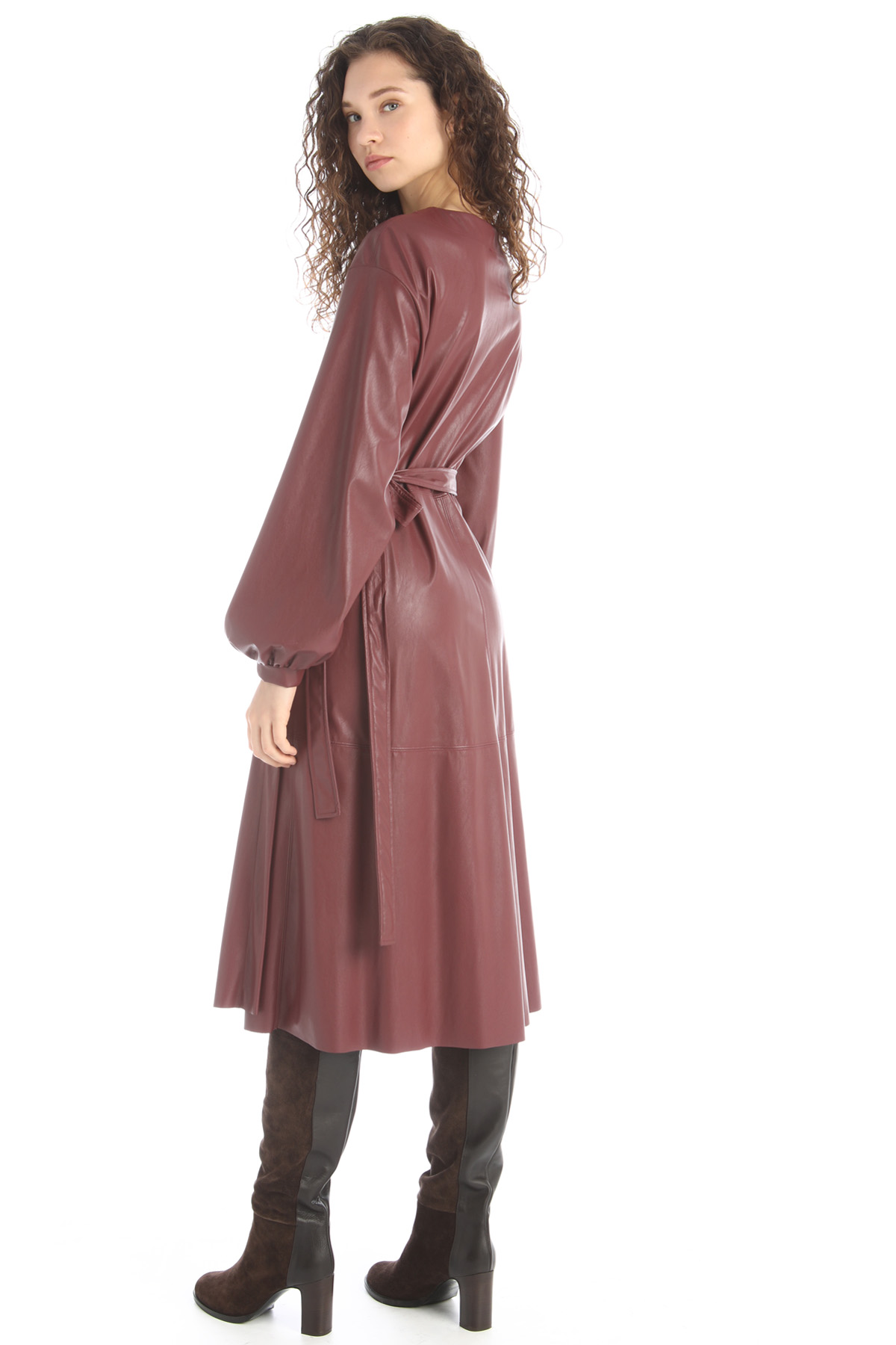 Abito a portafoglio dalla linea svasata realizzata in jersey spalmato effetto pelle, con scollo a V, maniche lunghe arricciate al fondo, tasche laterali inserite in cucitura e allacciatura tramite cintura coordinata.
