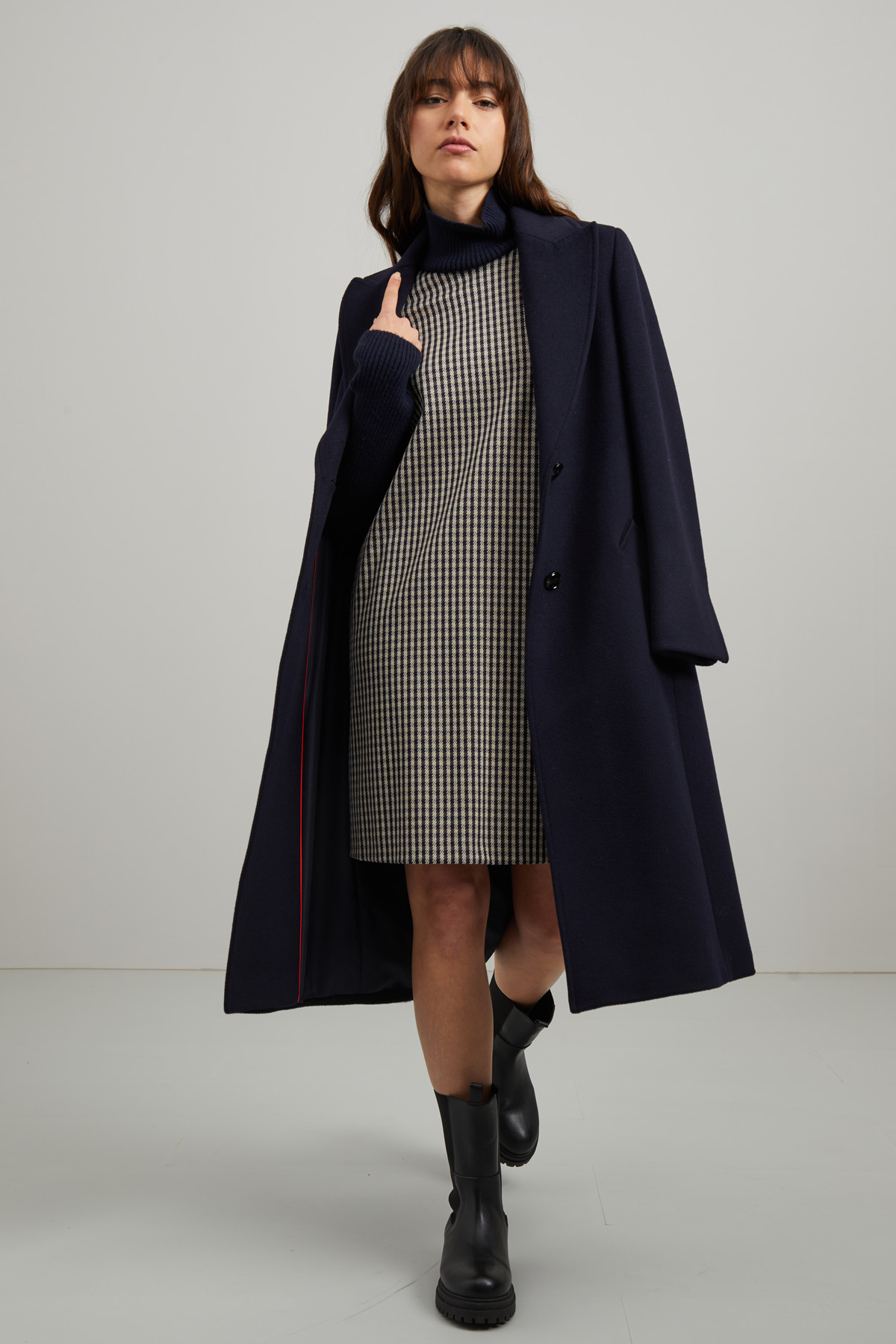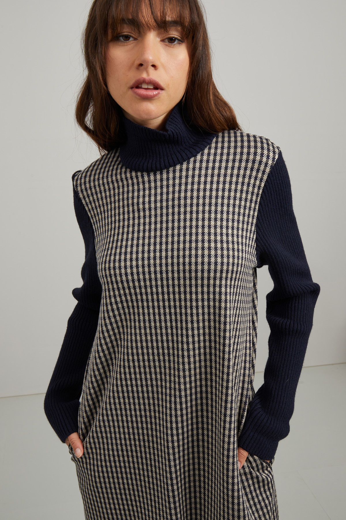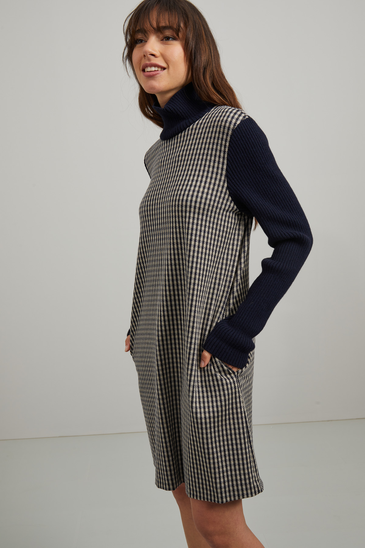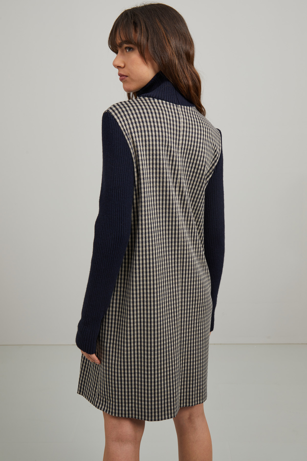 Abito corto dalla linea dritta realizzato in jersey di misto viscosa stretch tinto filo, con inserti in maglia, collo alto, maniche lunghe e tasche laterali inserite in cucitura.