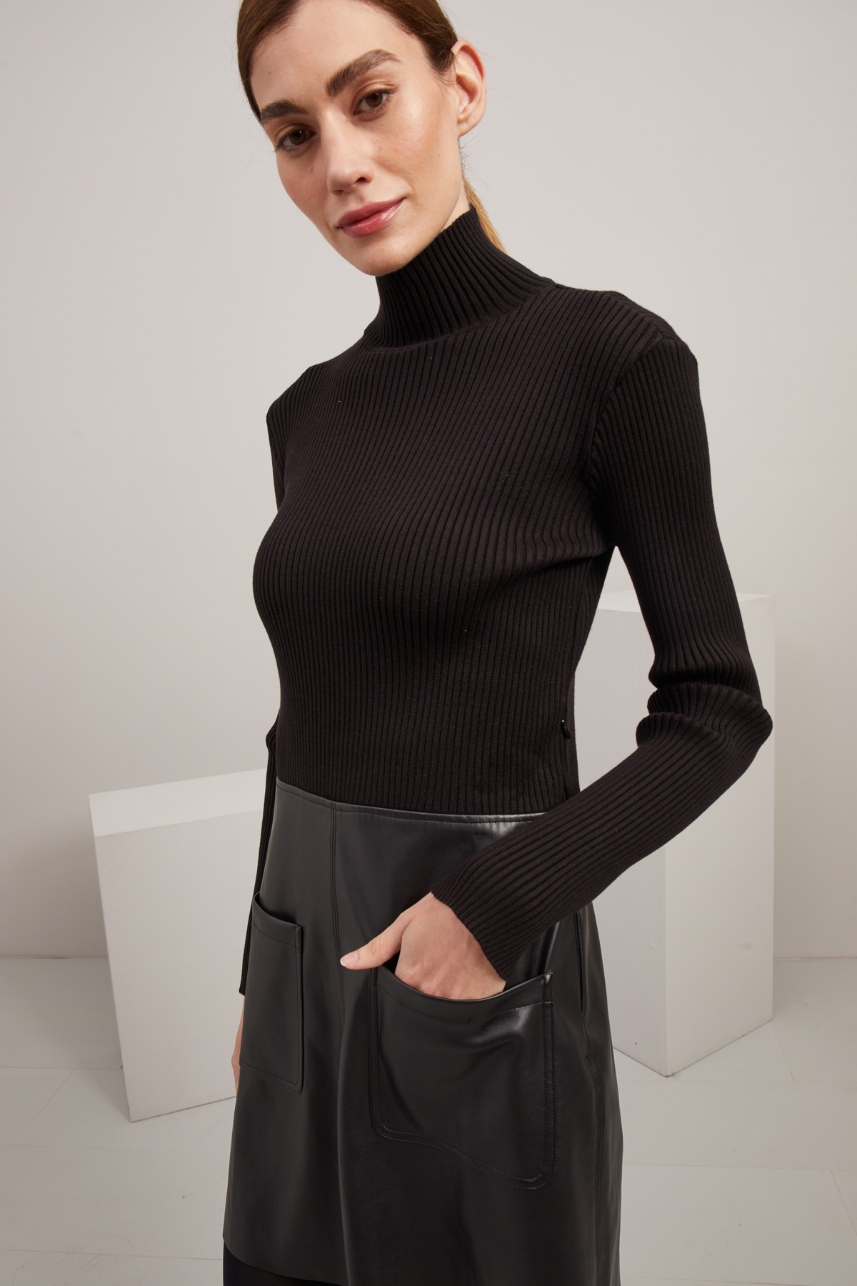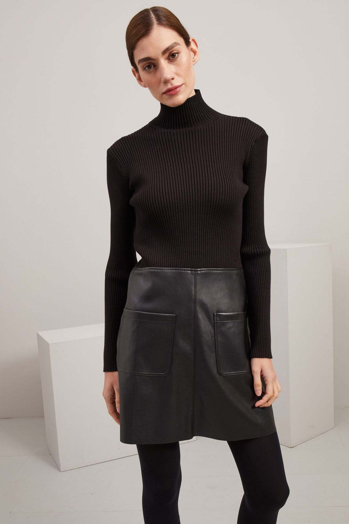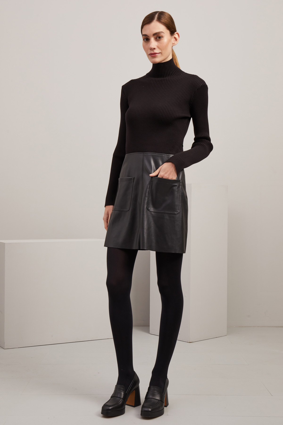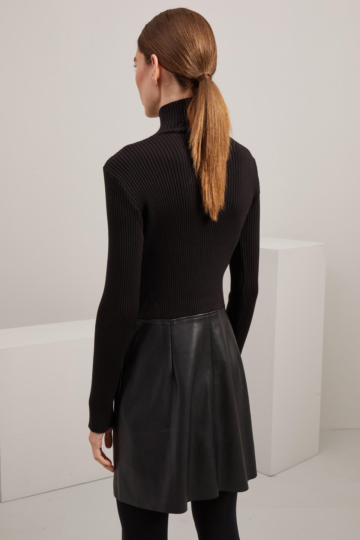 Abito corto dalla linea dritta realizzato in maglia di misto viscosa con inserto di jersey spalmato similpelle. Il modello ha collo a cratere, maniche lunghe, profili rifiniti a coste e tasche inserite.