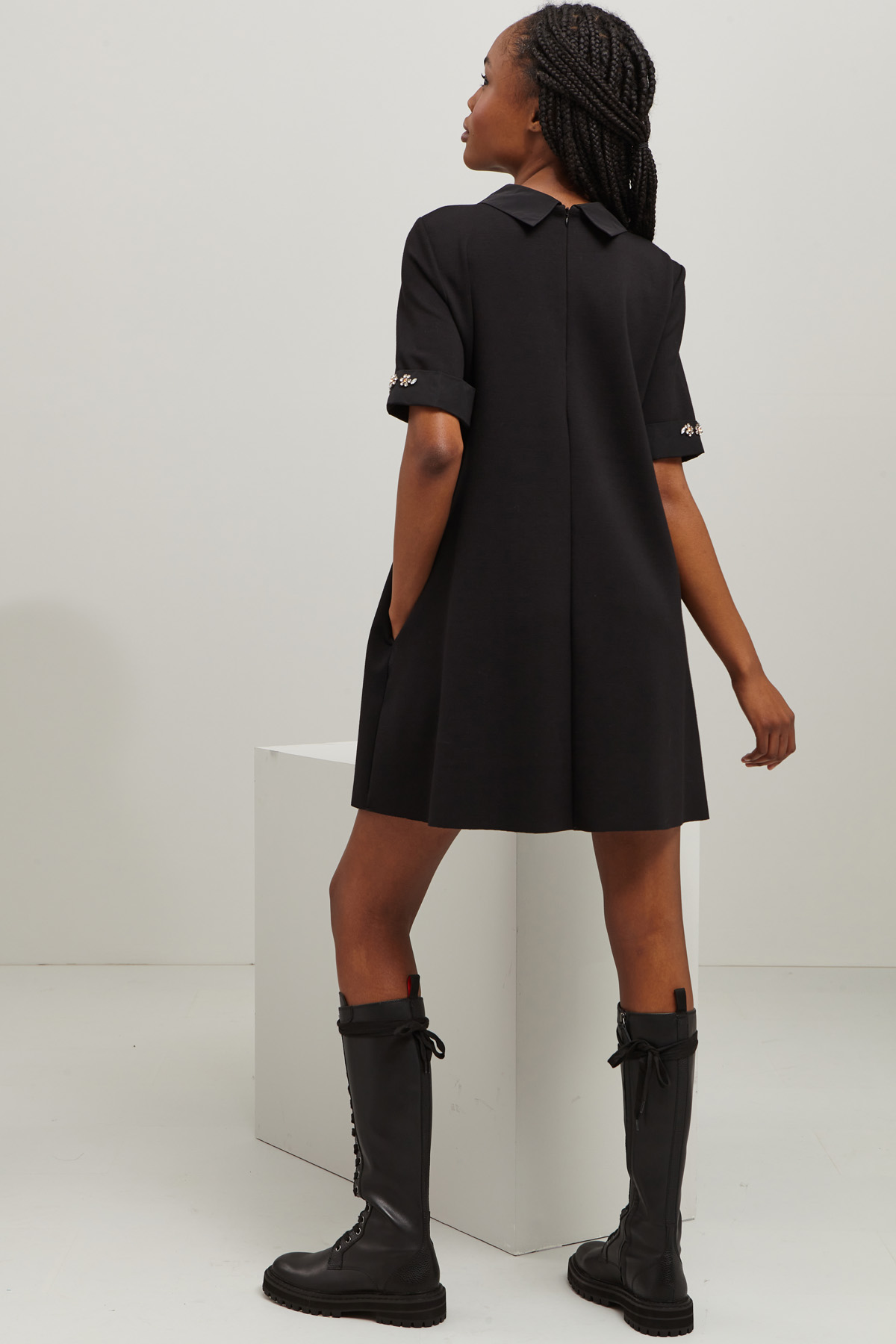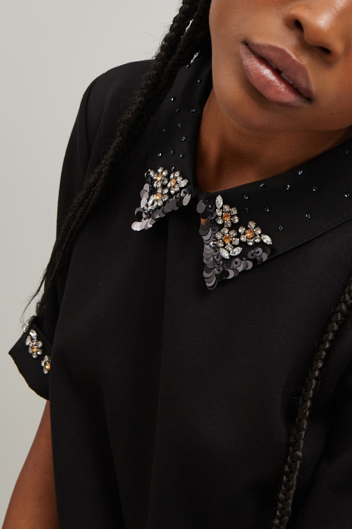 Abito dalla linea a trapezio realizzato in jersey compatto di viscosa stretch con inserti in taffetà maxi strass e pailettes ricamate, collo a camicia, maniche corte e allacciatura tramite cerniera invisibile nel retro.
